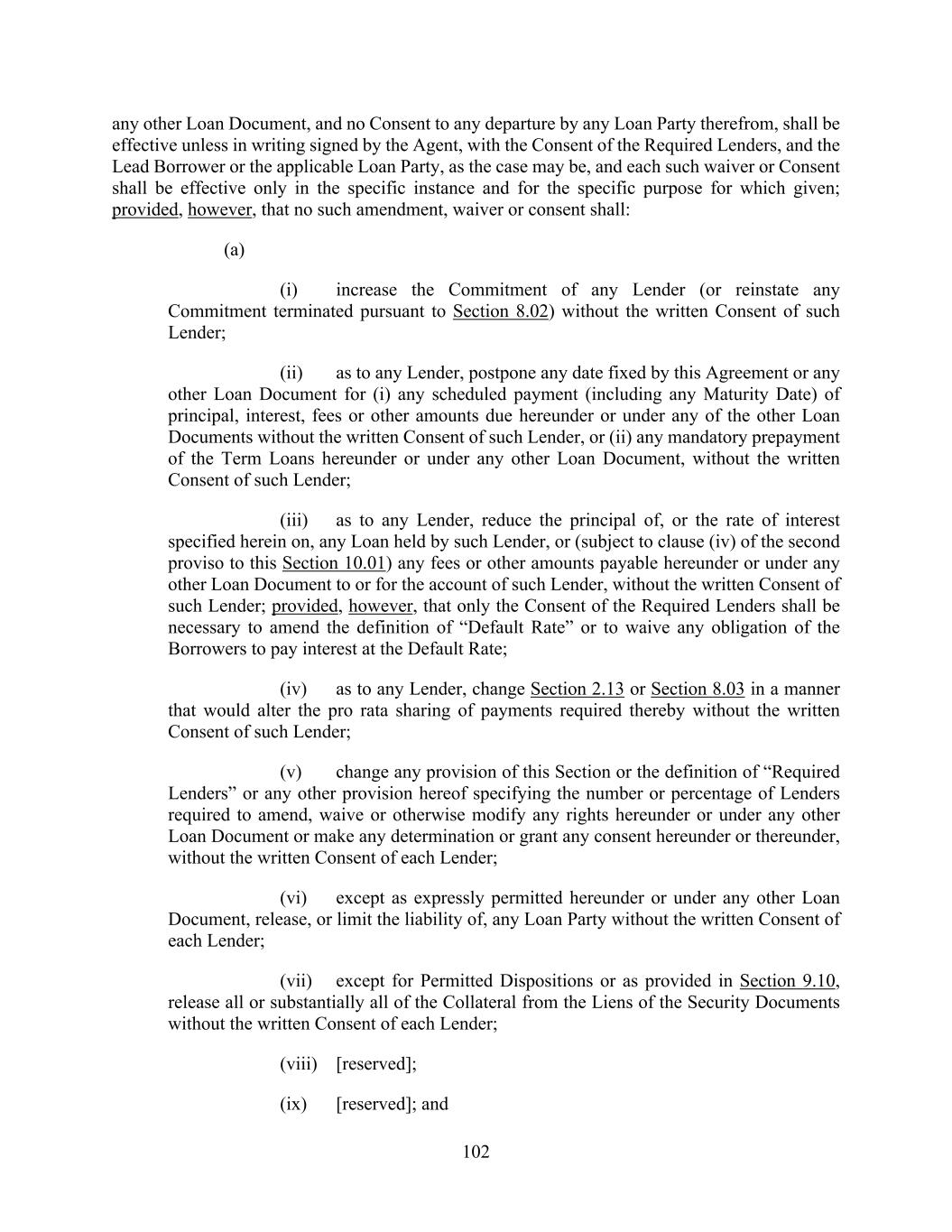 102 any other Loan Document, and no Consent to any departure by any Loan Party therefrom, shall be effective unless in writing signed by the Agent, with the Consent of the Required Lenders, and the Lead Borrower or the applicable Loan Party, as the case may be, and each such waiver or Consent shall be effective only in the specific instance and for the specific purpose for which given; provided, however, that no such amendment, waiver or consent shall: (a) (i) increase the Commitment of any Lender (or reinstate any Commitment terminated pursuant to Section 8.02) without the written Consent of such Lender; (ii) as to any Lender, postpone any date fixed by this Agreement or any other Loan Document for (i) any scheduled payment (including any Maturity Date) of principal, interest, fees or other amounts due hereunder or under any of the other Loan Documents without the written Consent of such Lender, or (ii) any mandatory prepayment of the Term Loans hereunder or under any other Loan Document, without the written Consent of such Lender; (iii) as to any Lender, reduce the principal of, or the rate of interest specified herein on, any Loan held by such Lender, or (subject to clause (iv) of the second proviso to this Section 10.01) any fees or other amounts payable hereunder or under any other Loan Document to or for the account of such Lender, without the written Consent of such Lender; provided, however, that only the Consent of the Required Lenders shall be necessary to amend the definition of “Default Rate” or to waive any obligation of the Borrowers to pay interest at the Default Rate; (iv) as to any Lender, change Section 2.13 or Section 8.03 in a manner that would alter the pro rata sharing of payments required thereby without the written Consent of such Lender; (v) change any provision of this Section or the definition of “Required Lenders” or any other provision hereof specifying the number or percentage of Lenders required to amend, waive or otherwise modify any rights hereunder or under any other Loan Document or make any determination or grant any consent hereunder or thereunder, without the written Consent of each Lender; (vi) except as expressly permitted hereunder or under any other Loan Document, release, or limit the liability of, any Loan Party without the written Consent of each Lender; (vii) except for Permitted Dispositions or as provided in Section 9.10, release all or substantially all of the Collateral from the Liens of the Security Documents without the written Consent of each Lender; (viii) [reserved]; (ix) [reserved]; and
