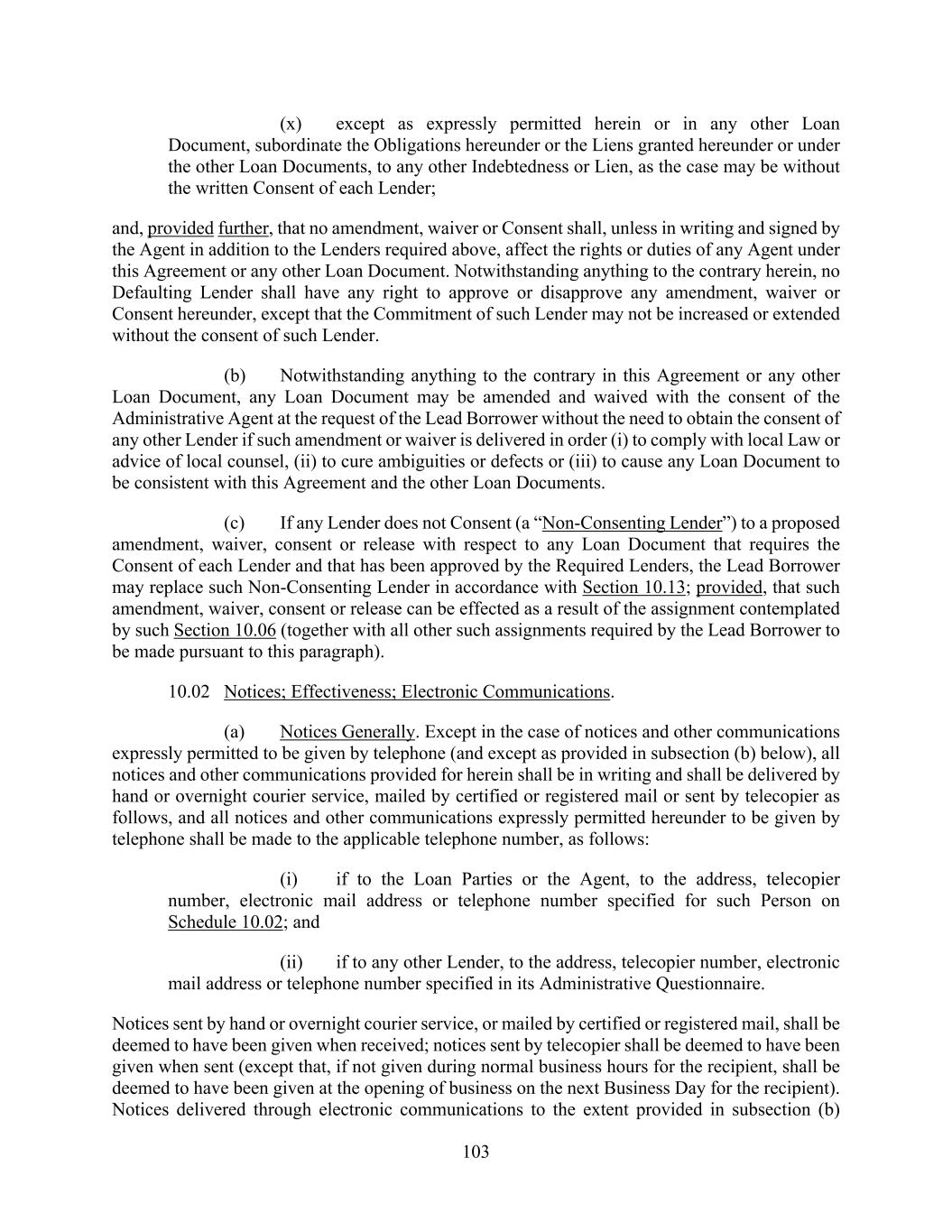 103 (x) except as expressly permitted herein or in any other Loan Document, subordinate the Obligations hereunder or the Liens granted hereunder or under the other Loan Documents, to any other Indebtedness or Lien, as the case may be without the written Consent of each Lender; and, provided further, that no amendment, waiver or Consent shall, unless in writing and signed by the Agent in addition to the Lenders required above, affect the rights or duties of any Agent under this Agreement or any other Loan Document. Notwithstanding anything to the contrary herein, no Defaulting Lender shall have any right to approve or disapprove any amendment, waiver or Consent hereunder, except that the Commitment of such Lender may not be increased or extended without the consent of such Lender. (b) Notwithstanding anything to the contrary in this Agreement or any other Loan Document, any Loan Document may be amended and waived with the consent of the Administrative Agent at the request of the Lead Borrower without the need to obtain the consent of any other Lender if such amendment or waiver is delivered in order (i) to comply with local Law or advice of local counsel, (ii) to cure ambiguities or defects or (iii) to cause any Loan Document to be consistent with this Agreement and the other Loan Documents. (c) If any Lender does not Consent (a “Non-Consenting Lender”) to a proposed amendment, waiver, consent or release with respect to any Loan Document that requires the Consent of each Lender and that has been approved by the Required Lenders, the Lead Borrower may replace such Non-Consenting Lender in accordance with Section 10.13; provided, that such amendment, waiver, consent or release can be effected as a result of the assignment contemplated by such Section 10.06 (together with all other such assignments required by the Lead Borrower to be made pursuant to this paragraph). 10.02 Notices; Effectiveness; Electronic Communications. (a) Notices Generally. Except in the case of notices and other communications expressly permitted to be given by telephone (and except as provided in subsection (b) below), all notices and other communications provided for herein shall be in writing and shall be delivered by hand or overnight courier service, mailed by certified or registered mail or sent by telecopier as follows, and all notices and other communications expressly permitted hereunder to be given by telephone shall be made to the applicable telephone number, as follows: (i) if to the Loan Parties or the Agent, to the address, telecopier number, electronic mail address or telephone number specified for such Person on Schedule 10.02; and (ii) if to any other Lender, to the address, telecopier number, electronic mail address or telephone number specified in its Administrative Questionnaire. Notices sent by hand or overnight courier service, or mailed by certified or registered mail, shall be deemed to have been given when received; notices sent by telecopier shall be deemed to have been given when sent (except that, if not given during normal business hours for the recipient, shall be deemed to have been given at the opening of business on the next Business Day for the recipient). Notices delivered through electronic communications to the extent provided in subsection (b)
