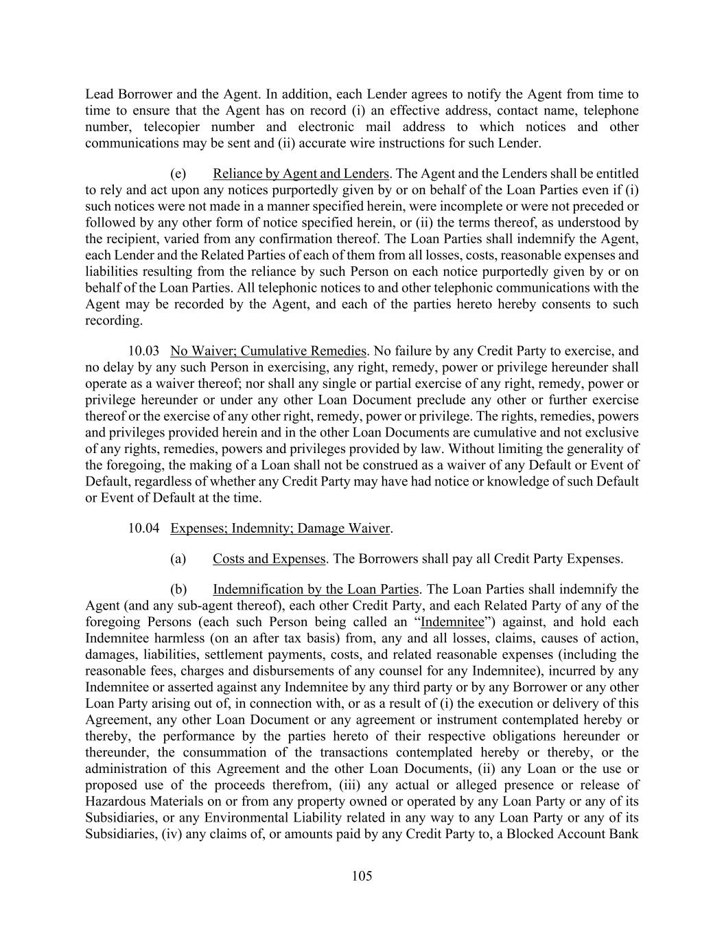 105 Lead Borrower and the Agent. In addition, each Lender agrees to notify the Agent from time to time to ensure that the Agent has on record (i) an effective address, contact name, telephone number, telecopier number and electronic mail address to which notices and other communications may be sent and (ii) accurate wire instructions for such Lender. (e) Reliance by Agent and Lenders. The Agent and the Lenders shall be entitled to rely and act upon any notices purportedly given by or on behalf of the Loan Parties even if (i) such notices were not made in a manner specified herein, were incomplete or were not preceded or followed by any other form of notice specified herein, or (ii) the terms thereof, as understood by the recipient, varied from any confirmation thereof. The Loan Parties shall indemnify the Agent, each Lender and the Related Parties of each of them from all losses, costs, reasonable expenses and liabilities resulting from the reliance by such Person on each notice purportedly given by or on behalf of the Loan Parties. All telephonic notices to and other telephonic communications with the Agent may be recorded by the Agent, and each of the parties hereto hereby consents to such recording. 10.03 No Waiver; Cumulative Remedies. No failure by any Credit Party to exercise, and no delay by any such Person in exercising, any right, remedy, power or privilege hereunder shall operate as a waiver thereof; nor shall any single or partial exercise of any right, remedy, power or privilege hereunder or under any other Loan Document preclude any other or further exercise thereof or the exercise of any other right, remedy, power or privilege. The rights, remedies, powers and privileges provided herein and in the other Loan Documents are cumulative and not exclusive of any rights, remedies, powers and privileges provided by law. Without limiting the generality of the foregoing, the making of a Loan shall not be construed as a waiver of any Default or Event of Default, regardless of whether any Credit Party may have had notice or knowledge of such Default or Event of Default at the time. 10.04 Expenses; Indemnity; Damage Waiver. (a) Costs and Expenses. The Borrowers shall pay all Credit Party Expenses. (b) Indemnification by the Loan Parties. The Loan Parties shall indemnify the Agent (and any sub-agent thereof), each other Credit Party, and each Related Party of any of the foregoing Persons (each such Person being called an “Indemnitee”) against, and hold each Indemnitee harmless (on an after tax basis) from, any and all losses, claims, causes of action, damages, liabilities, settlement payments, costs, and related reasonable expenses (including the reasonable fees, charges and disbursements of any counsel for any Indemnitee), incurred by any Indemnitee or asserted against any Indemnitee by any third party or by any Borrower or any other Loan Party arising out of, in connection with, or as a result of (i) the execution or delivery of this Agreement, any other Loan Document or any agreement or instrument contemplated hereby or thereby, the performance by the parties hereto of their respective obligations hereunder or thereunder, the consummation of the transactions contemplated hereby or thereby, or the administration of this Agreement and the other Loan Documents, (ii) any Loan or the use or proposed use of the proceeds therefrom, (iii) any actual or alleged presence or release of Hazardous Materials on or from any property owned or operated by any Loan Party or any of its Subsidiaries, or any Environmental Liability related in any way to any Loan Party or any of its Subsidiaries, (iv) any claims of, or amounts paid by any Credit Party to, a Blocked Account Bank