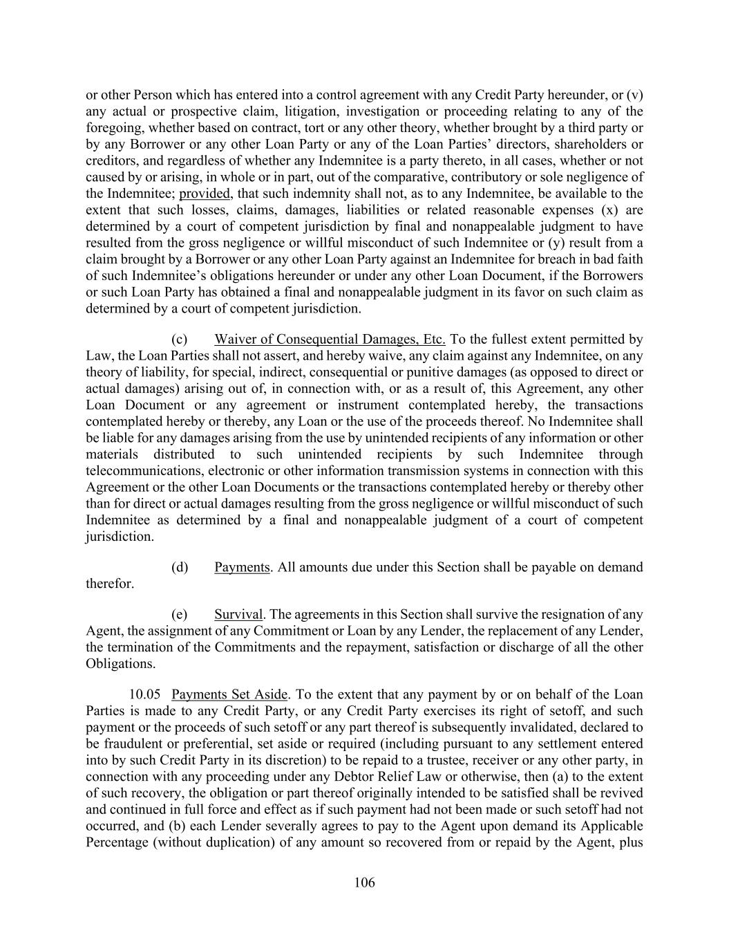 106 or other Person which has entered into a control agreement with any Credit Party hereunder, or (v) any actual or prospective claim, litigation, investigation or proceeding relating to any of the foregoing, whether based on contract, tort or any other theory, whether brought by a third party or by any Borrower or any other Loan Party or any of the Loan Parties’ directors, shareholders or creditors, and regardless of whether any Indemnitee is a party thereto, in all cases, whether or not caused by or arising, in whole or in part, out of the comparative, contributory or sole negligence of the Indemnitee; provided, that such indemnity shall not, as to any Indemnitee, be available to the extent that such losses, claims, damages, liabilities or related reasonable expenses (x) are determined by a court of competent jurisdiction by final and nonappealable judgment to have resulted from the gross negligence or willful misconduct of such Indemnitee or (y) result from a claim brought by a Borrower or any other Loan Party against an Indemnitee for breach in bad faith of such Indemnitee’s obligations hereunder or under any other Loan Document, if the Borrowers or such Loan Party has obtained a final and nonappealable judgment in its favor on such claim as determined by a court of competent jurisdiction. (c) Waiver of Consequential Damages, Etc. To the fullest extent permitted by Law, the Loan Parties shall not assert, and hereby waive, any claim against any Indemnitee, on any theory of liability, for special, indirect, consequential or punitive damages (as opposed to direct or actual damages) arising out of, in connection with, or as a result of, this Agreement, any other Loan Document or any agreement or instrument contemplated hereby, the transactions contemplated hereby or thereby, any Loan or the use of the proceeds thereof. No Indemnitee shall be liable for any damages arising from the use by unintended recipients of any information or other materials distributed to such unintended recipients by such Indemnitee through telecommunications, electronic or other information transmission systems in connection with this Agreement or the other Loan Documents or the transactions contemplated hereby or thereby other than for direct or actual damages resulting from the gross negligence or willful misconduct of such Indemnitee as determined by a final and nonappealable judgment of a court of competent jurisdiction. (d) Payments. All amounts due under this Section shall be payable on demand therefor. (e) Survival. The agreements in this Section shall survive the resignation of any Agent, the assignment of any Commitment or Loan by any Lender, the replacement of any Lender, the termination of the Commitments and the repayment, satisfaction or discharge of all the other Obligations. 10.05 Payments Set Aside. To the extent that any payment by or on behalf of the Loan Parties is made to any Credit Party, or any Credit Party exercises its right of setoff, and such payment or the proceeds of such setoff or any part thereof is subsequently invalidated, declared to be fraudulent or preferential, set aside or required (including pursuant to any settlement entered into by such Credit Party in its discretion) to be repaid to a trustee, receiver or any other party, in connection with any proceeding under any Debtor Relief Law or otherwise, then (a) to the extent of such recovery, the obligation or part thereof originally intended to be satisfied shall be revived and continued in full force and effect as if such payment had not been made or such setoff had not occurred, and (b) each Lender severally agrees to pay to the Agent upon demand its Applicable Percentage (without duplication) of any amount so recovered from or repaid by the Agent, plus
