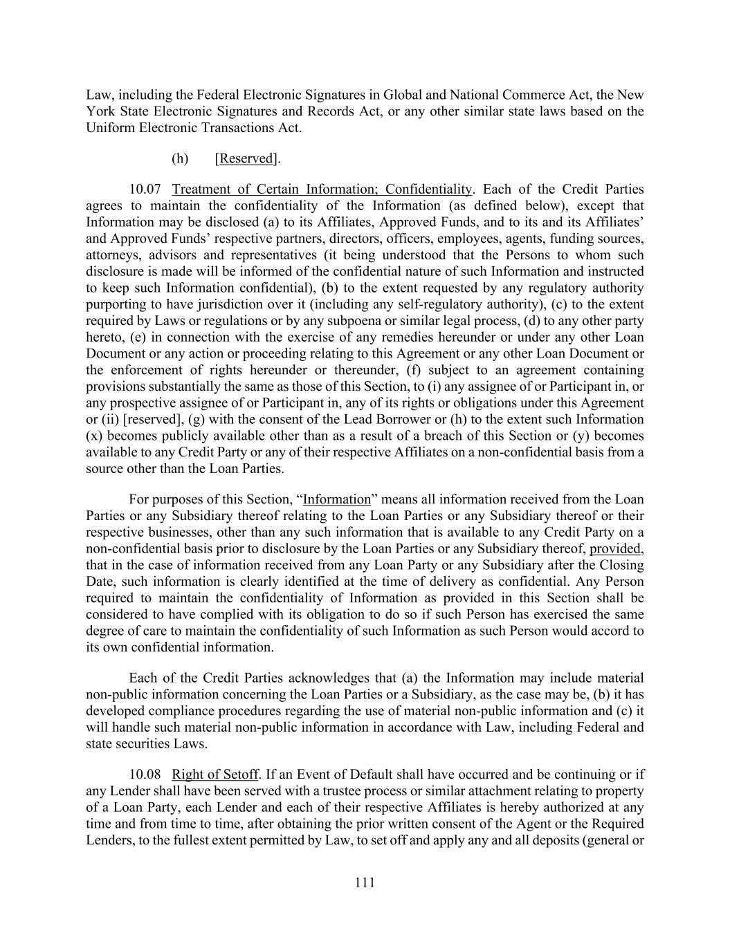111 Law, including the Federal Electronic Signatures in Global and National Commerce Act, the New York State Electronic Signatures and Records Act, or any other similar state laws based on the Uniform Electronic Transactions Act. (h) [Reserved]. 10.07 Treatment of Certain Information; Confidentiality. Each of the Credit Parties agrees to maintain the confidentiality of the Information (as defined below), except that Information may be disclosed (a) to its Affiliates, Approved Funds, and to its and its Affiliates’ and Approved Funds’ respective partners, directors, officers, employees, agents, funding sources, attorneys, advisors and representatives (it being understood that the Persons to whom such disclosure is made will be informed of the confidential nature of such Information and instructed to keep such Information confidential), (b) to the extent requested by any regulatory authority purporting to have jurisdiction over it (including any self-regulatory authority), (c) to the extent required by Laws or regulations or by any subpoena or similar legal process, (d) to any other party hereto, (e) in connection with the exercise of any remedies hereunder or under any other Loan Document or any action or proceeding relating to this Agreement or any other Loan Document or the enforcement of rights hereunder or thereunder, (f) subject to an agreement containing provisions substantially the same as those of this Section, to (i) any assignee of or Participant in, or any prospective assignee of or Participant in, any of its rights or obligations under this Agreement or (ii) [reserved], (g) with the consent of the Lead Borrower or (h) to the extent such Information (x) becomes publicly available other than as a result of a breach of this Section or (y) becomes available to any Credit Party or any of their respective Affiliates on a non-confidential basis from a source other than the Loan Parties. For purposes of this Section, “Information” means all information received from the Loan Parties or any Subsidiary thereof relating to the Loan Parties or any Subsidiary thereof or their respective businesses, other than any such information that is available to any Credit Party on a non-confidential basis prior to disclosure by the Loan Parties or any Subsidiary thereof, provided, that in the case of information received from any Loan Party or any Subsidiary after the Closing Date, such information is clearly identified at the time of delivery as confidential. Any Person required to maintain the confidentiality of Information as provided in this Section shall be considered to have complied with its obligation to do so if such Person has exercised the same degree of care to maintain the confidentiality of such Information as such Person would accord to its own confidential information. Each of the Credit Parties acknowledges that (a) the Information may include material non-public information concerning the Loan Parties or a Subsidiary, as the case may be, (b) it has developed compliance procedures regarding the use of material non-public information and (c) it will handle such material non-public information in accordance with Law, including Federal and state securities Laws. 10.08 Right of Setoff. If an Event of Default shall have occurred and be continuing or if any Lender shall have been served with a trustee process or similar attachment relating to property of a Loan Party, each Lender and each of their respective Affiliates is hereby authorized at any time and from time to time, after obtaining the prior written consent of the Agent or the Required Lenders, to the fullest extent permitted by Law, to set off and apply any and all deposits (general or