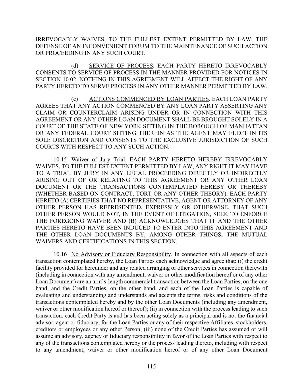 115 IRREVOCABLY WAIVES, TO THE FULLEST EXTENT PERMITTED BY LAW, THE DEFENSE OF AN INCONVENIENT FORUM TO THE MAINTENANCE OF SUCH ACTION OR PROCEEDING IN ANY SUCH COURT. (d) SERVICE OF PROCESS. EACH PARTY HERETO IRREVOCABLY CONSENTS TO SERVICE OF PROCESS IN THE MANNER PROVIDED FOR NOTICES IN SECTION 10.02. NOTHING IN THIS AGREEMENT WILL AFFECT THE RIGHT OF ANY PARTY HERETO TO SERVE PROCESS IN ANY OTHER MANNER PERMITTED BY LAW. (e) ACTIONS COMMENCED BY LOAN PARTIES. EACH LOAN PARTY AGREES THAT ANY ACTION COMMENCED BY ANY LOAN PARTY ASSERTING ANY CLAIM OR COUNTERCLAIM ARISING UNDER OR IN CONNECTION WITH THIS AGREEMENT OR ANY OTHER LOAN DOCUMENT SHALL BE BROUGHT SOLELY IN A COURT OF THE STATE OF NEW YORK SITTING IN THE BOROUGH OF MANHATTAN OR ANY FEDERAL COURT SITTING THEREIN AS THE AGENT MAY ELECT IN ITS SOLE DISCRETION AND CONSENTS TO THE EXCLUSIVE JURISDICTION OF SUCH COURTS WITH RESPECT TO ANY SUCH ACTION. 10.15 Waiver of Jury Trial. EACH PARTY HERETO HEREBY IRREVOCABLY WAIVES, TO THE FULLEST EXTENT PERMITTED BY LAW, ANY RIGHT IT MAY HAVE TO A TRIAL BY JURY IN ANY LEGAL PROCEEDING DIRECTLY OR INDIRECTLY ARISING OUT OF OR RELATING TO THIS AGREEMENT OR ANY OTHER LOAN DOCUMENT OR THE TRANSACTIONS CONTEMPLATED HEREBY OR THEREBY (WHETHER BASED ON CONTRACT, TORT OR ANY OTHER THEORY). EACH PARTY HERETO (A) CERTIFIES THAT NO REPRESENTATIVE, AGENT OR ATTORNEY OF ANY OTHER PERSON HAS REPRESENTED, EXPRESSLY OR OTHERWISE, THAT SUCH OTHER PERSON WOULD NOT, IN THE EVENT OF LITIGATION, SEEK TO ENFORCE THE FOREGOING WAIVER AND (B) ACKNOWLEDGES THAT IT AND THE OTHER PARTIES HERETO HAVE BEEN INDUCED TO ENTER INTO THIS AGREEMENT AND THE OTHER LOAN DOCUMENTS BY, AMONG OTHER THINGS, THE MUTUAL WAIVERS AND CERTIFICATIONS IN THIS SECTION. 10.16 No Advisory or Fiduciary Responsibility. In connection with all aspects of each transaction contemplated hereby, the Loan Parties each acknowledge and agree that: (i) the credit facility provided for hereunder and any related arranging or other services in connection therewith (including in connection with any amendment, waiver or other modification hereof or of any other Loan Document) are an arm’s-length commercial transaction between the Loan Parties, on the one hand, and the Credit Parties, on the other hand, and each of the Loan Parties is capable of evaluating and understanding and understands and accepts the terms, risks and conditions of the transactions contemplated hereby and by the other Loan Documents (including any amendment, waiver or other modification hereof or thereof); (ii) in connection with the process leading to such transaction, each Credit Party is and has been acting solely as a principal and is not the financial advisor, agent or fiduciary, for the Loan Parties or any of their respective Affiliates, stockholders, creditors or employees or any other Person; (iii) none of the Credit Parties has assumed or will assume an advisory, agency or fiduciary responsibility in favor of the Loan Parties with respect to any of the transactions contemplated hereby or the process leading thereto, including with respect to any amendment, waiver or other modification hereof or of any other Loan Document