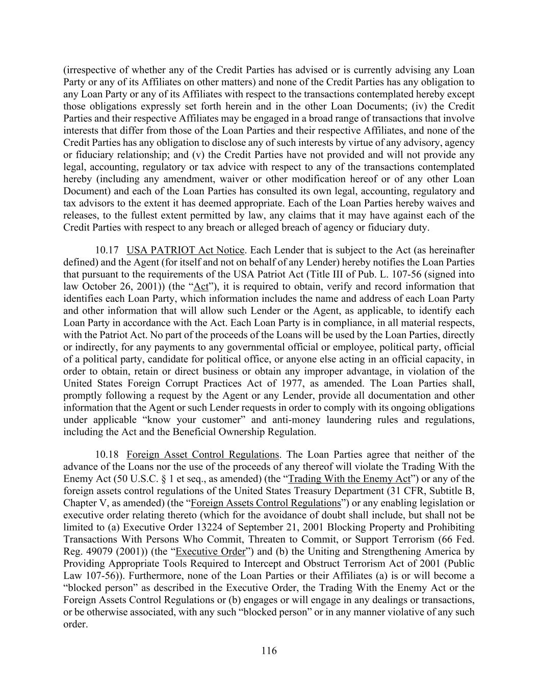 116 (irrespective of whether any of the Credit Parties has advised or is currently advising any Loan Party or any of its Affiliates on other matters) and none of the Credit Parties has any obligation to any Loan Party or any of its Affiliates with respect to the transactions contemplated hereby except those obligations expressly set forth herein and in the other Loan Documents; (iv) the Credit Parties and their respective Affiliates may be engaged in a broad range of transactions that involve interests that differ from those of the Loan Parties and their respective Affiliates, and none of the Credit Parties has any obligation to disclose any of such interests by virtue of any advisory, agency or fiduciary relationship; and (v) the Credit Parties have not provided and will not provide any legal, accounting, regulatory or tax advice with respect to any of the transactions contemplated hereby (including any amendment, waiver or other modification hereof or of any other Loan Document) and each of the Loan Parties has consulted its own legal, accounting, regulatory and tax advisors to the extent it has deemed appropriate. Each of the Loan Parties hereby waives and releases, to the fullest extent permitted by law, any claims that it may have against each of the Credit Parties with respect to any breach or alleged breach of agency or fiduciary duty. 10.17 USA PATRIOT Act Notice. Each Lender that is subject to the Act (as hereinafter defined) and the Agent (for itself and not on behalf of any Lender) hereby notifies the Loan Parties that pursuant to the requirements of the USA Patriot Act (Title III of Pub. L. 107-56 (signed into law October 26, 2001)) (the “Act”), it is required to obtain, verify and record information that identifies each Loan Party, which information includes the name and address of each Loan Party and other information that will allow such Lender or the Agent, as applicable, to identify each Loan Party in accordance with the Act. Each Loan Party is in compliance, in all material respects, with the Patriot Act. No part of the proceeds of the Loans will be used by the Loan Parties, directly or indirectly, for any payments to any governmental official or employee, political party, official of a political party, candidate for political office, or anyone else acting in an official capacity, in order to obtain, retain or direct business or obtain any improper advantage, in violation of the United States Foreign Corrupt Practices Act of 1977, as amended. The Loan Parties shall, promptly following a request by the Agent or any Lender, provide all documentation and other information that the Agent or such Lender requests in order to comply with its ongoing obligations under applicable “know your customer” and anti-money laundering rules and regulations, including the Act and the Beneficial Ownership Regulation. 10.18 Foreign Asset Control Regulations. The Loan Parties agree that neither of the advance of the Loans nor the use of the proceeds of any thereof will violate the Trading With the Enemy Act (50 U.S.C. § 1 et seq., as amended) (the “Trading With the Enemy Act”) or any of the foreign assets control regulations of the United States Treasury Department (31 CFR, Subtitle B, Chapter V, as amended) (the “Foreign Assets Control Regulations”) or any enabling legislation or executive order relating thereto (which for the avoidance of doubt shall include, but shall not be limited to (a) Executive Order 13224 of September 21, 2001 Blocking Property and Prohibiting Transactions With Persons Who Commit, Threaten to Commit, or Support Terrorism (66 Fed. Reg. 49079 (2001)) (the “Executive Order”) and (b) the Uniting and Strengthening America by Providing Appropriate Tools Required to Intercept and Obstruct Terrorism Act of 2001 (Public Law 107-56)). Furthermore, none of the Loan Parties or their Affiliates (a) is or will become a “blocked person” as described in the Executive Order, the Trading With the Enemy Act or the Foreign Assets Control Regulations or (b) engages or will engage in any dealings or transactions, or be otherwise associated, with any such “blocked person” or in any manner violative of any such order.