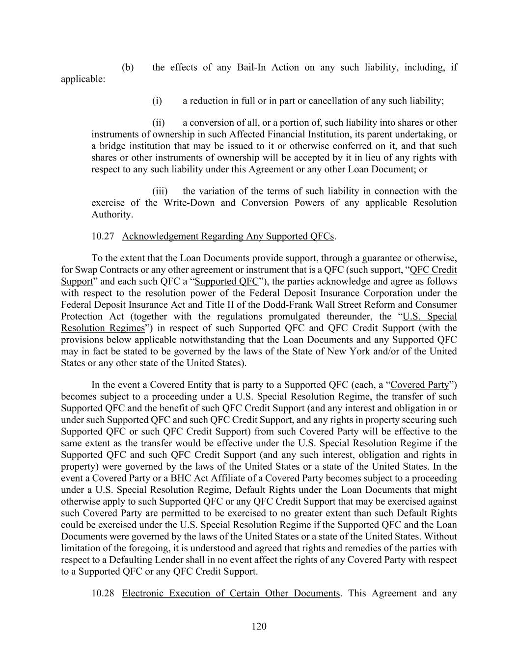 120 (b) the effects of any Bail-In Action on any such liability, including, if applicable: (i) a reduction in full or in part or cancellation of any such liability; (ii) a conversion of all, or a portion of, such liability into shares or other instruments of ownership in such Affected Financial Institution, its parent undertaking, or a bridge institution that may be issued to it or otherwise conferred on it, and that such shares or other instruments of ownership will be accepted by it in lieu of any rights with respect to any such liability under this Agreement or any other Loan Document; or (iii) the variation of the terms of such liability in connection with the exercise of the Write-Down and Conversion Powers of any applicable Resolution Authority. 10.27 Acknowledgement Regarding Any Supported QFCs. To the extent that the Loan Documents provide support, through a guarantee or otherwise, for Swap Contracts or any other agreement or instrument that is a QFC (such support, “QFC Credit Support” and each such QFC a “Supported QFC”), the parties acknowledge and agree as follows with respect to the resolution power of the Federal Deposit Insurance Corporation under the Federal Deposit Insurance Act and Title II of the Dodd-Frank Wall Street Reform and Consumer Protection Act (together with the regulations promulgated thereunder, the “U.S. Special Resolution Regimes”) in respect of such Supported QFC and QFC Credit Support (with the provisions below applicable notwithstanding that the Loan Documents and any Supported QFC may in fact be stated to be governed by the laws of the State of New York and/or of the United States or any other state of the United States). In the event a Covered Entity that is party to a Supported QFC (each, a “Covered Party”) becomes subject to a proceeding under a U.S. Special Resolution Regime, the transfer of such Supported QFC and the benefit of such QFC Credit Support (and any interest and obligation in or under such Supported QFC and such QFC Credit Support, and any rights in property securing such Supported QFC or such QFC Credit Support) from such Covered Party will be effective to the same extent as the transfer would be effective under the U.S. Special Resolution Regime if the Supported QFC and such QFC Credit Support (and any such interest, obligation and rights in property) were governed by the laws of the United States or a state of the United States. In the event a Covered Party or a BHC Act Affiliate of a Covered Party becomes subject to a proceeding under a U.S. Special Resolution Regime, Default Rights under the Loan Documents that might otherwise apply to such Supported QFC or any QFC Credit Support that may be exercised against such Covered Party are permitted to be exercised to no greater extent than such Default Rights could be exercised under the U.S. Special Resolution Regime if the Supported QFC and the Loan Documents were governed by the laws of the United States or a state of the United States. Without limitation of the foregoing, it is understood and agreed that rights and remedies of the parties with respect to a Defaulting Lender shall in no event affect the rights of any Covered Party with respect to a Supported QFC or any QFC Credit Support. 10.28 Electronic Execution of Certain Other Documents. This Agreement and any