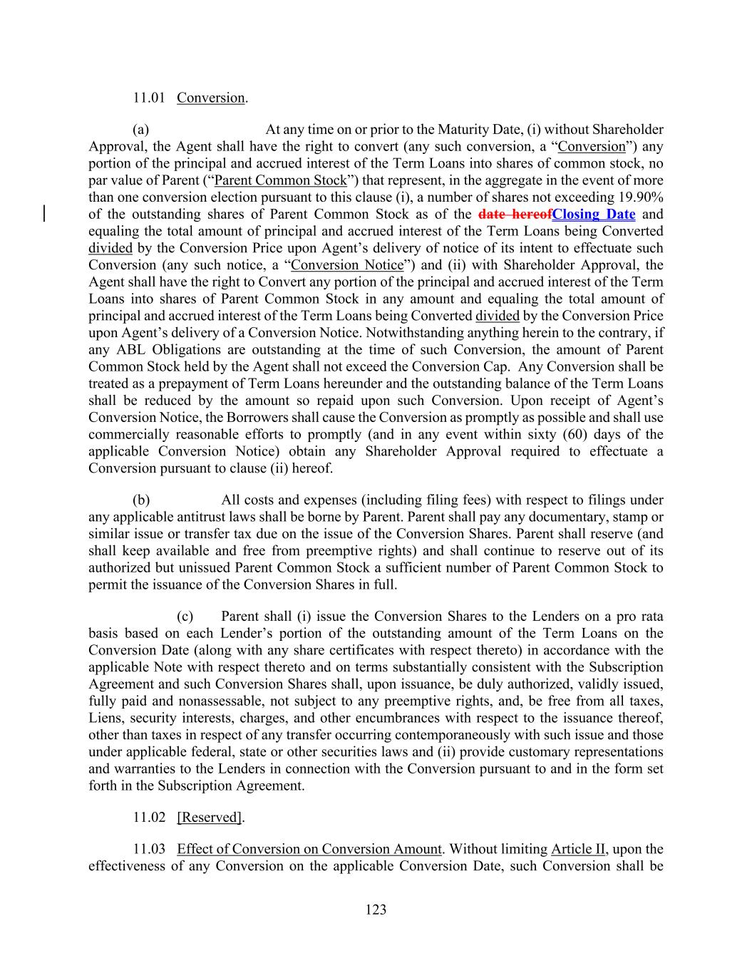 123 11.01 Conversion. (a) At any time on or prior to the Maturity Date, (i) without Shareholder Approval, the Agent shall have the right to convert (any such conversion, a “Conversion”) any portion of the principal and accrued interest of the Term Loans into shares of common stock, no par value of Parent (“Parent Common Stock”) that represent, in the aggregate in the event of more than one conversion election pursuant to this clause (i), a number of shares not exceeding 19.90% of the outstanding shares of Parent Common Stock as of the date hereofClosing Date and equaling the total amount of principal and accrued interest of the Term Loans being Converted divided by the Conversion Price upon Agent’s delivery of notice of its intent to effectuate such Conversion (any such notice, a “Conversion Notice”) and (ii) with Shareholder Approval, the Agent shall have the right to Convert any portion of the principal and accrued interest of the Term Loans into shares of Parent Common Stock in any amount and equaling the total amount of principal and accrued interest of the Term Loans being Converted divided by the Conversion Price upon Agent’s delivery of a Conversion Notice. Notwithstanding anything herein to the contrary, if any ABL Obligations are outstanding at the time of such Conversion, the amount of Parent Common Stock held by the Agent shall not exceed the Conversion Cap. Any Conversion shall be treated as a prepayment of Term Loans hereunder and the outstanding balance of the Term Loans shall be reduced by the amount so repaid upon such Conversion. Upon receipt of Agent’s Conversion Notice, the Borrowers shall cause the Conversion as promptly as possible and shall use commercially reasonable efforts to promptly (and in any event within sixty (60) days of the applicable Conversion Notice) obtain any Shareholder Approval required to effectuate a Conversion pursuant to clause (ii) hereof. (b) All costs and expenses (including filing fees) with respect to filings under any applicable antitrust laws shall be borne by Parent. Parent shall pay any documentary, stamp or similar issue or transfer tax due on the issue of the Conversion Shares. Parent shall reserve (and shall keep available and free from preemptive rights) and shall continue to reserve out of its authorized but unissued Parent Common Stock a sufficient number of Parent Common Stock to permit the issuance of the Conversion Shares in full. (c) Parent shall (i) issue the Conversion Shares to the Lenders on a pro rata basis based on each Lender’s portion of the outstanding amount of the Term Loans on the Conversion Date (along with any share certificates with respect thereto) in accordance with the applicable Note with respect thereto and on terms substantially consistent with the Subscription Agreement and such Conversion Shares shall, upon issuance, be duly authorized, validly issued, fully paid and nonassessable, not subject to any preemptive rights, and, be free from all taxes, Liens, security interests, charges, and other encumbrances with respect to the issuance thereof, other than taxes in respect of any transfer occurring contemporaneously with such issue and those under applicable federal, state or other securities laws and (ii) provide customary representations and warranties to the Lenders in connection with the Conversion pursuant to and in the form set forth in the Subscription Agreement. 11.02 [Reserved]. 11.03 Effect of Conversion on Conversion Amount. Without limiting Article II, upon the effectiveness of any Conversion on the applicable Conversion Date, such Conversion shall be