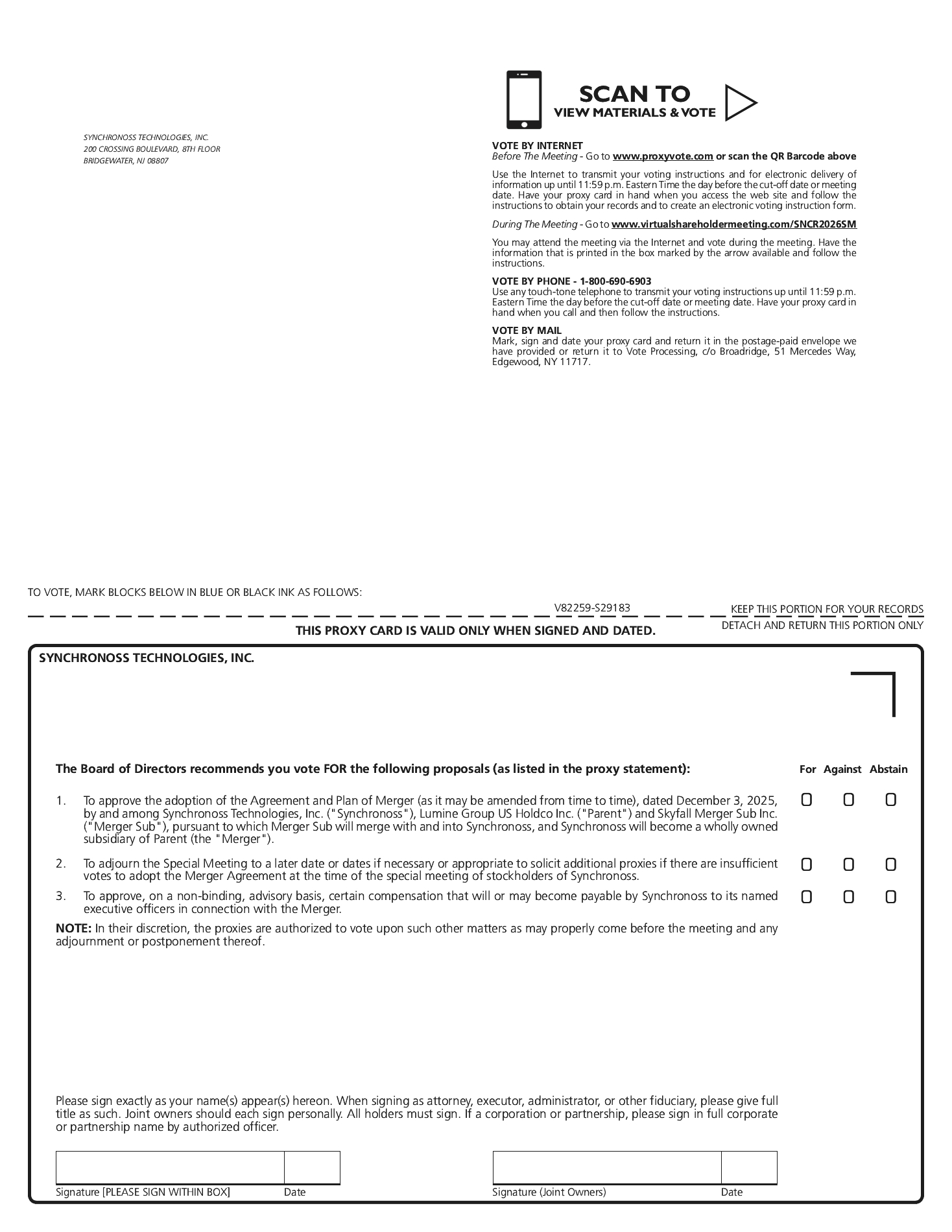 Whether or not you plan to attend the Special Meeting virtually through the online Special Meeting portal at www.virtualshareholdermeeting.com/SNCR2026SM, please sign, date and return, as promptly as possible, the enclosed proxy card in the accompanying prepaid reply envelope or grant your proxy electronically over the Internet or by telephone. If you attend the Special Meeting virtually and vote in person by ballot, your vote will revoke any proxy that you have previously submitted. If you fail to return your proxy card or fail to submit your proxy by telephone or the Internet, your shares of common stock of the Company will not be counted for purposes of determining whether a quorum is present at the special meeting and will have the same effect as a vote “AGAINST” the proposal to adopt the Merger Agreement.