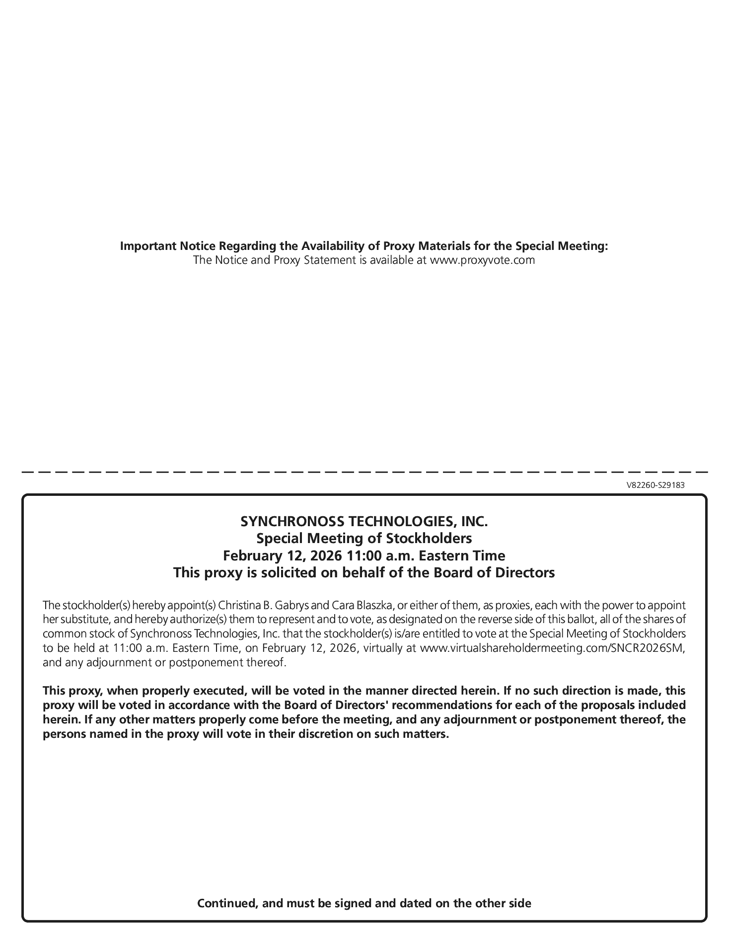 A special meeting of stockholders of Synchronoss (the “Special Meeting”) will be held virtually via live webcast at www.virtualshareholdermeeting.com/SNCR2026SM at 11:00 a.m. Eastern Time on February 12, 2026. You will not be able to attend the Special Meeting physically.