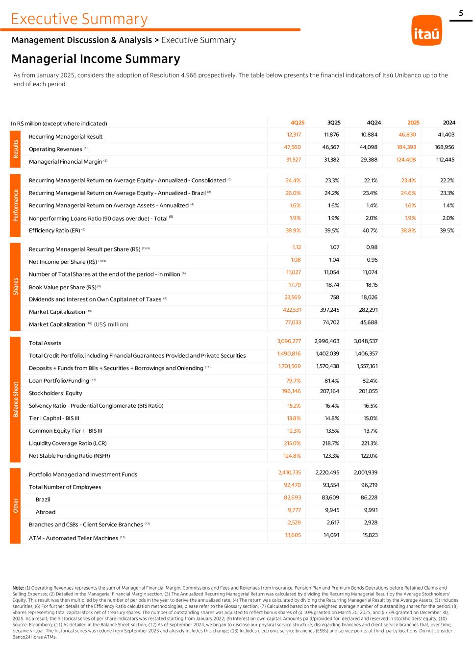 Executive Summary Management Discussion & Analysis > Executive Summary Managerial Income Summary As from January 2025, considers the adoption of Resolution 4,966 prospectively. The table below presents the financial indicators of Itaú Unibanco up to the end of each period. Note: (1) Operating Revenues represents the sum of Managerial Financial Margin, Commissions and Fees and Revenues from Insurance, Pension Plan and Premium Bonds Operations before Retained Claims and Selling Expenses; (2) Detailed in the Managerial Financial Margin section; (3) The Annualized Recurring Managerial Return was calculated by dividing the Recurring Managerial Result by the Average Stockholders’ Equity. This result was then multiplied by the number of periods in the year to derive the annualized rate; (4) The return was calculated by dividing the Recurring Managerial Result by the Average Assets; (5) Includes securities; (6) For further details of the Efficiency Ratio calculation methodologies, please refer to the Glossary section; (7) Calculated based on the weighted average number of outstanding shares for the period; (8) Shares representing total capital stock net of treasury shares. The number of outstanding shares was adjusted to reflect bonus shares of (i) 10% granted on March 20, 2025; and (ii) 3% granted on December 30, 2025. As a result, the historical series of per share indicators was restated starting from January 2022; (9) Interest on own capital. Amounts paid/provided for, declared and reserved in stockholders’ equity; (10) Source: Bloomberg; (11) As detailed in the Balance Sheet section; (12) As of September 2024, we began to disclose our physical service structure, disregarding branches and client service branches that, over time, became virtual. The historical series was redone from September 2023 and already includes this change; (13) Includes electronic service branches (ESBs) and service points at third-party locations. Do not consider Banco24Horas ATMs. 5 In R$ million (except where indicated) 4Q25 3Q25 4Q24 2025 2024 Recurring Managerial Result 12,317 11,876 10,884 46,830 41,403 Operating Revenues (1) 47,560 46,567 44,098 184,393 168,956 Managerial Financial Margin (2) 31,527 31,382 29,388 124,408 112,445 Recurring Managerial Return on Average Equity - Annualized - Consolidated (3) 24.4% 23.3% 22.1% 23.4% 22.2% Recurring Managerial Return on Average Equity - Annualized - Brazil (3) 26.0% 24.2% 23.4% 24.6% 23.3% Recurring Managerial Return on Average Assets - Annualized (4) 1.6% 1.6% 1.4% 1.6% 1.4% Nonperforming Loans Ratio (90 days overdue) - Total (5) 1.9% 1.9% 2.0% 1.9% 2.0% Efficiency Ratio (ER) (6) 38.9% 39.5% 40.7% 38.8% 39.5% Recurring Managerial Result per Share (R$) (7) (8) 1.12 1.07 0.98 Net Income per Share (R$) (7)(8) 1.08 1.04 0.95 Number of Total Shares at the end of the period - in million (8) 11,027 11,054 11,074 Book Value per Share (R$) (8) 17.79 18.74 18.15 Dividends and Interest on Own Capital net of Taxes (9) 23,569 758 18,026 Market Capitalization (10) 422,531 397,245 282,291 Market Capitalization (10) (US$ million) 77,033 74,702 45,688 Total Assets 3,096,277 2,996,463 3,048,537 Total Credit Portfolio, including Financial Guarantees Provided and Private Securities 1,490,816 1,402,039 1,406,357 Deposits + Funds from Bills + Securities + Borrowings and Onlending (11) 1,701,569 1,570,438 1,557,161 Loan Portfolio/Funding (11) 79.7% 81.4% 82.4% Stockholders' Equity 196,146 207,164 201,055 Solvency Ratio - Prudential Conglomerate (BIS Ratio) 15.2% 16.4% 16.5% Tier I Capital - BIS III 13.8% 14.8% 15.0% Common Equity Tier I - BIS III 12.3% 13.5% 13.7% Liquidity Coverage Ratio (LCR) 215.0% 218.7% 221.3% Net Stable Funding Ratio (NSFR) 124.8% 123.3% 122.0% Portfolio Managed and Investment Funds 2,410,735 2,220,495 2,001,939 Total Number of Employees 92,470 93,554 96,219 Brazil 82,693 83,609 86,228 Abroad 9,777 9,945 9,991 Branches and CSBs - Client Service Branches (12) 2,529 2,617 2,928 ATM - Automated Teller Machines (13) 13,605 14,091 15,823 R e su lt s P e rf o rm a n ce S h a re s O th e r B a la n ce S h e e t