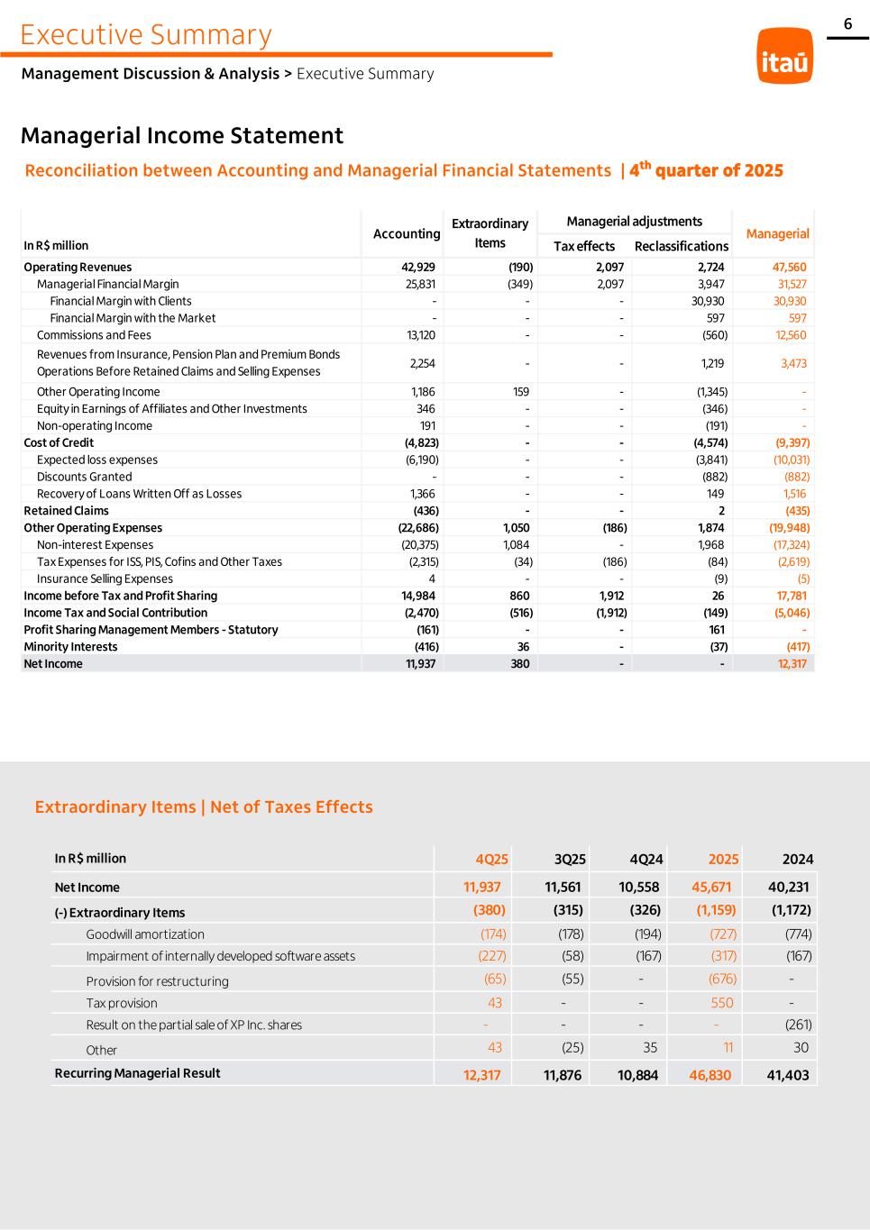 Reconciliation between Accounting and Managerial Financial Statements | 4th quarter of 2025 Extraordinary Items | Net of Taxes Effects Executive Summary Management Discussion & Analysis > Executive Summary Managerial Income Statement 6 In R$ million Tax effects Reclassifications Operating Revenues 42,929 (190) 2,097 2,724 47,560 Managerial Financial Margin 25,831 (349) 2,097 3,947 31,527 Financial Margin with Clients - - - 30,930 30,930 Financial Margin with the Market - - - 597 597 Commissions and Fees 13,120 - - (560) 12,560 Revenues from Insurance, Pension Plan and Premium Bonds Operations Before Retained Claims and Selling Expenses 2,254 - - 1,219 3,473 Other Operating Income 1,186 159 - (1,345) - Equity in Earnings of Affiliates and Other Investments 346 - - (346) - Non-operating Income 191 - - (191) - Cost of Credit (4,823) - - (4,574) (9,397) Expected loss expenses (6,190) - - (3,841) (10,031) Discounts Granted - - - (882) (882) Recovery of Loans Written Off as Losses 1,366 - - 149 1,516 Retained Claims (436) - - 2 (435) Other Operating Expenses (22,686) 1,050 (186) 1,874 (19,948) Non-interest Expenses (20,375) 1,084 - 1,968 (17,324) Tax Expenses for ISS, PIS, Cofins and Other Taxes (2,315) (34) (186) (84) (2,619) Insurance Selling Expenses 4 - - (9) (5) Income before Tax and Profit Sharing 14,984 860 1,912 26 17,781 Income Tax and Social Contribution (2,470) (516) (1,912) (149) (5,046) Profit Sharing Management Members - Statutory (161) - - 161 - Minority Interests (416) 36 - (37) (417) Net Income 11,937 380 - - 12,317 Managerial Accounting Extraordinary Items Managerial adjustments In R$ million 4Q25 3Q25 4Q24 2025 2024 Net Income 11,937 11,561 10,558 45,671 40,231 (-) Extraordinary Items (380) (315) (326) (1,159) (1,172) Goodwill amortization (174) (178) (194) (727) (774) Impairment of internally developed software assets (227) (58) (167) (317) (167) Provision for restructuring (65) (55) - (676) - Tax provision 43 - - 550 - Result on the partial sale of XP Inc. shares - - - - (261) Other 43 (25) 35 11 30 Recurring Managerial Result 12,317 11,876 10,884 46,830 41,403