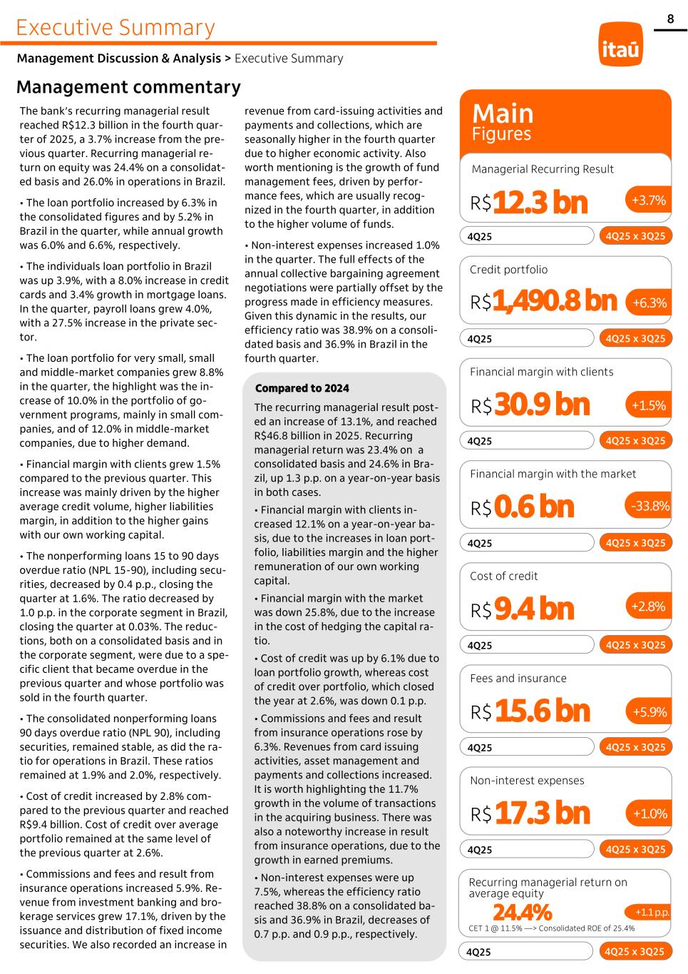 revenue from card-issuing activities and payments and collections, which are seasonally higher in the fourth quarter due to higher economic activity. Also worth mentioning is the growth of fund management fees, driven by perfor- mance fees, which are usually recog- nized in the fourth quarter, in addition to the higher volume of funds. • Non-interest expenses increased 1.0% in the quarter. The full effects of the annual collective bargaining agreement negotiations were partially offset by the progress made in efficiency measures. Given this dynamic in the results, our efficiency ratio was 38.9% on a consoli- dated basis and 36.9% in Brazil in the fourth quarter. Management commentary Executive Summary Management Discussion & Analysis > Executive Summary The bank’s recurring managerial result reached R$12.3 billion in the fourth quar- ter of 2025, a 3.7% increase from the pre- vious quarter. Recurring managerial re- turn on equity was 24.4% on a consolidat- ed basis and 26.0% in operations in Brazil. • The loan portfolio increased by 6.3% in the consolidated figures and by 5.2% in Brazil in the quarter, while annual growth was 6.0% and 6.6%, respectively. • The individuals loan portfolio in Brazil was up 3.9%, with a 8.0% increase in credit cards and 3.4% growth in mortgage loans. In the quarter, payroll loans grew 4.0%, with a 27.5% increase in the private sec- tor. • The loan portfolio for very small, small and middle-market companies grew 8.8% in the quarter, the highlight was the in- crease of 10.0% in the portfolio of go- vernment programs, mainly in small com- panies, and of 12.0% in middle-market companies, due to higher demand. • Financial margin with clients grew 1.5% compared to the previous quarter. This increase was mainly driven by the higher average credit volume, higher liabilities margin, in addition to the higher gains with our own working capital. • The nonperforming loans 15 to 90 days overdue ratio (NPL 15-90), including secu- rities, decreased by 0.4 p.p., closing the quarter at 1.6%. The ratio decreased by 1.0 p.p. in the corporate segment in Brazil, closing the quarter at 0.03%. The reduc- tions, both on a consolidated basis and in the corporate segment, were due to a spe- cific client that became overdue in the previous quarter and whose portfolio was sold in the fourth quarter. • The consolidated nonperforming loans 90 days overdue ratio (NPL 90), including securities, remained stable, as did the ra- tio for operations in Brazil. These ratios remained at 1.9% and 2.0%, respectively. • Cost of credit increased by 2.8% com- pared to the previous quarter and reached R$9.4 billion. Cost of credit over average portfolio remained at the same level of the previous quarter at 2.6%. • Commissions and fees and result from insurance operations increased 5.9%. Re- venue from investment banking and bro- kerage services grew 17.1%, driven by the issuance and distribution of fixed income securities. We also recorded an increase in The recurring managerial result post- ed an increase of 13.1%, and reached R$46.8 billion in 2025. Recurring managerial return was 23.4% on a consolidated basis and 24.6% in Bra- zil, up 1.3 p.p. on a year-on-year basis in both cases. • Financial margin with clients in- creased 12.1% on a year-on-year ba- sis, due to the increases in loan port- folio, liabilities margin and the higher remuneration of our own working capital. • Financial margin with the market was down 25.8%, due to the increase in the cost of hedging the capital ra- tio. • Cost of credit was up by 6.1% due to loan portfolio growth, whereas cost of credit over portfolio, which closed the year at 2.6%, was down 0.1 p.p. • Commissions and fees and result from insurance operations rose by 6.3%. Revenues from card issuing activities, asset management and payments and collections increased. It is worth highlighting the 11.7% growth in the volume of transactions in the acquiring business. There was also a noteworthy increase in result from insurance operations, due to the growth in earned premiums. • Non-interest expenses were up 7.5%, whereas the efficiency ratio reached 38.8% on a consolidated ba- sis and 36.9% in Brazil, decreases of 0.7 p.p. and 0.9 p.p., respectively. Main Figures Managerial Recurring Result R$ 12.3 bn +3.7% 4Q25 4Q25 x 3Q25 R$ 1,490.8 bn +6.3% Credit portfolio 4Q25 4Q25 x 3Q25 R$ 30.9 bn +1.5% Financial margin with clients 4Q25 4Q25 x 3Q25 R$ 0.6 bn -33.8% Financial margin with the market 4Q25 4Q25 x 3Q25 R$ 9.4 bn Cost of credit 4Q25 4Q25 x 3Q25 R$ 15.6 bn +5.9% Fees and insurance 4Q25 4Q25 x 3Q25 R$ 17.3 bn Non-interest expenses 4Q25 4Q25 x 3Q25 24.4% +1.1 p.p. Recurring managerial return on average equity 4Q25 4Q25 x 3Q25 +2.8% +1.0% 8 Compared to 2024 CET 1 @ 11.5% —> Consolidated ROE of 25.4%