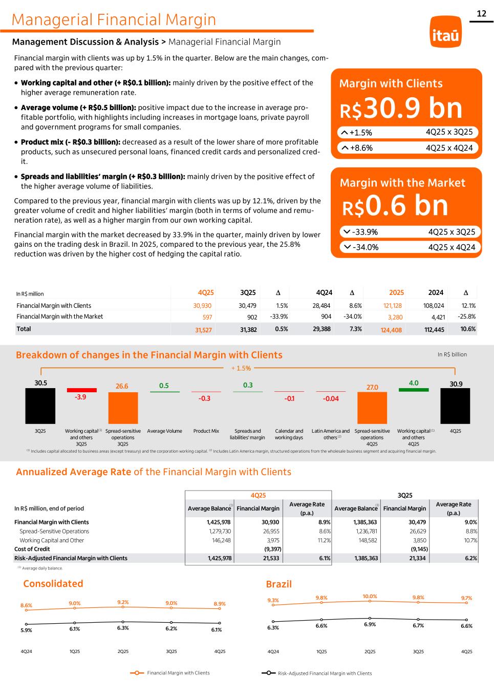 Managerial Financial Margin Management Discussion & Analysis > Managerial Financial Margin (1) (1) (2) Consolidated Brazil 12 (1) Average daily balance. 30.5 26.6 27.0 30.9 -3.9 -0.3 -0.1 -0.04 0.5 0.3 4.0 3Q25 Working capital and others 3Q25 Spread-sensitive operations 3Q25 Average Volume Product Mix Spreads and liabilities' margin Calendar and working days Latin America and others Spread-sensitive operations 4Q25 Working capital and others 4Q25 4Q25 Breakdown of changes in the Financial Margin with Clients In R$ billion (1) Includes capital allocated to business areas (except treasury) and the corporation working capital. (2) Includes Latin America margin, structured operations from the wholesale business segment and acquiring financial margin. + 1.5% Annualized Average Rate of the Financial Margin with Clients In R$ million 4Q25 3Q25 4Q24 2025 2024 Financial Margin with Clients 30,930 30,479 1.5% 28,484 8.6% 121,128 108,024 12.1% Financial Margin with the Market 597 902 -33.9% 904 -34.0% 3,280 4,421 -25.8% Total 31,527 31,382 0.5% 29,388 7.3% 124,408 112,445 10.6% Financial margin with clients was up by 1.5% in the quarter. Below are the main changes, com- pared with the previous quarter: • Working capital and other (+ R$0.1 billion): mainly driven by the positive effect of the higher average remuneration rate. • Average volume (+ R$0.5 billion): positive impact due to the increase in average pro- fitable portfolio, with highlights including increases in mortgage loans, private payroll and government programs for small companies. • Product mix (- R$0.3 billion): decreased as a result of the lower share of more profitable products, such as unsecured personal loans, financed credit cards and personalized cred- it. • Spreads and liabilities’ margin (+ R$0.3 billion): mainly driven by the positive effect of the higher average volume of liabilities. Compared to the previous year, financial margin with clients was up by 12.1%, driven by the greater volume of credit and higher liabilities’ margin (both in terms of volume and remu- neration rate), as well as a higher margin from our own working capital. Financial margin with the market decreased by 33.9% in the quarter, mainly driven by lower gains on the trading desk in Brazil. In 2025, compared to the previous year, the 25.8% reduction was driven by the higher cost of hedging the capital ratio. Margin with Clients R$30.9 bn +1.5% +8.6% 4Q25 x 3Q25 4Q25 x 4Q24 Margin with the Market R$0.6 bn -33.9% -34.0% 4Q25 x 3Q25 4Q25 x 4Q24 In R$ million, end of period Average Balance Financial Margin Average Rate (p.a.) Average Balance Financial Margin Average Rate (p.a.) Financial Margin with Clients 1,425,978 30,930 8.9% 1,385,363 30,479 9.0% Spread-Sensitive Operations 1,279,730 26,955 8.6% 1,236,781 26,629 8.8% Working Capital and Other 146,248 3,975 11.2% 148,582 3,850 10.7% Cost of Credit (9,397) (9,145) Risk-Adjusted Financial Margin with Clients 1,425,978 21,533 6.1% 1,385,363 21,334 6.2% 4Q25 3Q25 (1) (1) 8.6% 9.0% 9.2% 9.0% 8.9% 5.9% 6.1% 6.3% 6.2% 6.1% 4Q24 1Q25 2Q25 3Q25 4Q25 9.3% 9.8% 10.0% 9.8% 9.7% 6.3% 6.6% 6.9% 6.7% 6.6% 4Q24 1Q25 2Q25 3Q25 4Q25 Financial Margin with Clients Risk-Adjusted Financial Margin with Clients