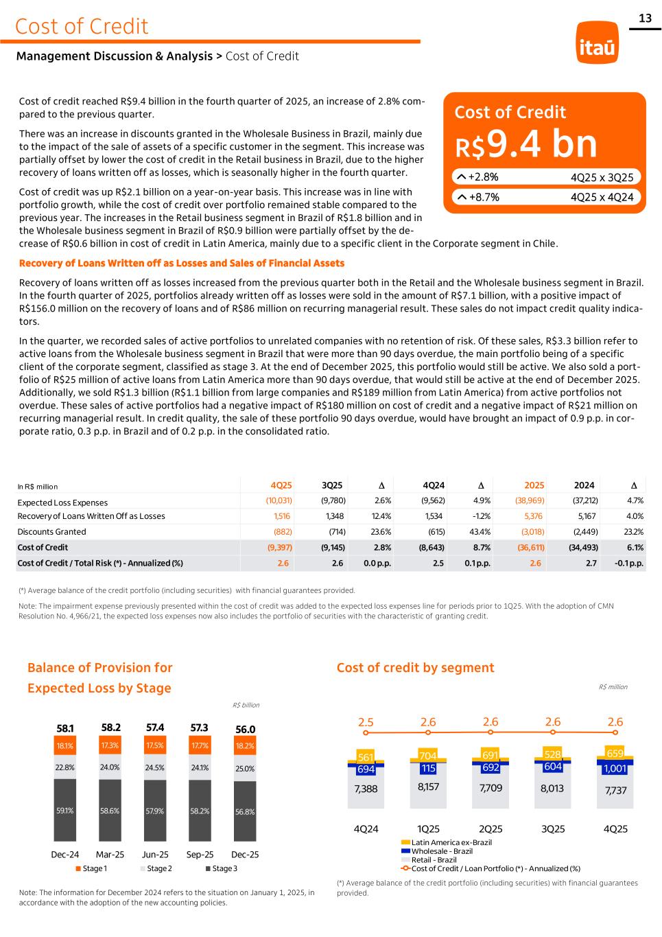 13 59.1% 58.6% 57.9% 58.2% 56.8% 22.8% 24.0% 24.5% 24.1% 25.0% 18.1% 17.3% 17.5% 17.7% 18.2% 58.1 58.2 57.4 57.3 56.0 Dec-24 Mar-25 Jun-25 Sep-25 Dec-25 Stage 1 Stage 2 Stage 3 Cost of Credit Management Discussion & Analysis > Cost of Credit Cost of credit reached R$9.4 billion in the fourth quarter of 2025, an increase of 2.8% com- pared to the previous quarter. There was an increase in discounts granted in the Wholesale Business in Brazil, mainly due to the impact of the sale of assets of a specific customer in the segment. This increase was partially offset by lower the cost of credit in the Retail business in Brazil, due to the higher recovery of loans written off as losses, which is seasonally higher in the fourth quarter. Cost of credit was up R$2.1 billion on a year-on-year basis. This increase was in line with portfolio growth, while the cost of credit over portfolio remained stable compared to the previous year. The increases in the Retail business segment in Brazil of R$1.8 billion and in the Wholesale business segment in Brazil of R$0.9 billion were partially offset by the de- crease of R$0.6 billion in cost of credit in Latin America, mainly due to a specific client in the Corporate segment in Chile. Recovery of Loans Written off as Losses and Sales of Financial Assets Recovery of loans written off as losses increased from the previous quarter both in the Retail and the Wholesale business segment in Brazil. In the fourth quarter of 2025, portfolios already written off as losses were sold in the amount of R$7.1 billion, with a positive impact of R$156.0 million on the recovery of loans and of R$86 million on recurring managerial result. These sales do not impact credit quality indica- tors. In the quarter, we recorded sales of active portfolios to unrelated companies with no retention of risk. Of these sales, R$3.3 billion refer to active loans from the Wholesale business segment in Brazil that were more than 90 days overdue, the main portfolio being of a specific client of the corporate segment, classified as stage 3. At the end of December 2025, this portfolio would still be active. We also sold a port- folio of R$25 million of active loans from Latin America more than 90 days overdue, that would still be active at the end of December 2025. Additionally, we sold R$1.3 billion (R$1.1 billion from large companies and R$189 million from Latin America) from active portfolios not overdue. These sales of active portfolios had a negative impact of R$180 million on cost of credit and a negative impact of R$21 million on recurring managerial result. In credit quality, the sale of these portfolio 90 days overdue, would have brought an impact of 0.9 p.p. in cor- porate ratio, 0.3 p.p. in Brazil and of 0.2 p.p. in the consolidated ratio. Cost of Credit +2.8% +8.7% 4Q25 x 3Q25 R$9.4 bn 4Q25 x 4Q24 7,388 8,157 7,709 8,013 7,737 694 115 692 604 1,001 561 704 691 528 659 8,643 8,976 9,093 9,145 9,397 2.5 2.6 2.6 2.6 2.6 4Q24 1Q25 2Q25 3Q25 4Q25 Latin America ex-Brazil Wholesale - Brazil Retail - Brazil Cost of Credit / Loan Portfolio (*) - Annualized (%) Cost of credit by segment Balance of Provision for Expected Loss by Stage (*) Average balance of the credit portfolio (including securities) with financial guarantees provided. (*) Average balance of the credit portfolio (including securities) with financial guarantees provided. Note: The impairment expense previously presented within the cost of credit was added to the expected loss expenses line for periods prior to 1Q25. With the adoption of CMN Resolution No. 4,966/21, the expected loss expenses now also includes the portfolio of securities with the characteristic of granting credit. R$ million R$ billion Note: The information for December 2024 refers to the situation on January 1, 2025, in accordance with the adoption of the new accounting policies. In R$ million 4Q25 3Q25 D 4Q24 D 2025 2024 D Expected Loss Expenses (10,031) (9,780) 2.6% (9,562) 4.9% (38,969) (37,212) 4.7% Recovery of Loans Written Off as Losses 1,516 1,348 12.4% 1,534 -1.2% 5,376 5,167 4.0% Discounts Granted (882) (714) 23.6% (615) 43.4% (3,018) (2,449) 23.2% Cost of Credit (9,397) (9,145) 2.8% (8,643) 8.7% (36,611) (34,493) 6.1% Cost of Credit / Total Risk (*) - Annualized (%) 2.6 2.6 0.0 p.p. 2.5 0.1 p.p. 2.6 2.7 -0.1 p.p.