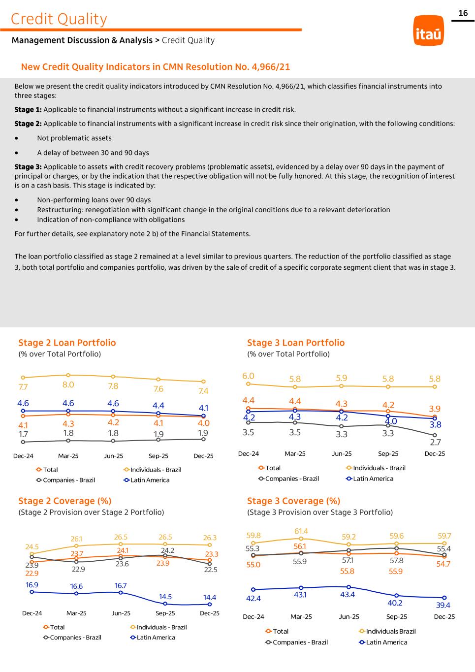 16 4.1 4.3 4.2 4.1 4.0 7.7 8.0 7.8 7.6 7.4 1.7 1.8 1.8 1.9 1.9 4.6 4.6 4.6 4.4 4.1 Dec-24 Mar-25 Jun-25 Sep-25 Dec-25 Total Individuals - Brazil Companies - Brazil Latin America Credit Quality Management Discussion & Analysis > Credit Quality New Credit Quality Indicators in CMN Resolution No. 4,966/21 Below we present the credit quality indicators introduced by CMN Resolution No. 4,966/21, which classifies financial instruments into three stages: Stage 1: Applicable to financial instruments without a significant increase in credit risk. Stage 2: Applicable to financial instruments with a significant increase in credit risk since their origination, with the following conditions: • Not problematic assets • A delay of between 30 and 90 days Stage 3: Applicable to assets with credit recovery problems (problematic assets), evidenced by a delay over 90 days in the payment of principal or charges, or by the indication that the respective obligation will not be fully honored. At this stage, the recognition of interest is on a cash basis. This stage is indicated by: • Non-performing loans over 90 days • Restructuring: renegotiation with significant change in the original conditions due to a relevant deterioration • Indication of non-compliance with obligations For further details, see explanatory note 2 b) of the Financial Statements. The loan portfolio classified as stage 2 remained at a level similar to previous quarters. The reduction of the portfolio classified as stage 3, both total portfolio and companies portfolio, was driven by the sale of credit of a specific corporate segment client that was in stage 3. Stage 2 Loan Portfolio (% over Total Portfolio) Stage 3 Loan Portfolio (% over Total Portfolio) Stage 2 Coverage (%) (Stage 2 Provision over Stage 2 Portfolio) Stage 3 Coverage (%) (Stage 3 Provision over Stage 3 Portfolio) 4.4 4.4 4.3 4.2 3.9 6.0 5.8 5.9 5.8 5.8 3.5 3.5 3.3 3.3 2.7 4.2 4.3 4.2 4.0 3.8 Dec-24 Mar-25 Jun-25 Sep-25 Dec-25 Total Individuals - Brazil Companies - Brazil Latin America 55.0 56.1 55.8 55.9 54.7 59.8 61.4 59.2 59.6 59.7 55.3 55.9 57.1 57.8 55.4 42.4 43.1 43.4 40.2 39.4 Dec-24 Mar-25 Jun-25 Sep-25 Dec-25 Total Individuals Brazil Companies - Brazil Latin America 22.9 23.7 24.1 23.9 23.3 24.5 26.1 26.5 26.5 26.3 23.9 22.9 23.6 24.2 22.5 16.9 16.6 16.7 14.5 14.4 Dec-24 Mar-25 Jun-25 Sep-25 Dec-25 Total Individuals - Brazil Companies - Brazil Latin America