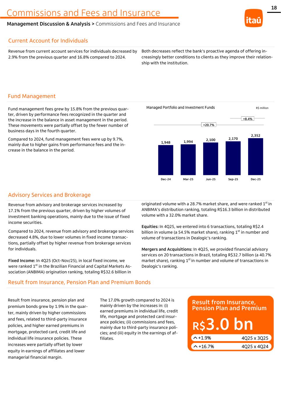 18 1,948 1,994 2,100 2,170 2,352 Dec-24 Mar-25 Jun-25 Sep-25 Dec-25 Revenue from current account services for individuals decreased by 2.9% from the previous quarter and 16.8% compared to 2024. Both decreases reflect the bank’s proactive agenda of offering in- creasingly better conditions to clients as they improve their relation- ship with the institution. Advisory Services and Brokerage Revenue from advisory and brokerage services increased by 17.1% from the previous quarter, driven by higher volumes of investment banking operations, mainly due to the issue of fixed income securities. Compared to 2024, revenue from advisory and brokerage services decreased 4.8%, due to lower volumes in fixed income transac- tions, partially offset by higher revenue from brokerage services for individuals. Fixed Income: In 4Q25 (Oct-Nov/25), in local fixed income, we were ranked 1st in the Brazilian Financial and Capital Markets As- sociation (ANBIMA) origination ranking, totaling R$32.6 billion in Result from Insurance, Pension Plan and Premium Bonds Result from insurance, pension plan and premium bonds grew by 1.9% in the quar- ter, mainly driven by higher commissions and fees, related to third-party insurance policies, and higher earned premiums in mortgage, protected card, credit life and individual life insurance policies. These increases were partially offset by lower equity in earnings of affiliates and lower managerial financial margin. Current Account for Individuals Fund Management Fund management fees grew by 15.8% from the previous quar- ter, driven by performance fees recognized in the quarter and the increase in the balance in asset management in the period. These movements were partially offset by the fewer number of business days in the fourth quarter. Compared to 2024, fund management fees were up by 9.7%, mainly due to higher gains from performance fees and the in- crease in the balance in the period. +20.7% +8.4% originated volume with a 28.7% market share, and were ranked 1st in ANBIMA’s distribution ranking, totaling R$16.3 billion in distributed volume with a 32.0% market share. Equities: In 4Q25, we entered into 6 transactions, totaling R$2.4 billion in volume (a 54.5% market share), ranking 1st in number and volume of transactions in Dealogic’s ranking. Mergers and Acquisitions: In 4Q25, we provided financial advisory services on 20 transactions in Brazil, totaling R$32.7 billion (a 40.7% market share), ranking 1st in number and volume of transactions in Dealogic’s ranking. +1.9% +16.7% 4Q25 x 3Q25 R$3.0 bn 4Q25 x 4Q24 The 17.0% growth compared to 2024 is mainly driven by the increases in: (i) earned premiums in individual life, credit life, mortgage and protected card insur- ance policies; (ii) commissions and fees, mainly due to third-party insurance poli- cies; and (iii) equity in the earnings of af- filiates. Managed Portfolio and Investment Funds Result from Insurance, Pension Plan and Premium Commissions and Fees and Insurance Management Discussion & Analysis > Commissions and Fees and Insurance R$ million