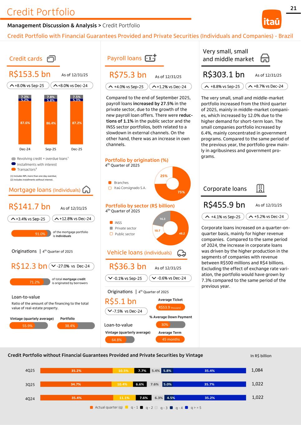 21 87.6% 86.4% 87.2% 5.2% 5.8% 5.3% 7.2% 7.8% 7.5% Dec-24 Sep-25 Dec-25 Credit Portfolio Management Discussion & Analysis > Credit Portfolio Credit Portfolio with Financial Guarantees Provided and Private Securities (Individuals and Companies) - Brazil Payroll loans R$75.3 bn As of 12/31/25 +4.0% vs Sep-25 +1.2% vs Dec-24 Credit cards R$153.5 bn As of 12/31/25 +8.0% vs Sep-25 +8.0% vs Dec-24 Compared to the end of September 2025, payroll loans increased by 27.5% in the private sector, due to the growth of the new payroll loan offers. There were reduc- tions of 1.1% in the public sector and the INSS sector portfolios, both related to a slowdown in external channels. On the other hand, there was an increase in own channels. 48.2 10.7 16.3 75% 25% Transactors² Installments with interest Revolving credit + overdue loans¹ Portfolio by origination (%) 4th Quarter of 2025 Branches Itaú Consignado S.A. Portfolio by sector (R$ billion) 4th Quarter of 2025 INSS Private sector Public sector Mortgage loans (Individuals) R$141.7 bn As of 12/31/25 +3.4% vs Sep-25 91.0% of the mortgage portfolio is Individuals Originations | 4th Quarter of 2025 R$12.3 bn -27.0% vs Dec-24 71.2% of total mortgage credit is originated by borrowers Loan-to-value Ratio of the amount of the financing to the total value of real-estate property. 55.9% 38.4% Vintage (quartely average) Vehicle loans (individuals) R$36.3 bn As of 12/31/25 -0.1% vs Sep-25 -0.6% vs Dec-24 (1) Includes NPL more than one day overdue; (2) includes installments without interest. Originations | 4th Quarter of 2025 R$5.1 bn -7.5% vs Dec-24 45 months 30% Average Ticket R$53.9 thousand Average Term % Average Down Payment Loan-to-value Vintage (quarterly average) +12.8% vs Dec-24 Portfolio Corporate loans R$455.9 bn As of 12/31/25 Corporate loans increased on a quarter-on- quarter basis, mainly for higher revenue companies. Compared to the same period of 2024, the increase in corporate loans was driven by the higher production in the segments of companies with revenue between R$500 millions and R$4 billions. Excluding the effect of exchange rate vari- ation, the portfolio would have grown by 7.3% compared to the same period of the previous year. +4.1% vs Sep-25 Very small, small and middle market R$303.1 bn As of 12/31/25 The very small, small and middle-market portfolio increased from the third quarter of 2025, mainly in middle-market compani- es, which increased by 12.0% due to the higher demand for short-term loan. The small companies portfolio increased by 6.4%, mainly concentrated in government programs. Compared to the same period of the previous year, the portfolio grew main- ly in agribusiness and government pro- grams. +8.8% vs Sep-25 35.4% 34.7% 35.2% 11.1% 10.4% 10.5% 7.6% 6.6% 7.7% 6.3% 7.6% 5.4% 4.5% 5.0% 5.8% 35.2% 35.7% 35.4% Credit Portfolio without Financial Guarantees Provided and Private Securities by Vintage In R$ billion q > = 5 q - 4 q - 3 q - 2 q - 1 Actual quarter (q) 1,084 1,022 1,022 4Q25 3Q25 4Q24 +5.2% vs Dec-24 +8.7% vs Dec-24 64.8%