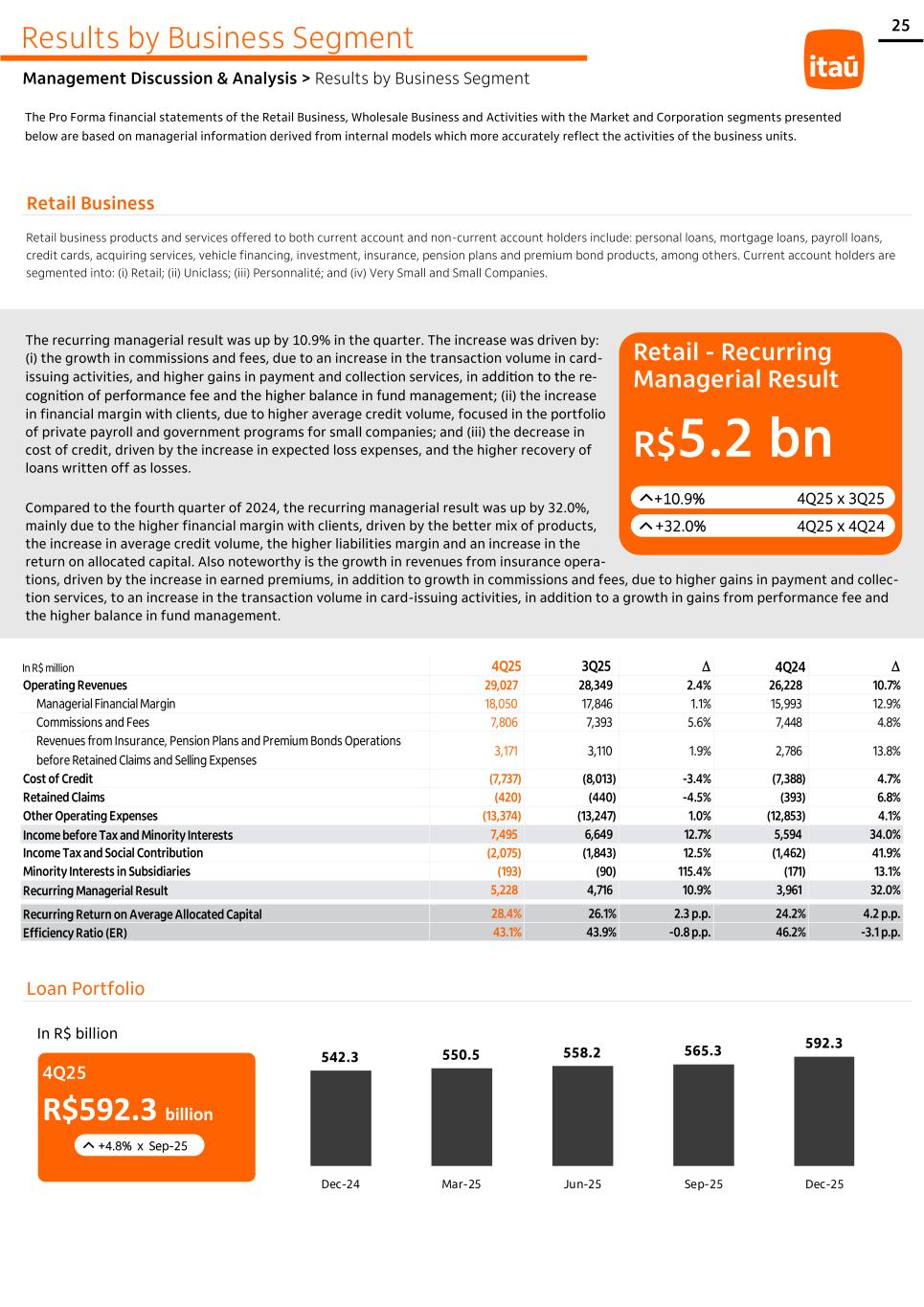 25 Results by Business Segment Management Discussion & Analysis > Results by Business Segment The recurring managerial result was up by 10.9% in the quarter. The increase was driven by: (i) the growth in commissions and fees, due to an increase in the transaction volume in card- issuing activities, and higher gains in payment and collection services, in addition to the re- cognition of performance fee and the higher balance in fund management; (ii) the increase in financial margin with clients, due to higher average credit volume, focused in the portfolio of private payroll and government programs for small companies; and (iii) the decrease in cost of credit, driven by the increase in expected loss expenses, and the higher recovery of loans written off as losses. Compared to the fourth quarter of 2024, the recurring managerial result was up by 32.0%, mainly due to the higher financial margin with clients, driven by the better mix of products, the increase in average credit volume, the higher liabilities margin and an increase in the return on allocated capital. Also noteworthy is the growth in revenues from insurance opera- tions, driven by the increase in earned premiums, in addition to growth in commissions and fees, due to higher gains in payment and collec- tion services, to an increase in the transaction volume in card-issuing activities, in addition to a growth in gains from performance fee and the higher balance in fund management. Retail - Recurring Managerial Result R$5.2 bn +10.9% +32.0% 4Q25 x 3Q25 4Q25 x 4Q24 Loan Portfolio In R$ billion 4Q25 R$592.3 billion +4.8% x Sep-25 The Pro Forma financial statements of the Retail Business, Wholesale Business and Activities with the Market and Corporation segments presented below are based on managerial information derived from internal models which more accurately reflect the activities of the business units. Retail Business Retail business products and services offered to both current account and non-current account holders include: personal loans, mortgage loans, payroll loans, credit cards, acquiring services, vehicle financing, investment, insurance, pension plans and premium bond products, among others. Current account holders are segmented into: (i) Retail; (ii) Uniclass; (iii) Personnalité; and (iv) Very Small and Small Companies. In R$ million 4Q25 3Q25 D 4Q24 D Operating Revenues 29,027 28,349 2.4% 26,228 10.7% Managerial Financial Margin 18,050 17,846 1.1% 15,993 12.9% Commissions and Fees 7,806 7,393 5.6% 7,448 4.8% Revenues from Insurance, Pension Plans and Premium Bonds Operations before Retained Claims and Selling Expenses 3,171 3,110 1.9% 2,786 13.8% Cost of Credit (7,737) (8,013) -3.4% (7,388) 4.7% Retained Claims (420) (440) -4.5% (393) 6.8% Other Operating Expenses (13,374) (13,247) 1.0% (12,853) 4.1% Income before Tax and Minority Interests 7,495 6,649 12.7% 5,594 34.0% Income Tax and Social Contribution (2,075) (1,843) 12.5% (1,462) 41.9% Minority Interests in Subsidiaries (193) (90) 115.4% (171) 13.1% Recurring Managerial Result 5,228 4,716 10.9% 3,961 32.0%- - Recurring Return on Average Allocated Capital 28.4% 26.1% 2.3 p.p. 24.2% 4.2 p.p. Efficiency Ratio (ER) 43.1% 43.9% -0.8 p.p. 46.2% -3.1 p.p. 542.3 550.5 558.2 565.3 592.3 Dec-24 Mar-25 Jun-25 Sep-25 Dec-25