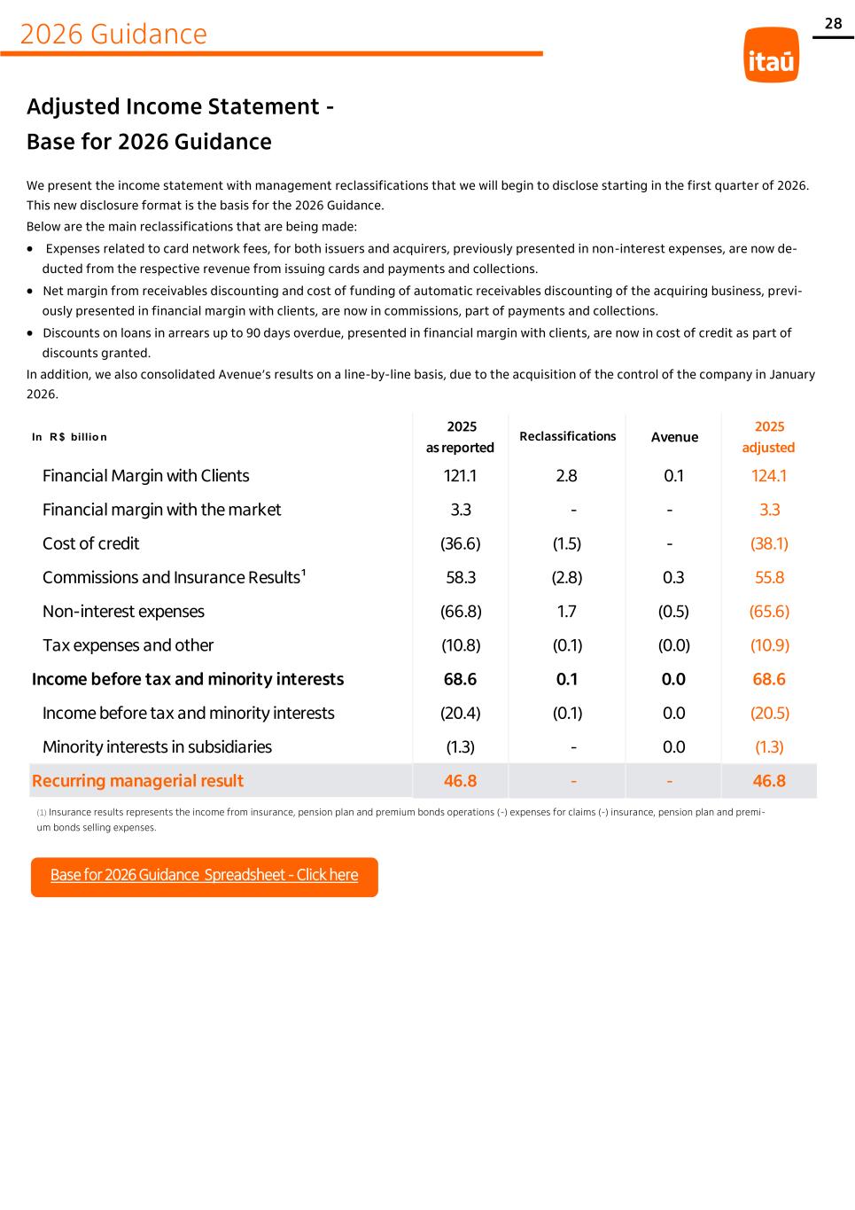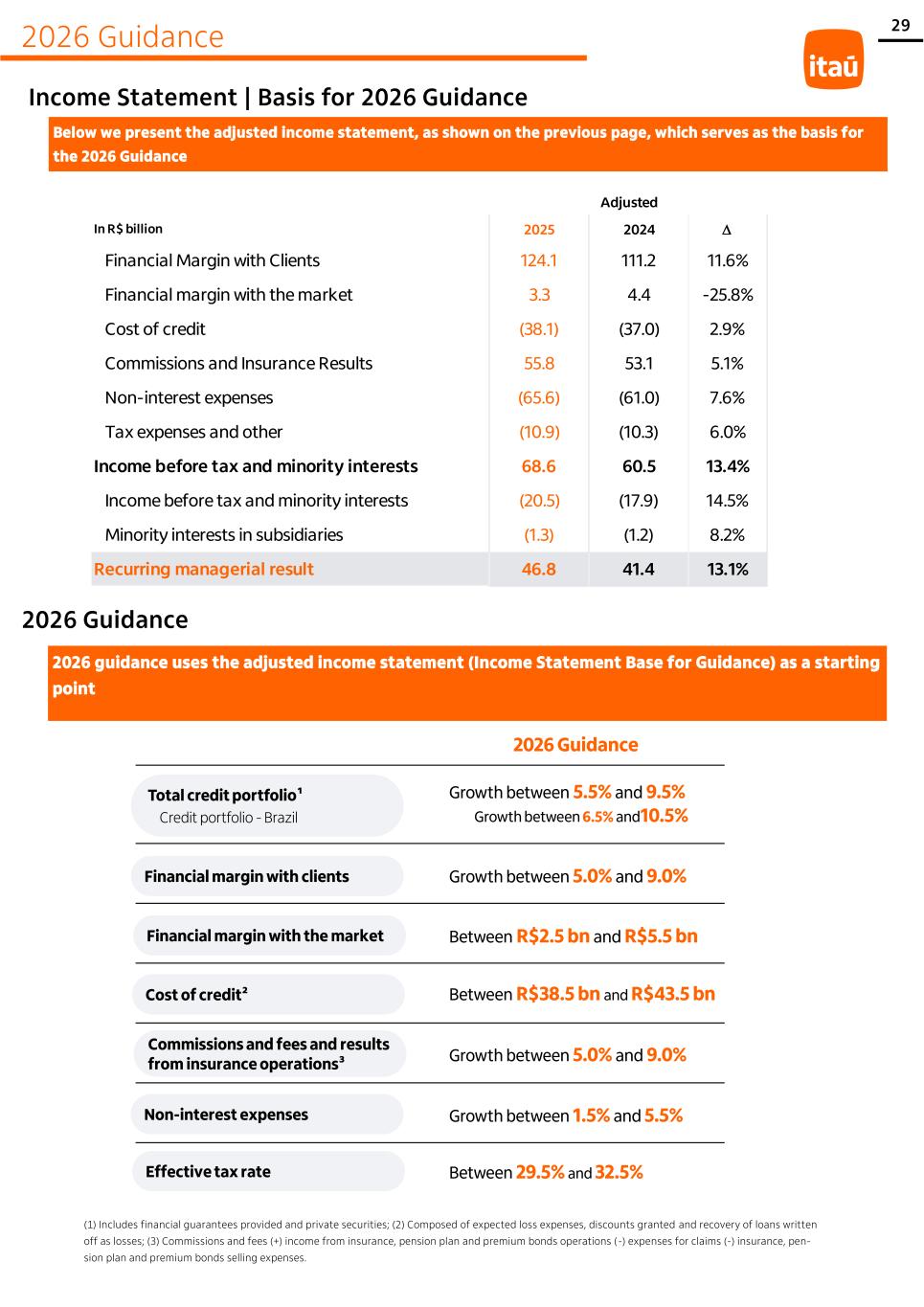 2026 Guidance 28 We present the income statement with management reclassifications that we will begin to disclose starting in the first quarter of 2026. This new disclosure format is the basis for the 2026 Guidance. Below are the main reclassifications that are being made: • Expenses related to card network fees, for both issuers and acquirers, previously presented in non-interest expenses, are now de- ducted from the respective revenue from issuing cards and payments and collections. • Net margin from receivables discounting and cost of funding of automatic receivables discounting of the acquiring business, previ- ously presented in financial margin with clients, are now in commissions, part of payments and collections. • Discounts on loans in arrears up to 90 days overdue, presented in financial margin with clients, are now in cost of credit as part of discounts granted. In addition, we also consolidated Avenue’s results on a line-by-line basis, due to the acquisition of the control of the company in January 2026. (1) Insurance results represents the income from insurance, pension plan and premium bonds operations (-) expenses for claims (-) insurance, pension plan and premi- um bonds selling expenses. Adjusted Income Statement - Base for 2026 Guidance In R $ billio n 2025 as reported Reclassifications Avenue 2025 adjusted Financial Margin with Clients 121.1 2.8 0.1 124.1 Financial margin with the market 3.3 - - 3.3 Cost of credit (36.6) (1.5) - (38.1) Commissions and Insurance Results¹ 58.3 (2.8) 0.3 55.8 Non-interest expenses (66.8) 1.7 (0.5) (65.6) Tax expenses and other (10.8) (0.1) (0.0) (10.9) Income before tax and minority interests 68.6 0.1 0.0 68.6 Income before tax and minority interests (20.4) (0.1) 0.0 (20.5) Minority interests in subsidiaries (1.3) - 0.0 (1.3) Recurring managerial result 46.8 - - 46.8 Base for 2026 Guidance Spreadsheet - Click here