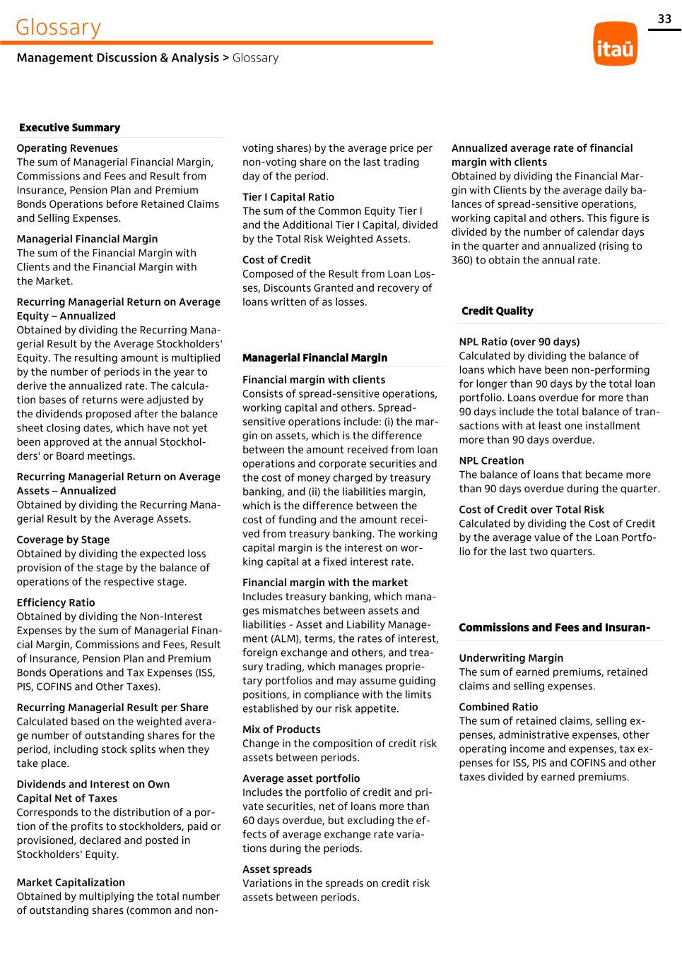 33 Glossary Management Discussion & Analysis > Glossary Operating Revenues The sum of Managerial Financial Margin, Commissions and Fees and Result from Insurance, Pension Plan and Premium Bonds Operations before Retained Claims and Selling Expenses. Managerial Financial Margin The sum of the Financial Margin with Clients and the Financial Margin with the Market. Recurring Managerial Return on Average Equity – Annualized Obtained by dividing the Recurring Mana- gerial Result by the Average Stockholders’ Equity. The resulting amount is multiplied by the number of periods in the year to derive the annualized rate. The calcula- tion bases of returns were adjusted by the dividends proposed after the balance sheet closing dates, which have not yet been approved at the annual Stockhol- ders' or Board meetings. Recurring Managerial Return on Average Assets – Annualized Obtained by dividing the Recurring Mana- gerial Result by the Average Assets. Coverage by Stage Obtained by dividing the expected loss provision of the stage by the balance of operations of the respective stage. Efficiency Ratio Obtained by dividing the Non-Interest Expenses by the sum of Managerial Finan- cial Margin, Commissions and Fees, Result of Insurance, Pension Plan and Premium Bonds Operations and Tax Expenses (ISS, PIS, COFINS and Other Taxes). Recurring Managerial Result per Share Calculated based on the weighted avera- ge number of outstanding shares for the period, including stock splits when they take place. Dividends and Interest on Own Capital Net of Taxes Corresponds to the distribution of a por- tion of the profits to stockholders, paid or provisioned, declared and posted in Stockholders' Equity. Market Capitalization Obtained by multiplying the total number of outstanding shares (common and non- voting shares) by the average price per non-voting share on the last trading day of the period. Tier I Capital Ratio The sum of the Common Equity Tier I and the Additional Tier I Capital, divided by the Total Risk Weighted Assets. Cost of Credit Composed of the Result from Loan Los- ses, Discounts Granted and recovery of loans written of as losses. Annualized average rate of financial margin with clients Obtained by dividing the Financial Mar- gin with Clients by the average daily ba- lances of spread-sensitive operations, working capital and others. This figure is divided by the number of calendar days in the quarter and annualized (rising to 360) to obtain the annual rate. Executive Summary Managerial Financial Margin Financial margin with clients Consists of spread-sensitive operations, working capital and others. Spread- sensitive operations include: (i) the mar- gin on assets, which is the difference between the amount received from loan operations and corporate securities and the cost of money charged by treasury banking, and (ii) the liabilities margin, which is the difference between the cost of funding and the amount recei- ved from treasury banking. The working capital margin is the interest on wor- king capital at a fixed interest rate. Financial margin with the market Includes treasury banking, which mana- ges mismatches between assets and liabilities - Asset and Liability Manage- ment (ALM), terms, the rates of interest, foreign exchange and others, and trea- sury trading, which manages proprie- tary portfolios and may assume guiding positions, in compliance with the limits established by our risk appetite. Mix of Products Change in the composition of credit risk assets between periods. Average asset portfolio Includes the portfolio of credit and pri- vate securities, net of loans more than 60 days overdue, but excluding the ef- fects of average exchange rate varia- tions during the periods. Asset spreads Variations in the spreads on credit risk assets between periods. Credit Quality NPL Ratio (over 90 days) Calculated by dividing the balance of loans which have been non-performing for longer than 90 days by the total loan portfolio. Loans overdue for more than 90 days include the total balance of tran- sactions with at least one installment more than 90 days overdue. NPL Creation The balance of loans that became more than 90 days overdue during the quarter. Cost of Credit over Total Risk Calculated by dividing the Cost of Credit by the average value of the Loan Portfo- lio for the last two quarters. Commissions and Fees and Insuran- Underwriting Margin The sum of earned premiums, retained claims and selling expenses. Combined Ratio The sum of retained claims, selling ex- penses, administrative expenses, other operating income and expenses, tax ex- penses for ISS, PIS and COFINS and other taxes divided by earned premiums.