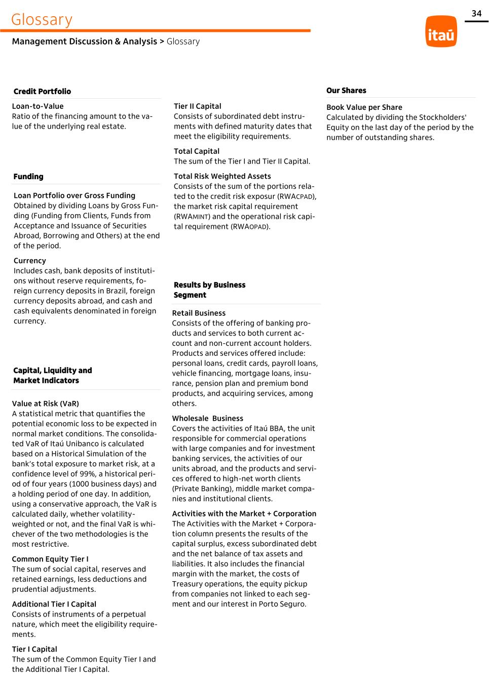 34 Loan-to-Value Ratio of the financing amount to the va- lue of the underlying real estate. Credit Portfolio Funding Loan Portfolio over Gross Funding Obtained by dividing Loans by Gross Fun- ding (Funding from Clients, Funds from Acceptance and Issuance of Securities Abroad, Borrowing and Others) at the end of the period. Currency Includes cash, bank deposits of instituti- ons without reserve requirements, fo- reign currency deposits in Brazil, foreign currency deposits abroad, and cash and cash equivalents denominated in foreign currency. Capital, Liquidity and Market Indicators Value at Risk (VaR) A statistical metric that quantifies the potential economic loss to be expected in normal market conditions. The consolida- ted VaR of Itaú Unibanco is calculated based on a Historical Simulation of the bank’s total exposure to market risk, at a confidence level of 99%, a historical peri- od of four years (1000 business days) and a holding period of one day. In addition, using a conservative approach, the VaR is calculated daily, whether volatility- weighted or not, and the final VaR is whi- chever of the two methodologies is the most restrictive. Common Equity Tier I The sum of social capital, reserves and retained earnings, less deductions and prudential adjustments. Additional Tier I Capital Consists of instruments of a perpetual nature, which meet the eligibility require- ments. Tier I Capital The sum of the Common Equity Tier I and the Additional Tier I Capital. Tier II Capital Consists of subordinated debt instru- ments with defined maturity dates that meet the eligibility requirements. Total Capital The sum of the Tier I and Tier II Capital. Total Risk Weighted Assets Consists of the sum of the portions rela- ted to the credit risk exposur (RWACPAD), the market risk capital requirement (RWAMINT) and the operational risk capi- tal requirement (RWAOPAD). Results by Business Segment Retail Business Consists of the offering of banking pro- ducts and services to both current ac- count and non-current account holders. Products and services offered include: personal loans, credit cards, payroll loans, vehicle financing, mortgage loans, insu- rance, pension plan and premium bond products, and acquiring services, among others. Wholesale Business Covers the activities of Itaú BBA, the unit responsible for commercial operations with large companies and for investment banking services, the activities of our units abroad, and the products and servi- ces offered to high-net worth clients (Private Banking), middle market compa- nies and institutional clients. Activities with the Market + Corporation The Activities with the Market + Corpora- tion column presents the results of the capital surplus, excess subordinated debt and the net balance of tax assets and liabilities. It also includes the financial margin with the market, the costs of Treasury operations, the equity pickup from companies not linked to each seg- ment and our interest in Porto Seguro. Our Shares Book Value per Share Calculated by dividing the Stockholders' Equity on the last day of the period by the number of outstanding shares. Glossary Management Discussion & Analysis > Glossary
