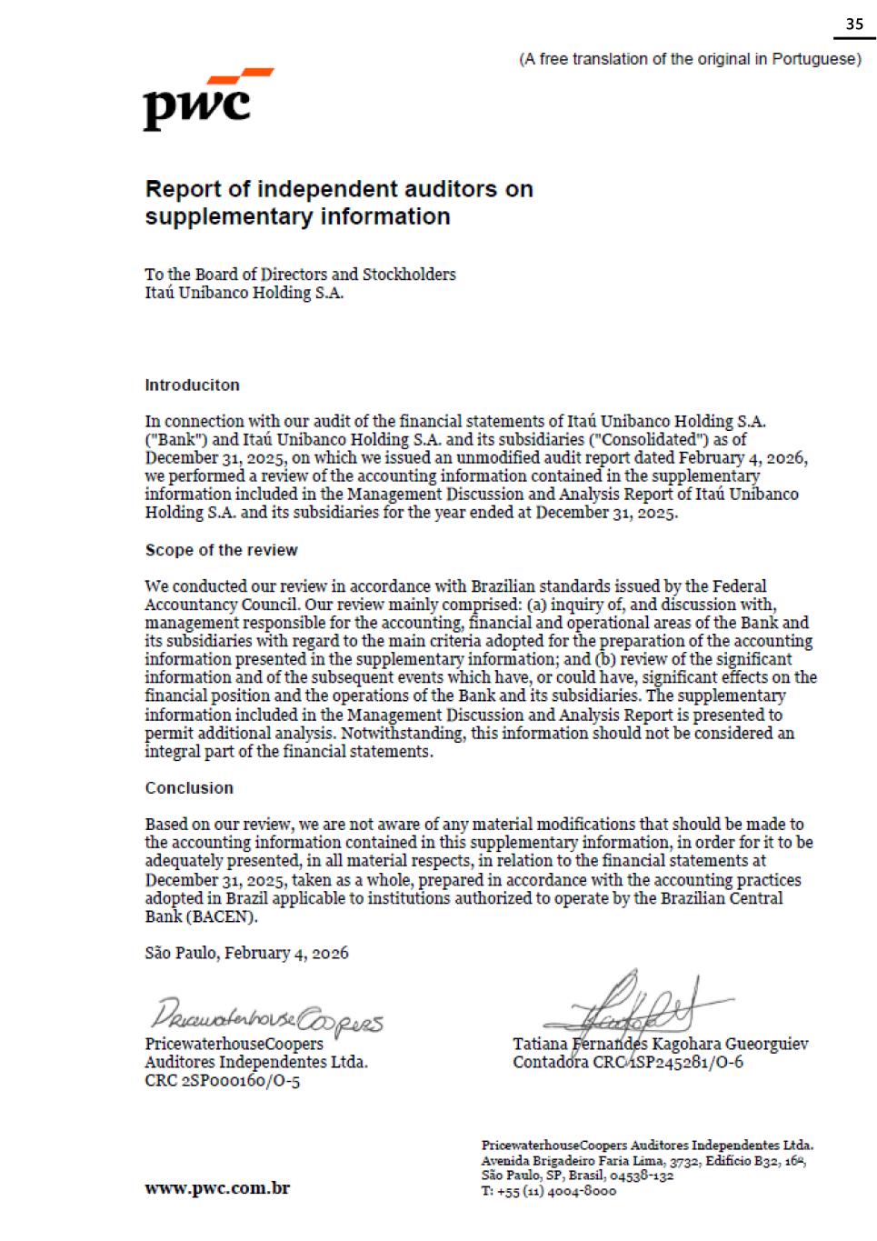 Itaú Unibanco Holding S.A. – Complete Financial Statements – December 31, 2025 Itaú Unibanco Holding S.A. 8 Conclude on the appropriateness of management's use of the going concern basis of accounting and, based on the audit evidence obtained, whether a material uncertainty exists related to events or conditions that may cast significant doubt on the ability of the Bank and its subsidiaries, as a whole, to continue as a going concern. If we conclude that a material uncertainty exists, we are required to draw attention in our auditor's report to the related disclosures in the parent company and consolidated financial statements or, if such disclosures are inadequate, to modify our opinion. Our conclusions are based on the audit evidence obtained up to the date of our auditor's report. However, future events or conditions may cause the Institution and its subsidiaries, as a whole, to cease to continue as a going concern. Plan and perform the group audit to obtain sufficient appropriate audit evidence regarding the financial information of the entities or business units within the Group as a basis for forming an opinion on the parent company and consolidated financial statements. We are responsible for the direction, supervision and review of the audit work performed for purposes of the group audit. We remain solely responsible for our audit opinion. We communicate with those charged with governance regarding, among other matters, the planned scope and timing of the audit and significant audit findings, including any significant deficiencies in internal control that we identify during our audit. We also provide those charged with governance with a statement that we have complied with relevant ethical requirements regarding independence, and to communicate with them all relationships and other matters that may reasonably be thought to bear on our independence, and where applicable, actions taken to eliminate threats to our independence or safeguards applied. From the matters communicated with those charged with governance, we determine those matters that were of most significance in the audit of the financial statements of the current year and six-month period and are therefore the Key Audit Matters. We describe these matters in our auditor's report unless law or regulation precludes public disclosure about the matter or when, in extremely rare circumstances, we determine that a matter should not be communicated in our report because the adverse consequences of doing so would reasonably be expected to outweigh the public interest benefits of such communication. São Paulo, February 4, 2026 PricewaterhouseCoopers Auditores Independentes Ltda. CRC 2SP000160/O-5 Tatiana Fernandes Kagohara Gueorguiev Contadora CRC 1SP245281/O-6 166