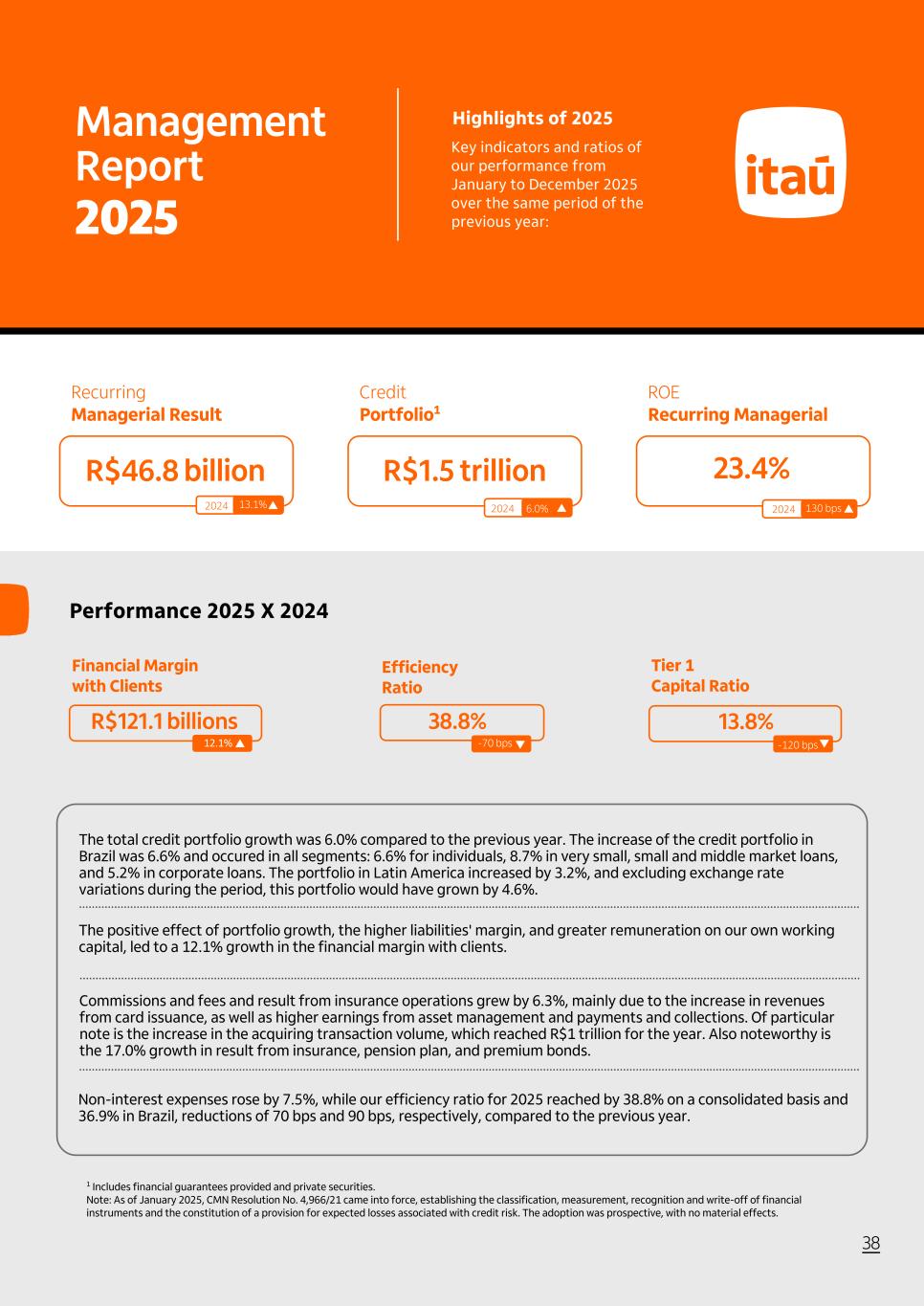 38 2024 Management Report Highlights of 2025 Key indicators and ratios of our performance from January to December 2025 over the same period of the previous year:2025 Recurring Managerial Result R$46.8 billion R$1.5 trillion 23.4% Performance 2025 X 2024 Financial Margin with Clients R$121.1 billions 2024 13.1% 6.0% 2024 12.1% 38.8% -70 bps Efficiency Ratio Tier 1 Capital Ratio 13.8% -120 bps The total credit portfolio growth was 6.0% compared to the previous year. The increase of the credit portfolio in Brazil was 6.6% and occured in all segments: 6.6% for individuals, 8.7% in very small, small and middle market loans, and 5.2% in corporate loans. The portfolio in Latin America increased by 3.2%, and excluding exchange rate variations during the period, this portfolio would have grown by 4.6%. The positive effect of portfolio growth, the higher liabilities' margin, and greater remuneration on our own working capital, led to a 12.1% growth in the financial margin with clients. Commissions and fees and result from insurance operations grew by 6.3%, mainly due to the increase in revenues from card issuance, as well as higher earnings from asset management and payments and collections. Of particular note is the increase in the acquiring transaction volume, which reached R$1 trillion for the year. Also noteworthy is the 17.0% growth in result from insurance, pension plan, and premium bonds. Non-interest expenses rose by 7.5%, while our efficiency ratio for 2025 reached by 38.8% on a consolidated basis and 36.9% in Brazil, reductions of 70 bps and 90 bps, respectively, compared to the previous year. 130 bps Access our full report Credit Portfolio1 ROE Recurring Managerial 1 Includes financial guarantees provided and private securities. Note: As of January 2025, CMN Resolution No. 4,966/21 came into force, establishing the classification, measurement, recognition and write-off of financial instruments and the constitution of a provision for expected losses associated with credit risk. The adoption was prospective, with no material effects.
