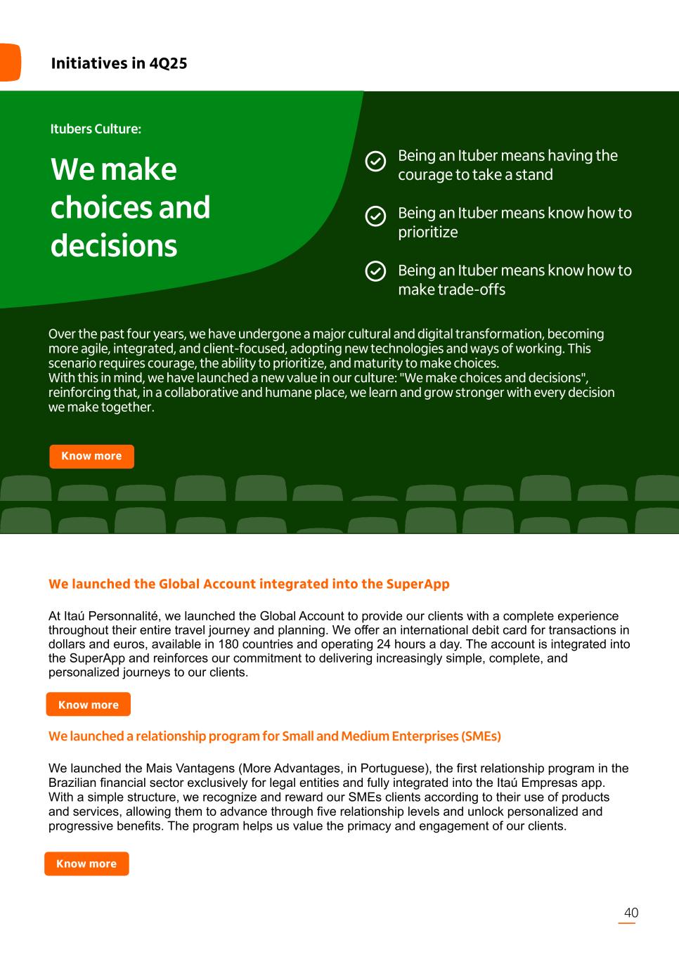Know more Over the past four years, we have undergone a major cultural and digital transformation, becoming more agile, integrated, and client-focused, adopting new technologies and ways of working. This scenario requires courage, the ability to prioritize, and maturity to make choices. With this in mind, we have launched a new value in our culture: "We make choices and decisions", reinforcing that, in a collaborative and humane place, we learn and grow stronger with every decision we make together. We launched the Global Account integrated into the SuperApp At Itaú Personnalité, we launched the Global Account to provide our clients with a complete experience throughout their entire travel journey and planning. We offer an international debit card for transactions in dollars and euros, available in 180 countries and operating 24 hours a day. The account is integrated into the SuperApp and reinforces our commitment to delivering increasingly simple, complete, and personalized journeys to our clients. We launched a relationship program for Small and Medium Enterprises (SMEs) We launched the Mais Vantagens (More Advantages, in Portuguese), the first relationship program in the Brazilian financial sector exclusively for legal entities and fully integrated into the Itaú Empresas app. With a simple structure, we recognize and reward our SMEs clients according to their use of products and services, allowing them to advance through five relationship levels and unlock personalized and progressive benefits. The program helps us value the primacy and engagement of our clients. 40 Being an Ituber means having the courage to take a stand Being an Ituber means know how to prioritize Being an Ituber means know how to make trade-offs Initiatives in 4Q25 Know more Know more Itubers Culture: We make choices and decisions
