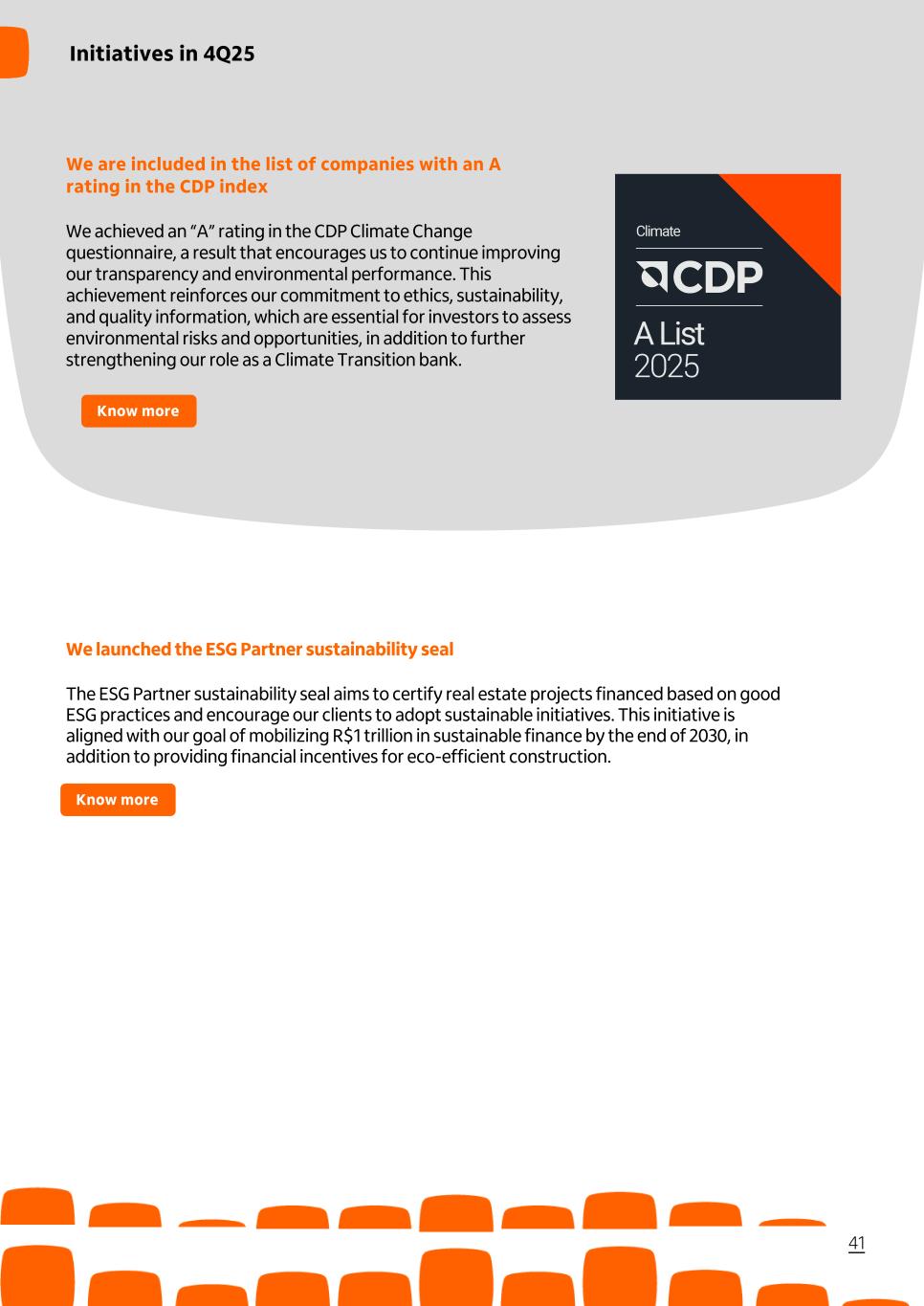 We are included in the list of companies with an A rating in the CDP index We achieved an “A” rating in the CDP Climate Change questionnaire, a result that encourages us to continue improving our transparency and environmental performance. This achievement reinforces our commitment to ethics, sustainability, and quality information, which are essential for investors to assess environmental risks and opportunities, in addition to further strengthening our role as a Climate Transition bank. We launched the ESG Partner sustainability seal The ESG Partner sustainability seal aims to certify real estate projects financed based on good ESG practices and encourage our clients to adopt sustainable initiatives. This initiative is aligned with our goal of mobilizing R$1 trillion in sustainable finance by the end of 2030, in addition to providing financial incentives for eco-efficient construction. 41 Know more Initiatives in 4Q25 Know more