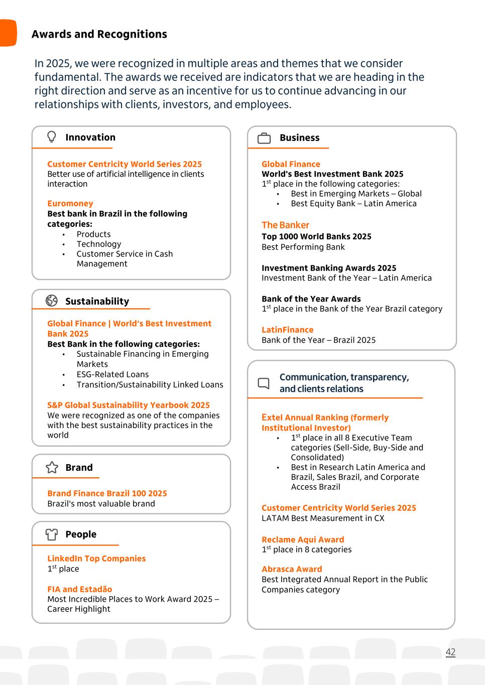 In 2025, we were recognized in multiple areas and themes that we consider fundamental. The awards we received are indicators that we are heading in the right direction and serve as an incentive for us to continue advancing in our relationships with clients, investors, and employees. 42 Awards and Recognitions LinkedIn Top Companies 1st place FIA and Estadão Most Incredible Places to Work Award 2025 – Career Highlight Customer Centricity World Series 2025 Better use of artificial intelligence in clients interaction Euromoney Best bank in Brazil in the following categories: • Products • Technology • Customer Service in Cash Management Extel Annual Ranking (formerly Institutional Investor) • 1st place in all 8 Executive Team categories (Sell-Side, Buy-Side and Consolidated) • Best in Research Latin America and Brazil, Sales Brazil, and Corporate Access Brazil Customer Centricity World Series 2025 LATAM Best Measurement in CX Reclame Aqui Award 1st place in 8 categories Abrasca Award Best Integrated Annual Report in the Public Companies category Global Finance World's Best Investment Bank 2025 1st place in the following categories: • Best in Emerging Markets – Global • Best Equity Bank – Latin America The Banker Top 1000 World Banks 2025 Best Performing Bank Investment Banking Awards 2025 Investment Bank of the Year – Latin America Bank of the Year Awards 1st place in the Bank of the Year Brazil category LatinFinance Bank of the Year – Brazil 2025 Global Finance | World’s Best Investment Bank 2025 Best Bank in the following categories: • Sustainable Financing in Emerging Markets • ESG-Related Loans • Transition/Sustainability Linked Loans S&P Global Sustainability Yearbook 2025 We were recognized as one of the companies with the best sustainability practices in the world Brand Finance Brazil 100 2025 Brazil's most valuable brand Innovation Sustainability Brand People Business Communication, transparency, and clients relations