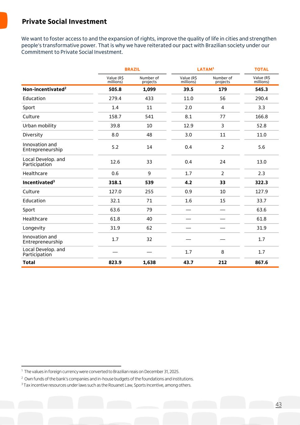 We want to foster access to and the expansion of rights, improve the quality of life in cities and strengthen people’s transformative power. That is why we have reiterated our pact with Brazilian society under our Commitment to Private Social Investment. BRAZIL LATAM1 TOTAL Value (R$ millions) Number of projects Value (R$ millions) Number of projects Value (R$ millions) Non-incentivated2 505.8 1,099 39.5 179 545.3 Education 279.4 433 11.0 56 290.4 Sport 1.4 11 2.0 4 3.3 Culture 158.7 541 8.1 77 166.8 Urban mobility 39.8 10 12.9 3 52.8 Diversity 8.0 48 3.0 11 11.0 Innovation and Entrepreneurship 5.2 14 0.4 2 5.6 Local Develop. and Participation 12.6 33 0.4 24 13.0 Healthcare 0.6 9 1.7 2 2.3 Incentivated3 318.1 539 4.2 33 322.3 Culture 127.0 255 0.9 10 127.9 Education 32.1 71 1.6 15 33.7 Sport 63.6 79 — — 63.6 Healthcare 61.8 40 — — 61.8 Longevity 31.9 62 — — 31.9 Innovation and Entrepreneurship 1.7 32 — — 1.7 Local Develop. and Participation — — 1.7 8 1.7 Total 823.9 1,638 43.7 212 867.6 43 1 The values in foreign currency were converted to Brazilian reais on December 31, 2025. 2 Own funds of the bank’s companies and in-house budgets of the foundations and institutions. 3 Tax incentive resources under laws such as the Rouanet Law, Sports Incentive, among others. Private Social Investment