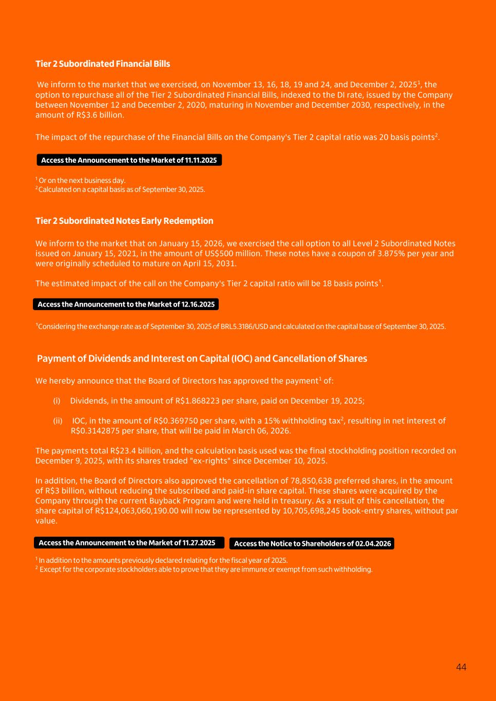 Tier 2 Subordinated Financial Bills We inform to the market that we exercised, on November 13, 16, 18, 19 and 24, and December 2, 20251, the option to repurchase all of the Tier 2 Subordinated Financial Bills, indexed to the DI rate, issued by the Company between November 12 and December 2, 2020, maturing in November and December 2030, respectively, in the amount of R$3.6 billion. The impact of the repurchase of the Financial Bills on the Company's Tier 2 capital ratio was 20 basis points2. 1 Or on the next business day. 2 Calculated on a capital basis as of September 30, 2025. Tier 2 Subordinated Notes Early Redemption We inform to the market that on January 15, 2026, we exercised the call option to all Level 2 Subordinated Notes issued on January 15, 2021, in the amount of US$500 million. These notes have a coupon of 3.875% per year and were originally scheduled to mature on April 15, 2031. The estimated impact of the call on the Company's Tier 2 capital ratio will be 18 basis points¹. ¹Considering the exchange rate as of September 30, 2025 of BRL5.3186/USD and calculated on the capital base of September 30, 2025. Payment of Dividends and Interest on Capital (IOC) and Cancellation of Shares We hereby announce that the Board of Directors has approved the payment1 of: (i) Dividends, in the amount of R$1.868223 per share, paid on December 19, 2025; (ii) IOC, in the amount of R$0.369750 per share, with a 15% withholding tax2, resulting in net interest of R$0.3142875 per share, that will be paid in March 06, 2026. The payments total R$23.4 billion, and the calculation basis used was the final stockholding position recorded on December 9, 2025, with its shares traded "ex-rights" since December 10, 2025. In addition, the Board of Directors also approved the cancellation of 78,850,638 preferred shares, in the amount of R$3 billion, without reducing the subscribed and paid-in share capital. These shares were acquired by the Company through the current Buyback Program and were held in treasury. As a result of this cancellation, the share capital of R$124,063,060,190.00 will now be represented by 10,705,698,245 book-entry shares, without par value. 1 In addition to the amounts previously declared relating for the fiscal year of 2025. 2 Except for the corporate stockholders able to prove that they are immune or exempt from such withholding. 44 Access the Announcement to the Market of 11.11.2025 Access the Announcement to the Market of 12.16.2025 Access the Announcement to the Market of 11.27.2025 Access the Notice to Shareholders of 02.04.2026