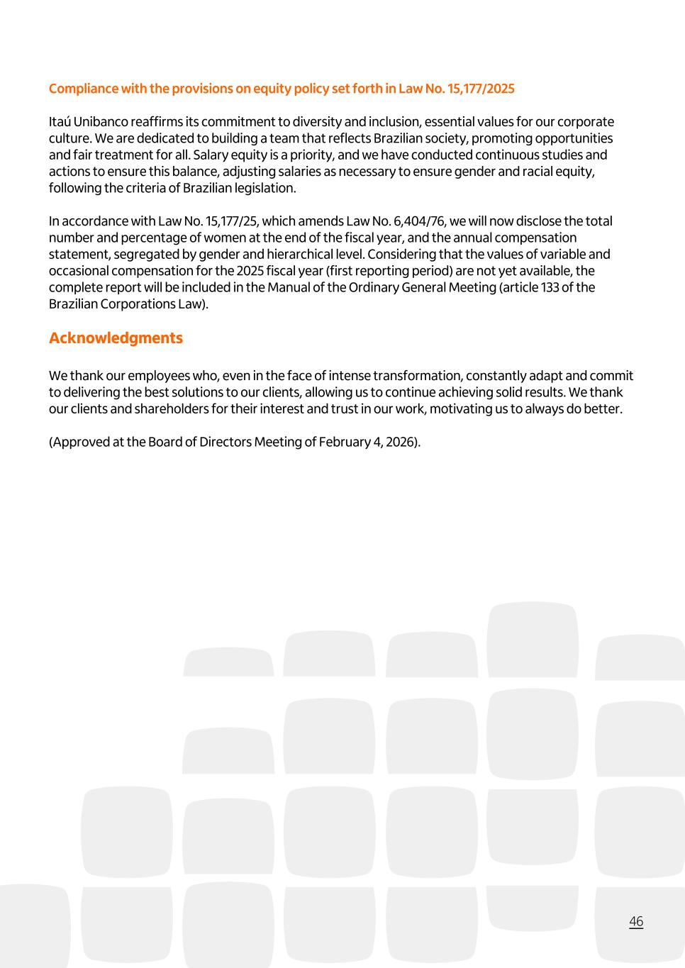 Compliance with the provisions on equity policy set forth in Law No. 15,177/2025 Itaú Unibanco reaffirms its commitment to diversity and inclusion, essential values for our corporate culture. We are dedicated to building a team that reflects Brazilian society, promoting opportunities and fair treatment for all. Salary equity is a priority, and we have conducted continuous studies and actions to ensure this balance, adjusting salaries as necessary to ensure gender and racial equity, following the criteria of Brazilian legislation. In accordance with Law No. 15,177/25, which amends Law No. 6,404/76, we will now disclose the total number and percentage of women at the end of the fiscal year, and the annual compensation statement, segregated by gender and hierarchical level. Considering that the values of variable and occasional compensation for the 2025 fiscal year (first reporting period) are not yet available, the complete report will be included in the Manual of the Ordinary General Meeting (article 133 of the Brazilian Corporations Law). Acknowledgments We thank our employees who, even in the face of intense transformation, constantly adapt and commit to delivering the best solutions to our clients, allowing us to continue achieving solid results. We thank our clients and shareholders for their interest and trust in our work, motivating us to always do better. (Approved at the Board of Directors Meeting of February 4, 2026). 46