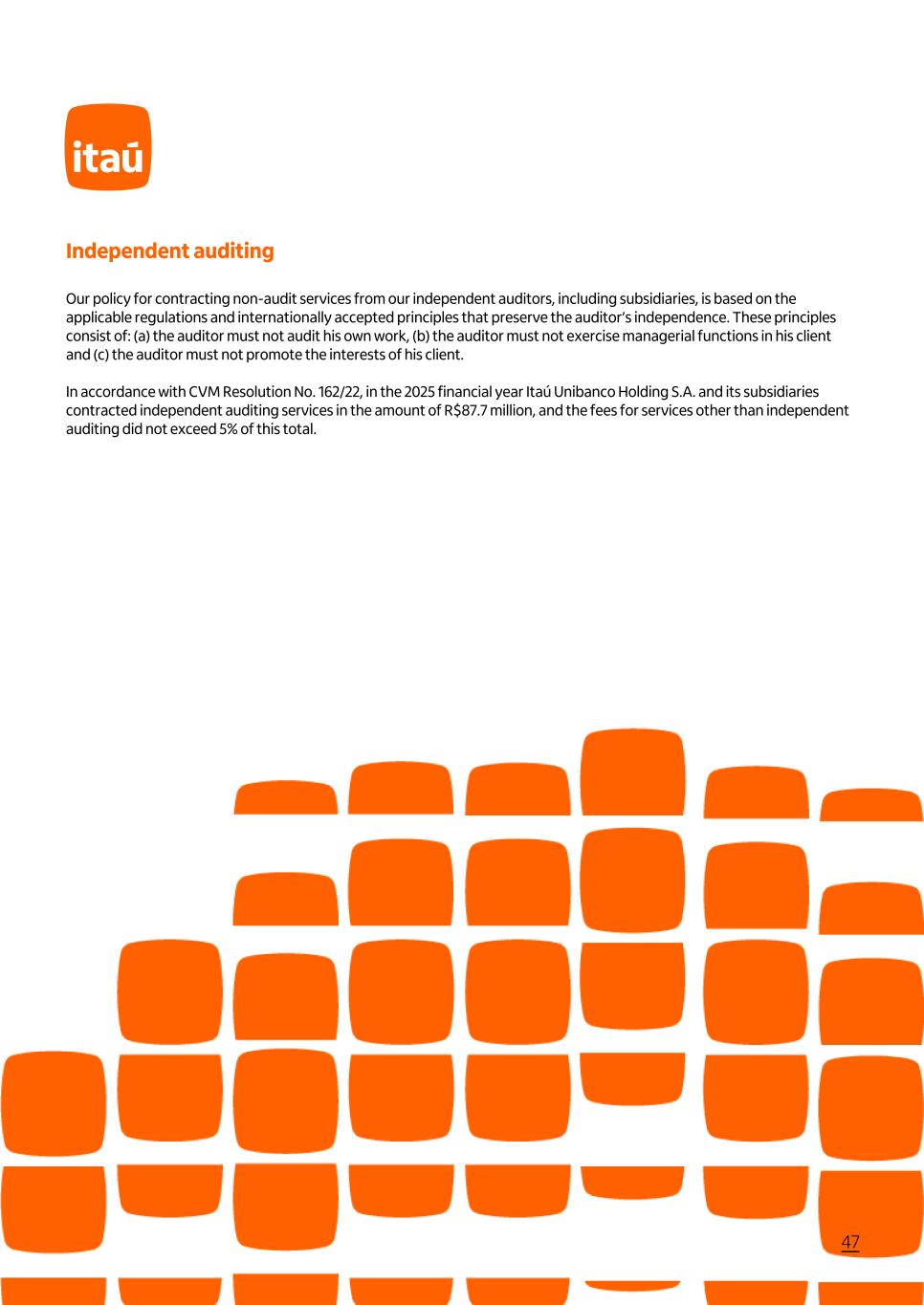 Independent auditing Our policy for contracting non-audit services from our independent auditors, including subsidiaries, is based on the applicable regulations and internationally accepted principles that preserve the auditor’s independence. These principles consist of: (a) the auditor must not audit his own work, (b) the auditor must not exercise managerial functions in his client and (c) the auditor must not promote the interests of his client. In accordance with CVM Resolution No. 162/22, in the 2025 financial year Itaú Unibanco Holding S.A. and its subsidiaries contracted independent auditing services in the amount of R$87.7 million, and the fees for services other than independent auditing did not exceed 5% of this total. 47
