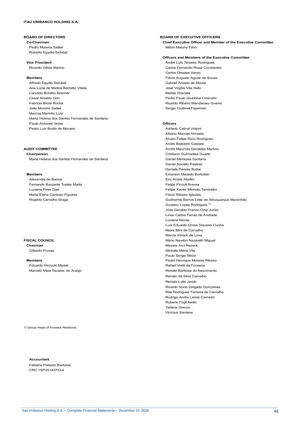 Itaú Unibanco Holding S.A. – Complete Financial Statements – December 31, 2025 ITAÚ UNIBANCO HOLDING S.A. BOARD OF DIRECTORS BOARD OF EXECUTIVE OFFICERS Co-Chairmen Chief Executive Officer and Member of the Executive Committee Pedro Moreira Salles Milton Maluhy Filho Roberto Egydio Setubal Officers and Members of the Executive Committee Vice President André Luís Teixeira Rodrigues Ricardo Villela Marino Carlos Fernando Rossi Constantini Carlos Orestes Vanzo Members Flávio Augusto Aguiar de Souza Alfredo Egydio Setubal Gabriel Amado de Moura Ana Lúcia de Mattos Barretto Villela José Virgílio Vita Neto Candido Botelho Bracher Matias Granata Cesar Nivaldo Gon Pedro Paulo Giubbina Lorenzini Fabricio Bloisi Rocha Ricardo Ribeiro Mandacaru Guerra João Moreira Salles Sergio Guillinet Fajerman Marcos Marinho Lutz Maria Helena dos Santos Fernandes de Santana Paulo Antunes Veras Officers Pedro Luiz Bodin de Moraes Adriano Cabral Volpini Albano Manoel Almeida Álvaro Felipe Rizzi Rodrigues Andre Balestrin Cestare AUDIT COMMITTEE André Maurício Geraldes Martins Chairperson Cristiano Guimarães Duarte Maria Helena dos Santos Fernandes de Santana Daniel Menezes Santana Daniel Sposito Pastore Daniela Pereira Bottai Members Emerson Macedo Bortoloto Alexandre de Barros Eric André Altafim Fernando Barçante Tostes Malta Felipe Piccoli Aversa Luciana Pires Dias Felipe Xavier Minhoto Tambelini Maria Elena Cardoso Figueira Flavio Ribeiro Iglesias Rogério Carvalho Braga Guilherme Barros Leite de Albuquerque Maranhão Gustavo Lopes Rodrigues (1) José Geraldo Franco Ortiz Junior Lineu Carlos Ferraz de Andrade Luciana Nicola Luís Eduardo Gross Siqueira Cunha Maira Blini de Carvalho Marcia Kinsch de Lima FISCAL COUNCIL Mário Newton Nazareth Miguel Chairman Mayara Arci Rezeck Gilberto Frussa Michele Maria Vita Paulo Sergio Miron Members Pedro Henrique Moreira Ribeiro Eduardo Hiroyuki Miyaki Rafael Vietti da Fonseca Marcelo Maia Tavares de Araújo Renato Barbosa do Nascimento Renato da Silva Carvalho Renato Lulia Jacob Ricardo Nuno Delgado Gonçalves Rita Rodrigues Ferreira de Carvalho Rodrigo Andre Leiras Carneiro Rubens Fogli Netto Tatiana Grecco Vinícius Santana 1) Group Head of Investor Relations. Accountant Fabiana Palazzo Barbosa CRC 1SP251437/O-4 48