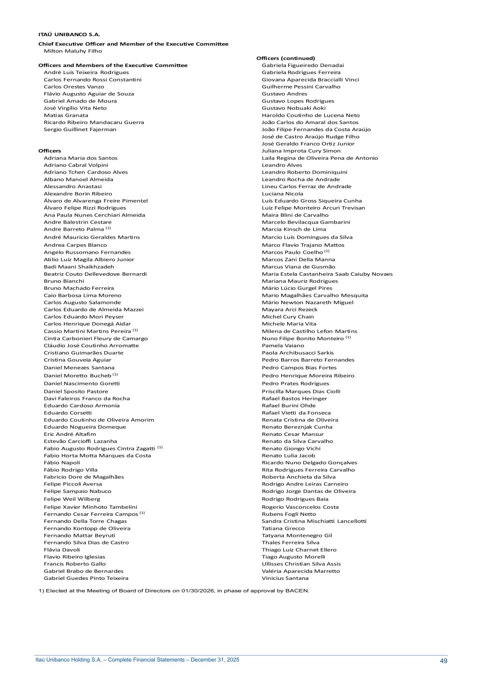Itaú Unibanco Holding S.A. – Complete Financial Statements – December 31, 2025 ITAÚ UNIBANCO S.A. Chief Executive Officer and Member of the Executive Committee Milton Maluhy Filho Officers (continued) Officers and Members of the Executive Committee Gabriela Figueiredo Denadai André Luís Teixeira Rodrigues Gabriela Rodrigues Ferreira Carlos Fernando Rossi Constantini Giovana Aparecida Braccialli Vinci Carlos Orestes Vanzo Guilherme Pessini Carvalho Flávio Augusto Aguiar de Souza Gustavo Andres Gabriel Amado de Moura Gustavo Lopes Rodrigues José Virgílio Vita Neto Gustavo Nobuaki Aoki Matias Granata Haroldo Coutinho de Lucena Neto Ricardo Ribeiro Mandacaru Guerra João Carlos do Amaral dos Santos Sergio Guillinet Fajerman João Filipe Fernandes da Costa Araújo José de Castro Araújo Rudge Filho José Geraldo Franco Ortiz Junior Officers Juliana Improta Cury Simon Adriana Maria dos Santos Laila Regina de Oliveira Pena de Antonio Adriano Cabral Volpini Leandro Alves Adriano Tchen Cardoso Alves Leandro Roberto Dominiquini Albano Manoel Almeida Leandro Rocha de Andrade Alessandro Anastasi Lineu Carlos Ferraz de Andrade Alexandre Borin Ribeiro Luciana Nicola Álvaro de Alvarenga Freire Pimentel Luís Eduardo Gross Siqueira Cunha Álvaro Felipe Rizzi Rodrigues Luiz Felipe Monteiro Arcuri Trevisan Ana Paula Nunes Cerchiari Almeida Maira Blini de Carvalho Andre Balestrin Cestare Marcelo Bevilacqua Gambarini Andre Barreto Palma (1) Marcia Kinsch de Lima André Mauricio Geraldes Martins Marcio Luís Domingues da Silva Andrea Carpes Blanco Marco Flavio Trajano Mattos Angelo Russomano Fernandes Marcos Paulo Coelho (1) Atilio Luiz Magila Albiero Junior Marcos Zani Della Manna Badi Maani Shaikhzadeh Marcus Viana de Gusmão Beatriz Couto Dellevedove Bernardi Maria Estela Castanheira Saab Caiuby Novaes Bruno Bianchi Mariana Mauriz Rodrigues Bruno Machado Ferreira Mário Lúcio Gurgel Pires Caio Barbosa LimaMoreno Mario Magalhães Carvalho Mesquita Carlos Augusto Salamonde Mário Newton Nazareth Miguel Carlos Eduardo de Almeida Mazzei Mayara Arci Rezeck Carlos Eduardo Mori Peyser Michel Cury Chain Carlos Henrique Donegá Aidar Michele Maria Vita Cassio Martini Martins Pereira (1) Milena de Castilho Lefon Martins Cintia Carbonieri Fleury de Camargo Nuno Filipe Bonito Monteiro (1) Cláudio José Coutinho Arromatte Pamela Vaiano Cristiano Guimarães Duarte Paola Archibusacci Sarkis Cristina Gouveia Aguiar Pedro Barros Barreto Fernandes Daniel Menezes Santana Pedro Campos Bias Fortes Daniel Moretto Bucheb (1) Pedro Henrique Moreira Ribeiro Daniel Nascimento Goretti Pedro Prates Rodrigues Daniel Sposito Pastore Priscilla Marques Dias Ciolli Davi Faleiros Franco da Rocha Rafael Bastos Heringer Eduardo Cardoso Armonia Rafael Burini Ohde Eduardo Corsetti Rafael Vietti da Fonseca Eduardo Coutinho de Oliveira Amorim Renata Cristina de Oliveira Eduardo Nogueira Domeque Renato Bereznjak Cunha Eric André Altafim Renato Cesar Mansur Estevão Carcioffi Lazanha Renato da Silva Carvalho Fabio Augusto Rodrigues Cintra Zagatti (1) Renato Giongo Vichi Fabio Horta Motta Marques da Costa Renato Lulia Jacob Fábio Napoli Ricardo Nuno Delgado Gonçalves Fábio Rodrigo Villa Rita Rodrigues Ferreira Carvalho Fabricio Dore de Magalhães Roberta Anchieta da Silva Felipe Piccoli Aversa Rodrigo Andre Leiras Carneiro Felipe Sampaio Nabuco Rodrigo Jorge Dantas de Oliveira Felipe Weil Wilberg Rodrigo Rodrigues Baia Felipe Xavier Minhoto Tambelini Rogerio Vasconcelos Costa Fernando Cesar Ferreira Campos (1) Rubens Fogli Netto Fernando Della Torre Chagas Sandra Cristina Mischiatti Lancellotti Fernando Kontopp de Oliveira Tatiana Grecco Fernando Mattar Beyruti Tatyana Montenegro Gil Fernando Silva Dias de Castro Thales Ferreira Silva Flávia Davoli Thiago Luiz Charnet Ellero Flavio Ribeiro Iglesias Tiago Augusto Morelli Francis Roberto Gallo Ullisses Christian Silva Assis Gabriel Brabo de Bernardes Valéria Aparecida Marretto Gabriel Guedes Pinto Teixeira Vinicius Santana 1) Elected at the Meeting of Board of Directors on 01/30/2026, in phase of approval by BACEN. 49