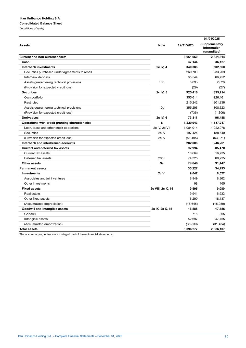 Itaú Unibanco Holding S.A. – Complete Financial Statements – December 31, 2025 Itaú Unibanco Holding S.A. Consolidated Balance Sheet 1 (In millions of reais) Assets Note 12/31/2025 01/01/2025 Supplementary information (unaudited) Current and non-current assets 3,061,050 2,851,314 Cash 37,144 36,127 Interbank investments 2c IV, 4 340,388 302,560 Securities purchased under agreements to resell 269,780 233,209 Interbank deposits 65,544 66,752 Assets guaranteeing technical provisions 10b 5,093 2,626 (Provision for expected credit loss) (29) (27) Securities 2c IV, 5 925,416 835,714 Own portfolio 355,614 226,461 Restricted 215,242 301,936 Assets guaranteeing technical provisions 10b 355,296 308,623 (Provision for expected credit loss) (736) (1,306) Derivatives 2c IV, 6 73,311 96,488 Operations with credit granting characteristics 8 1,229,943 1,157,247 Loan, lease and other credit operations 2c IV, 2c VII 1,084,014 1,022,078 Securities 2c IV 197,424 188,540 (Provision for expected credit loss) 2c IV (51,495) (53,371) Interbank and interbranch accounts 282,008 246,261 Current and deferred tax assets 92,994 85,470 Current tax assets 18,669 16,735 Deferred tax assets 20b I 74,325 68,735 Other assets 9a 79,846 91,447 Permanent assets 35,227 34,793 Investments 2c VI 9,047 8,527 Associates and joint ventures 8,949 8,362 Other investments 98 165 Fixed assets 2c VIII, 2c X, 14 9,595 9,080 Real estate 9,941 6,932 Other fixed assets 16,299 18,137 (Accumulated depreciation) (16,645) (15,989) Goodwill and Intangible assets 2c IX, 2c X, 15 16,585 17,186 Goodwill 718 865 Intangible assets 52,697 47,755 (Accumulated amortization) (36,830) (31,434) Total assets 3,096,277 2,886,107 The accompanying notes are an integral part of these financial statements. 50