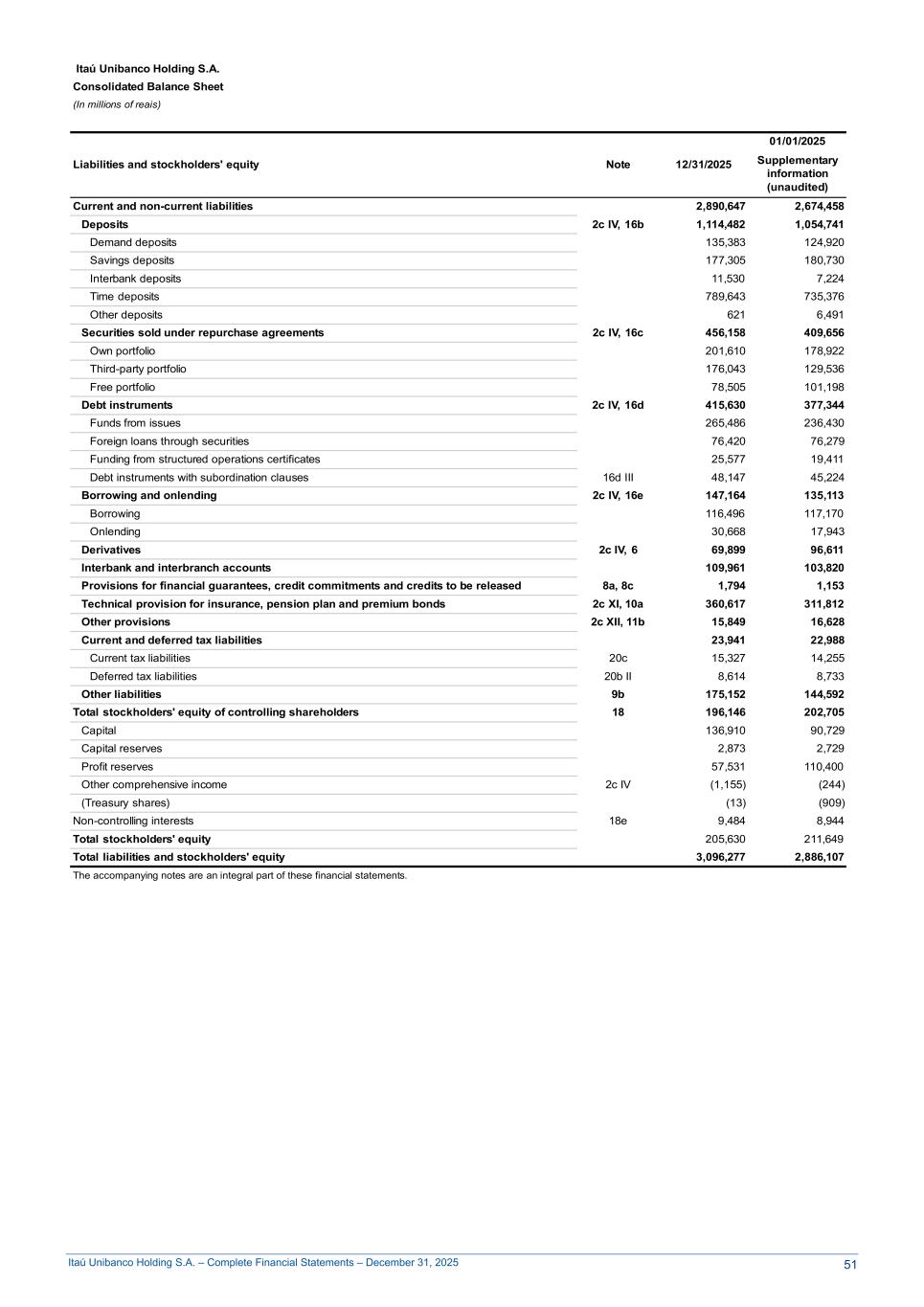 Itaú Unibanco Holding S.A. – Complete Financial Statements – December 31, 2025 Itaú Unibanco Holding S.A. Consolidated Balance Sheet 1 (In millions of reais) Liabilities and stockholders' equity Note 12/31/2025 01/01/2025 Supplementary information (unaudited) Current and non-current liabilities 2,890,647 2,674,458 Deposits 2c IV, 16b 1,114,482 1,054,741 Demand deposits 135,383 124,920 Savings deposits 177,305 180,730 Interbank deposits 11,530 7,224 Time deposits 789,643 735,376 Other deposits 621 6,491 Securities sold under repurchase agreements 2c IV, 16c 456,158 409,656 Own portfolio 201,610 178,922 Third-party portfolio 176,043 129,536 Free portfolio 78,505 101,198 Debt instruments 2c IV, 16d 415,630 377,344 Funds from issues 265,486 236,430 Foreign loans through securities 76,420 76,279 Funding from structured operations certificates 25,577 19,411 Debt instruments with subordination clauses 16d III 48,147 45,224 Borrowing and onlending 2c IV, 16e 147,164 135,113 Borrowing 116,496 117,170 Onlending 30,668 17,943 Derivatives 2c IV, 6 69,899 96,611 Interbank and interbranch accounts 109,961 103,820 Provisions for financial guarantees, credit commitments and credits to be released 8a, 8c 1,794 1,153 Technical provision for insurance, pension plan and premium bonds 2c XI, 10a 360,617 311,812 Other provisions 2c XII, 11b 15,849 16,628 Current and deferred tax liabilities 23,941 22,988 Current tax liabilities 20c 15,327 14,255 Deferred tax liabilities 20b II 8,614 8,733 Other liabilities 9b 175,152 144,592 Total stockholders' equity of controlling shareholders 18 196,146 202,705 Capital 136,910 90,729 Capital reserves 2,873 2,729 Profit reserves 57,531 110,400 Other comprehensive income 2c IV (1,155) (244) (Treasury shares) (13) (909) Non-controlling interests 18e 9,484 8,944 Total stockholders' equity 205,630 211,649 Total liabilities and stockholders' equity 3,096,277 2,886,107 The accompanying notes are an integral part of these financial statements. 51