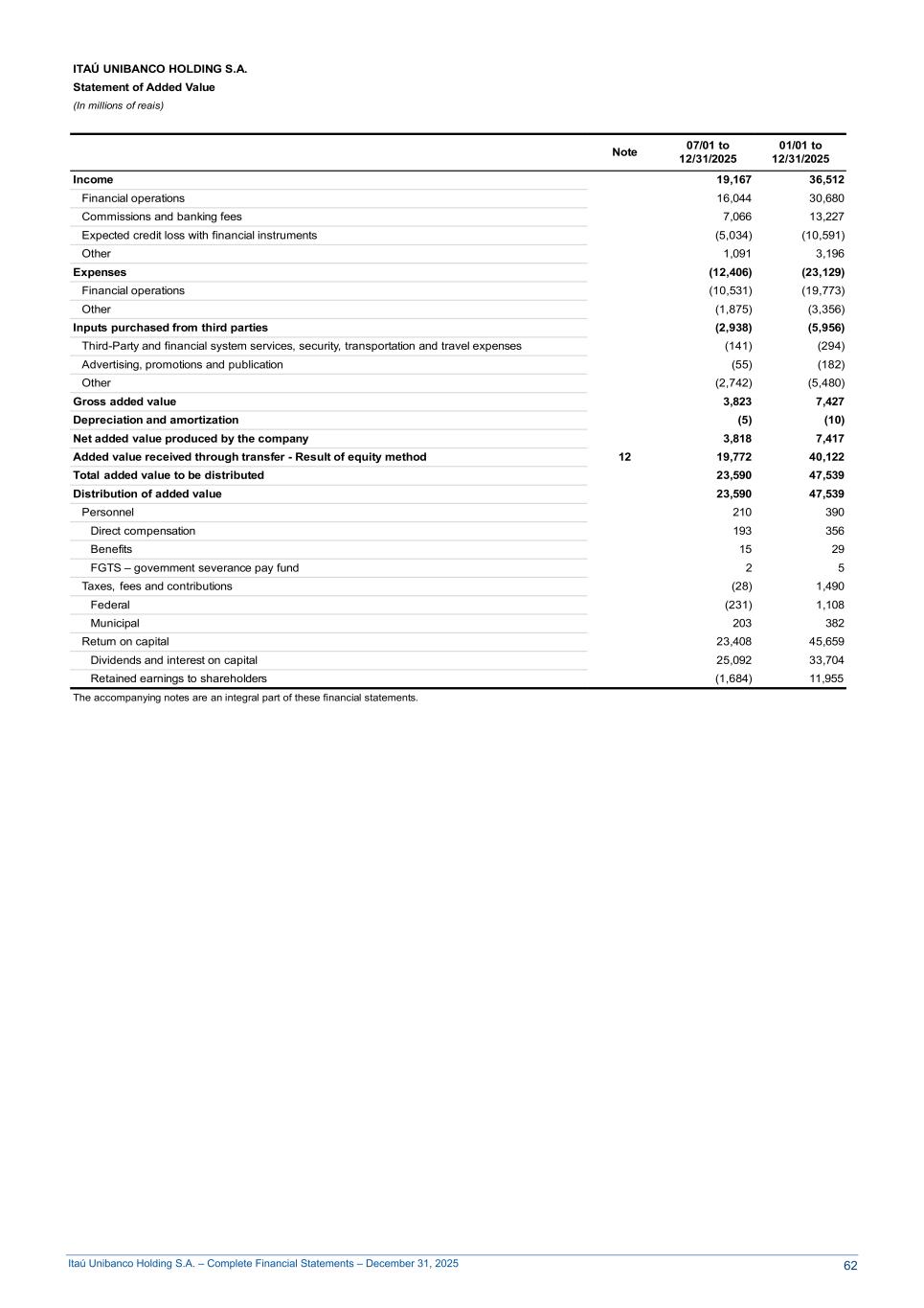 Itaú Unibanco Holding S.A. – Complete Financial Statements – December 31, 2025 ITAÚ UNIBANCO HOLDING S.A. Statement of Added Value (In millions of reais) Note 07/01 to 12/31/2025 01/01 to 12/31/2025 Income 19,167 36,512 Financial operations 16,044 30,680 Commissions and banking fees 7,066 13,227 Expected credit loss with financial instruments (5,034) (10,591) Other 1,091 3,196 Expenses (12,406) (23,129) Financial operations (10,531) (19,773) Other (1,875) (3,356) Inputs purchased from third parties (2,938) (5,956) Third-Party and financial system services, security, transportation and travel expenses (141) (294) Advertising, promotions and publication (55) (182) Other (2,742) (5,480) Gross added value 3,823 7,427 Depreciation and amortization (5) (10) Net added value produced by the company 3,818 7,417 Added value received through transfer - Result of equity method 12 19,772 40,122 Total added value to be distributed 23,590 47,539 Distribution of added value 23,590 47,539 Personnel 210 390 Direct compensation 193 356 Benefits 15 29 FGTS – government severance pay fund 2 5 Taxes, fees and contributions (28) 1,490 Federal (231) 1,108 Municipal 203 382 Return on capital 23,408 45,659 Dividends and interest on capital 25,092 33,704 Retained earnings to shareholders (1,684) 11,955 The accompanying notes are an integral part of these financial statements. 62