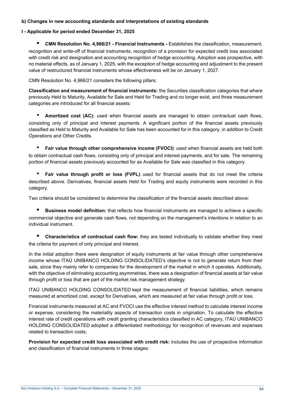 Itaú Unibanco Holding S.A. – Complete Financial Statements – December 31, 2025 b) Changes in new accounting standards and interpretations of existing standards I - Applicable for period ended December 31, 2025 • CMN Resolution No. 4,966/21 - Financial Instruments - Establishes the classification, measurement, recognition and write-off of financial instruments, recognition of a provision for expected credit loss associated with credit risk and designation and accounting recognition of hedge accounting. Adoption was prospective, with no material effects, as of January 1, 2025, with the exception of hedge accounting and adjustment to the present value of restructured financial instruments whose effectiveness will be on January 1, 2027. CMN Resolution No. 4,966/21 considers the following pillars: Classification and measurement of financial instruments: the Securities classification categories that where previously Held to Maturity, Available for Sale and Held for Trading and no longer exist, and three measurement categories are introduced for all financial assets: • Amortized cost (AC): used when financial assets are managed to obtain contractual cash flows, consisting only of principal and interest payments. A significant portion of the financial assets previously classified as Held to Maturity and Available for Sale has been accounted for in this category, in addition to Credit Operations and Other Credits. • Fair value through other comprehensive income (FVOCI): used when financial assets are held both to obtain contractual cash flows, consisting only of principal and interest payments, and for sale. The remaining portion of financial assets previously accounted for as Available for Sale was classified in this category. • Fair value through profit or loss (FVPL): used for financial assets that do not meet the criteria described above. Derivatives, financial assets Held for Trading and equity instruments were recorded in this category. Two criteria should be considered to determine the classification of the financial assets described above: • Business model definition: that reflects how financial instruments are managed to achieve a specific commercial objective and generate cash flows, not depending on the management’s intentions in relation to an individual instrument. • Characteristics of contractual cash flow: they are tested individually to validate whether they meet the criteria for payment of only principal and interest. In the initial adoption there were designation of equity instruments at fair value through other comprehensive income whose ITAÚ UNIBANCO HOLDING CONSOLIDATED’s objective is not to generate return from their sale, since they mainly refer to companies for the development of the market in which it operates. Additionally, with the objective of eliminating accounting asymmetries, there was a designation of financial assets at fair value through profit or loss that are part of the market risk management strategy. ITAÚ UNIBANCO HOLDING CONSOLIDATED kept the measurement of financial liabilities, which remains measured at amortized cost, except for Derivatives, which are measured at fair value through profit or loss. Financial instruments measured at AC and FVOCI use the effective interest method to calculate interest income or expense, considering the materiality aspects of transaction costs in origination. To calculate the effective interest rate of credit operations with credit granting characteristics classified in AC category, ITAÚ UNIBANCO HOLDING CONSOLIDATED adopted a differentiated methodology for recognition of revenues and expenses related to transaction costs. Provision for expected credit loss associated with credit risk: includes the use of prospective information and classification of financial instruments in three stages: 64
