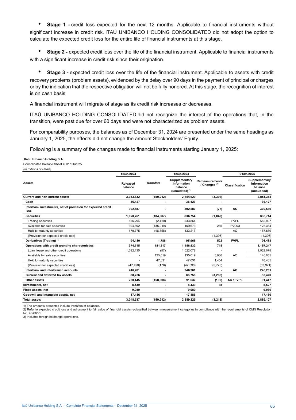 Itaú Unibanco Holding S.A. – Complete Financial Statements – December 31, 2025 • Stage 1 - credit loss expected for the next 12 months. Applicable to financial instruments without significant increase in credit risk. ITAÚ UNIBANCO HOLDING CONSOLIDATED did not adopt the option to calculate the expected credit loss for the entire life of financial instruments at this stage. • Stage 2 - expected credit loss over the life of the financial instrument. Applicable to financial instruments with a significant increase in credit risk since their origination. • Stage 3 - expected credit loss over the life of the financial instrument. Applicable to assets with credit recovery problems (problem assets), evidenced by the delay over 90 days in the payment of principal or charges or by the indication that the respective obligation will not be fully honored. At this stage, the recognition of interest is on cash basis. A financial instrument will migrate of stage as its credit risk increases or decreases. ITAÚ UNIBANCO HOLDING CONSOLIDATED did not recognize the interest of the operations that, in the transition, were past due for over 60 days and were not characterized as problem assets. For comparability purposes, the balances as of December 31, 2024 are presented under the same headings as January 1, 2025, the effects did not change the amount Stockholders’ Equity. Following is a summary of the changes made to financial instruments starting January 1, 2025: Itaú Unibanco Holding S.A. Consolidated Balance Sheet at 01/01/2025 (In millions of Reais) Assets 12/31/2024 Transfers 12/31/2024 Remeasurements / Changes (2) 01/01/2025 Released balance Supplementary information balance (unaudited) (1) Classification Supplementary information balance (unaudited) Current and non-current assets 3,013,832 (159,212) 2,854,620 (3,306) 2,851,314 Cash 36,127 - 36,127 - 36,127 Interbank investments, net of provision for expected credit loss 302,587 - 302,587 (27) AC 302,560 Securities 1,020,761 (184,007) 836,754 (1,040) 835,714 Trading securities 536,294 (2,430) 533,864 266 FVPL 553,997 Available for sale securities 304,692 (135,019) 169,673 FVOCI 125,384 Held to maturity securities 179,775 (46,558) 133,217 AC 157,639 (Provision for expected credit loss) - - - (1,306) (1,306) Derivatives (Trading) (3) 94,180 1,786 95,966 522 FVPL 96,488 Operations with credit granting characteristics 974,715 181,817 1,156,532 715 1,157,247 Loan, lease and other credit operations 1,022,135 (57) 1,022,078 - AC 1,022,078 Available for sale securities - 135,019 135,019 5,036 140,055 Held to maturity securities - 47,031 47,031 1,454 48,485 (Provision for expected credit loss) (47,420) (176) (47,596) (5,775) (53,371) Interbank and interbranch accounts 246,261 - 246,261 - AC 246,261 Current and deferred tax assets 88,756 - 88,756 (3,286) 85,470 Other assets 250,445 (158,808) 91,637 (190) AC / FVPL 91,447 Investments, net 8,439 - 8,439 88 8,527 Fixed assets, net 9,080 - 9,080 - 9,080 Goodwill and intangible assets, net 17,186 - 17,186 - 17,186 Total assets 3,048,537 (159,212) 2,889,325 (3,218) 2,886,107 1) The amounts presented include transfers of balances. 2) Refer to expected credit loss and adjustment to fair value of financial assets reclassified between measurement categories in compliance with the requirements of CMN Resolution No. 4,966/21. 3) Includes foreign exchange operations. 65