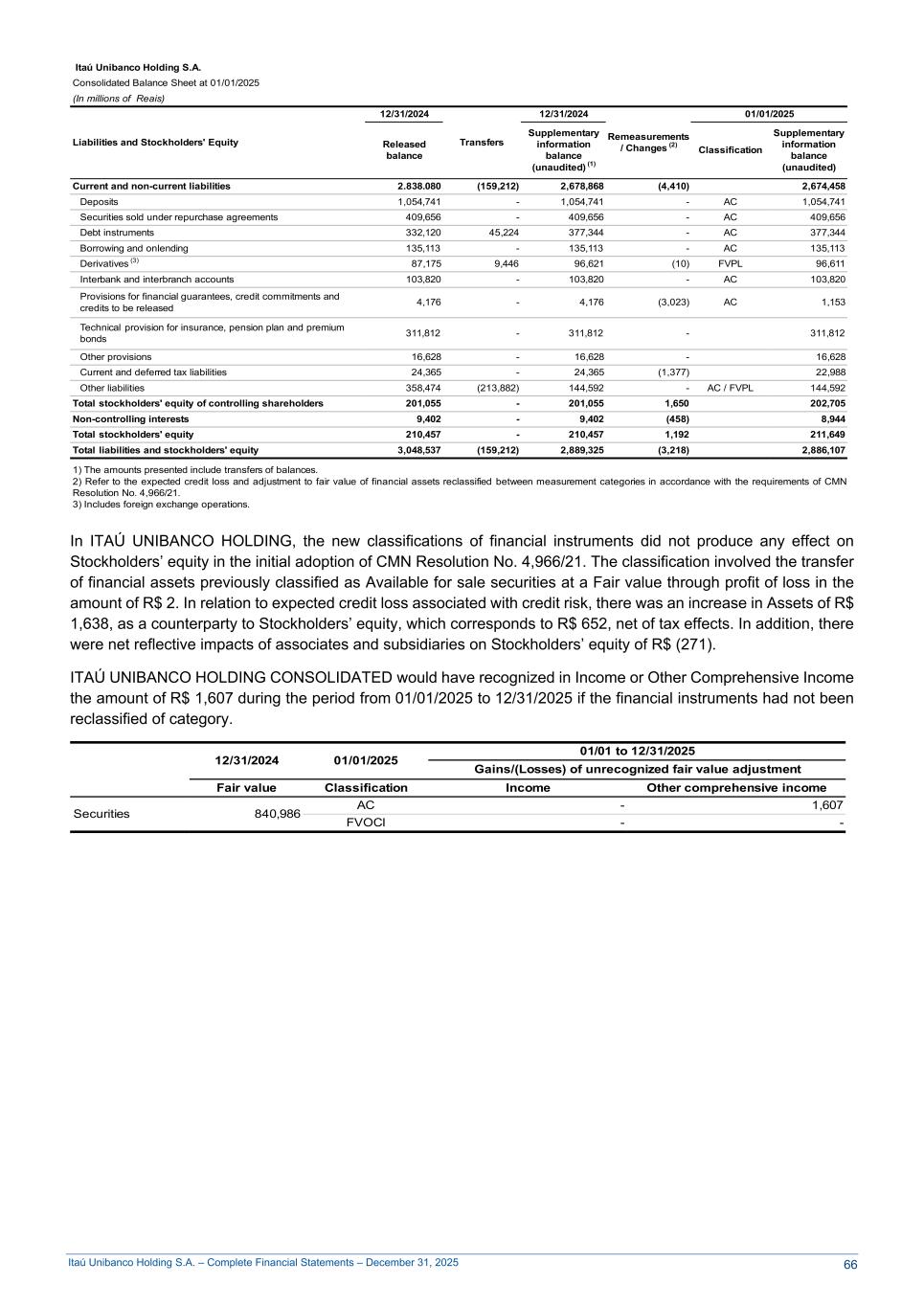 Itaú Unibanco Holding S.A. – Complete Financial Statements – December 31, 2025 Itaú Unibanco Holding S.A. Consolidated Balance Sheet at 01/01/2025 (In millions of Reais) Liabilities and Stockholders' Equity 12/31/2024 Transfers 12/31/2024 Remeasurements / Changes (2) 01/01/2025 Released balance Supplementary information balance (unaudited) (1) Classification Supplementary information balance (unaudited) Current and non-current liabilities 2.838.080 (159,212) 2,678,868 (4,410) 2,674,458 Deposits 1,054,741 - 1,054,741 - AC 1,054,741 Securities sold under repurchase agreements 409,656 - 409,656 - AC 409,656 Debt instruments 332,120 45,224 377,344 - AC 377,344 Borrowing and onlending 135,113 - 135,113 - AC 135,113 Derivatives (3) 87,175 9,446 96,621 (10) FVPL 96,611 Interbank and interbranch accounts 103,820 - 103,820 - AC 103,820 Provisions for financial guarantees, credit commitments and credits to be released 4,176 - 4,176 (3,023) AC 1,153 Technical provision for insurance, pension plan and premium bonds 311,812 - 311,812 - 311,812 Other provisions 16,628 - 16,628 - 16,628 Current and deferred tax liabilities 24,365 - 24,365 (1,377) 22,988 Other liabilities 358,474 (213,882) 144,592 - AC / FVPL 144,592 Total stockholders' equity of controlling shareholders 201,055 - 201,055 1,650 202,705 Non-controlling interests 9,402 - 9,402 (458) 8,944 Total stockholders' equity 210,457 - 210,457 1,192 211,649 Total liabilities and stockholders' equity 3,048,537 (159,212) 2,889,325 (3,218) 2,886,107 1) The amounts presented include transfers of balances. 2) Refer to the expected credit loss and adjustment to fair value of financial assets reclassified between measurement categories in accordance with the requirements of CMN Resolution No. 4,966/21. 3) Includes foreign exchange operations. In ITAÚ UNIBANCO HOLDING, the new classifications of financial instruments did not produce any effect on Stockholders’ equity in the initial adoption of CMN Resolution No. 4,966/21. The classification involved the transfer of financial assets previously classified as Available for sale securities at a Fair value through profit of loss in the amount of R$ 2. In relation to expected credit loss associated with credit risk, there was an increase in Assets of R$ 1,638, as a counterparty to Stockholders’ equity, which corresponds to R$ 652, net of tax effects. In addition, there were net reflective impacts of associates and subsidiaries on Stockholders’ equity of R$ (271). ITAÚ UNIBANCO HOLDING CONSOLIDATED would have recognized in Income or Other Comprehensive Income the amount of R$ 1,607 during the period from 01/01/2025 to 12/31/2025 if the financial instruments had not been reclassified of category. 12/31/2024 01/01/2025 01/01 to 12/31/2025 Gains/(Losses) of unrecognized fair value adjustment Fair value Classification Income Other comprehensive income Securities 840,986 AC - 1,607 FVOCI - - 66