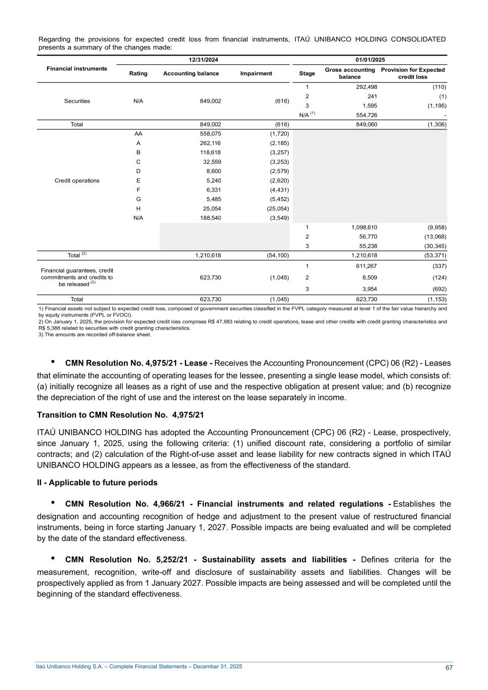 Itaú Unibanco Holding S.A. – Complete Financial Statements – December 31, 2025 Regarding the provisions for expected credit loss from financial instruments, ITAÚ UNIBANCO HOLDING CONSOLIDATED presents a summary of the changes made: Financial instruments 12/31/2024 01/01/2025 Rating Accounting balance Impairment Stage Gross accounting balance Provision for Expected credit loss Securities N/A 849,002 (616) 1 292,498 (110) 2 241 (1) 3 1,595 (1,195) N/A (1) 554,726 - Total 849,002 (616) 849,060 (1,306) AA 558,075 (1,720) A 262,116 (2,185) B 118,618 (3,257) C 32,559 (3,253) Credit operations D 8,600 (2,579) E 5,240 (2,620) F 6,331 (4,431) G 5,485 (5,452) H 25,054 (25,054) N/A 188,540 (3,549) 1 1,098,610 (9,958) 2 56,770 (13,068) 3 55,238 (30,345) Total (2) 1,210,618 (54,100) 1,210,618 (53,371) Financial guarantees, credit commitments and credits to be released (3) 1 611,267 (337) 623,730 (1,045) 2 8,509 (124) 3 3,954 (692) Total 623,730 (1,045) 623,730 (1,153) 1) Financial assets not subject to expected credit loss, composed of government securities classified in the FVPL category measured at level 1 of the fair value hierarchy and by equity instruments (FVPL or FVOCI). 2) On January 1, 2025, the provision for expected credit loss comprises R$ 47,983 relating to credit operations, lease and other credits with credit granting characteristics and R$ 5,388 related to securities with credit granting characteristics. 3) The amounts are recorded off-balance sheet. • CMN Resolution No. 4,975/21 - Lease - Receives the Accounting Pronouncement (CPC) 06 (R2) - Leases that eliminate the accounting of operating leases for the lessee, presenting a single lease model, which consists of: (a) initially recognize all leases as a right of use and the respective obligation at present value; and (b) recognize the depreciation of the right of use and the interest on the lease separately in income. Transition to CMN Resolution No. 4,975/21 ITAÚ UNIBANCO HOLDING has adopted the Accounting Pronouncement (CPC) 06 (R2) - Lease, prospectively, since January 1, 2025, using the following criteria: (1) unified discount rate, considering a portfolio of similar contracts; and (2) calculation of the Right-of-use asset and lease liability for new contracts signed in which ITAÚ UNIBANCO HOLDING appears as a lessee, as from the effectiveness of the standard. II - Applicable to future periods • CMN Resolution No. 4,966/21 - Financial instruments and related regulations - Establishes the designation and accounting recognition of hedge and adjustment to the present value of restructured financial instruments, being in force starting January 1, 2027. Possible impacts are being evaluated and will be completed by the date of the standard effectiveness. • CMN Resolution No. 5,252/21 - Sustainability assets and liabilities - Defines criteria for the measurement, recognition, write-off and disclosure of sustainability assets and liabilities. Changes will be prospectively applied as from 1 January 2027. Possible impacts are being assessed and will be completed until the beginning of the standard effectiveness. 67