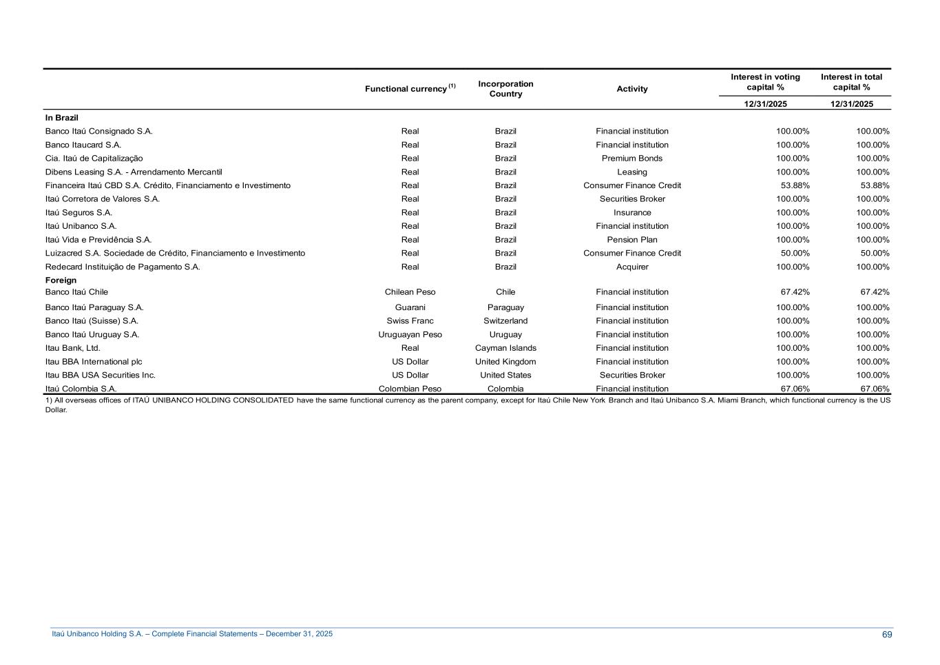 Itaú Unibanco Holding S.A. – Complete Financial Statements – December 31, 2025 Functional currency (1) Incorporation Country Activity Interest in voting capital % Interest in total capital % 12/31/2025 12/31/2025 In Brazil Banco Itaú Consignado S.A. Real Brazil Financial institution 100.00% 100.00% Banco Itaucard S.A. Real Brazil Financial institution 100.00% 100.00% Cia. Itaú de Capitalização Real Brazil Premium Bonds 100.00% 100.00% Dibens Leasing S.A. - Arrendamento Mercantil Real Brazil Leasing 100.00% 100.00% Financeira Itaú CBD S.A. Crédito, Financiamento e Investimento Real Brazil Consumer Finance Credit 53.88% 53.88% Itaú Corretora de Valores S.A. Real Brazil Securities Broker 100.00% 100.00% Itaú Seguros S.A. Real Brazil Insurance 100.00% 100.00% Itaú Unibanco S.A. Real Brazil Financial institution 100.00% 100.00% Itaú Vida e Previdência S.A. Real Brazil Pension Plan 100.00% 100.00% Luizacred S.A. Sociedade de Crédito, Financiamento e Investimento Real Brazil Consumer Finance Credit 50.00% 50.00% Redecard Instituição de Pagamento S.A. Real Brazil Acquirer 100.00% 100.00% Foreign Banco Itaú Chile Chilean Peso Chile Financial institution 67.42% 67.42% Banco Itaú Paraguay S.A. Guarani Paraguay Financial institution 100.00% 100.00% Banco Itaú (Suisse) S.A. Swiss Franc Switzerland Financial institution 100.00% 100.00% Banco Itaú Uruguay S.A. Uruguayan Peso Uruguay Financial institution 100.00% 100.00% Itau Bank, Ltd. Real Cayman Islands Financial institution 100.00% 100.00% Itau BBA International plc US Dollar United Kingdom Financial institution 100.00% 100.00% Itau BBA USA Securities Inc. US Dollar United States Securities Broker 100.00% 100.00% Itaú Colombia S.A. Colombian Peso Colombia Financial institution 67.06% 67.06% 1) All overseas offices of ITAÚ UNIBANCO HOLDING CONSOLIDATED have the same functional currency as the parent company, except for Itaú Chile New York Branch and Itaú Unibanco S.A. Miami Branch, which functional currency is the US Dollar. 69