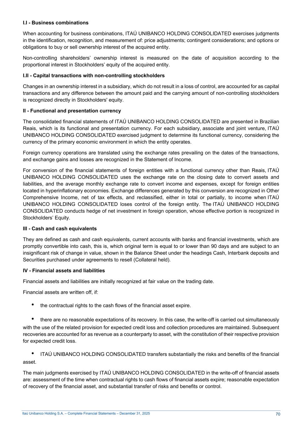 Itaú Unibanco Holding S.A. – Complete Financial Statements – December 31, 2025 I.I - Business combinations When accounting for business combinations, ITAÚ UNIBANCO HOLDING CONSOLIDATED exercises judgments in the identification, recognition, and measurement of: price adjustments; contingent considerations; and options or obligations to buy or sell ownership interest of the acquired entity. Non-controlling shareholders’ ownership interest is measured on the date of acquisition according to the proportional interest in Stockholders’ equity of the acquired entity. I.II - Capital transactions with non-controlling stockholders Changes in an ownership interest in a subsidiary, which do not result in a loss of control, are accounted for as capital transactions and any difference between the amount paid and the carrying amount of non-controlling stockholders is recognized directly in Stockholders' equity. II - Functional and presentation currency The consolidated financial statements of ITAÚ UNIBANCO HOLDING CONSOLIDATED are presented in Brazilian Reais, which is its functional and presentation currency. For each subsidiary, associate and joint venture, ITAÚ UNIBANCO HOLDING CONSOLIDATED exercised judgment to determine its functional currency, considering the currency of the primary economic environment in which the entity operates. Foreign currency operations are translated using the exchange rates prevailing on the dates of the transactions, and exchange gains and losses are recognized in the Statement of Income. For conversion of the financial statements of foreign entities with a functional currency other than Reais, ITAÚ UNIBANCO HOLDING CONSOLIDATED uses the exchange rate on the closing date to convert assets and liabilities, and the average monthly exchange rate to convert income and expenses, except for foreign entities located in hyperinflationary economies. Exchange differences generated by this conversion are recognized in Other Comprehensive Income, net of tax effects, and reclassified, either in total or partially, to income when ITAÚ UNIBANCO HOLDING CONSOLIDATED loses control of the foreign entity. The ITAÚ UNIBANCO HOLDING CONSOLIDATED conducts hedge of net investment in foreign operation, whose effective portion is recognized in Stockholders’ Equity. III - Cash and cash equivalents They are defined as cash and cash equivalents, current accounts with banks and financial investments, which are promptly convertible into cash, this is, which original term is equal to or lower than 90 days and are subject to an insignificant risk of change in value, shown in the Balance Sheet under the headings Cash, Interbank deposits and Securities purchased under agreements to resell (Collateral held). IV - Financial assets and liabilities Financial assets and liabilities are initially recognized at fair value on the trading date. Financial assets are written off, if: • the contractual rights to the cash flows of the financial asset expire. • there are no reasonable expectations of its recovery. In this case, the write-off is carried out simultaneously with the use of the related provision for expected credit loss and collection procedures are maintained. Subsequent recoveries are accounted for as revenue as a counterparty to asset, with the constitution of their respective provision for expected credit loss. • ITAÚ UNIBANCO HOLDING CONSOLIDATED transfers substantially the risks and benefits of the financial asset. The main judgments exercised by ITAÚ UNIBANCO HOLDING CONSOLIDATED in the write-off of financial assets are: assessment of the time when contractual rights to cash flows of financial assets expire; reasonable expectation of recovery of the financial asset, and substantial transfer of risks and benefits or control. 70