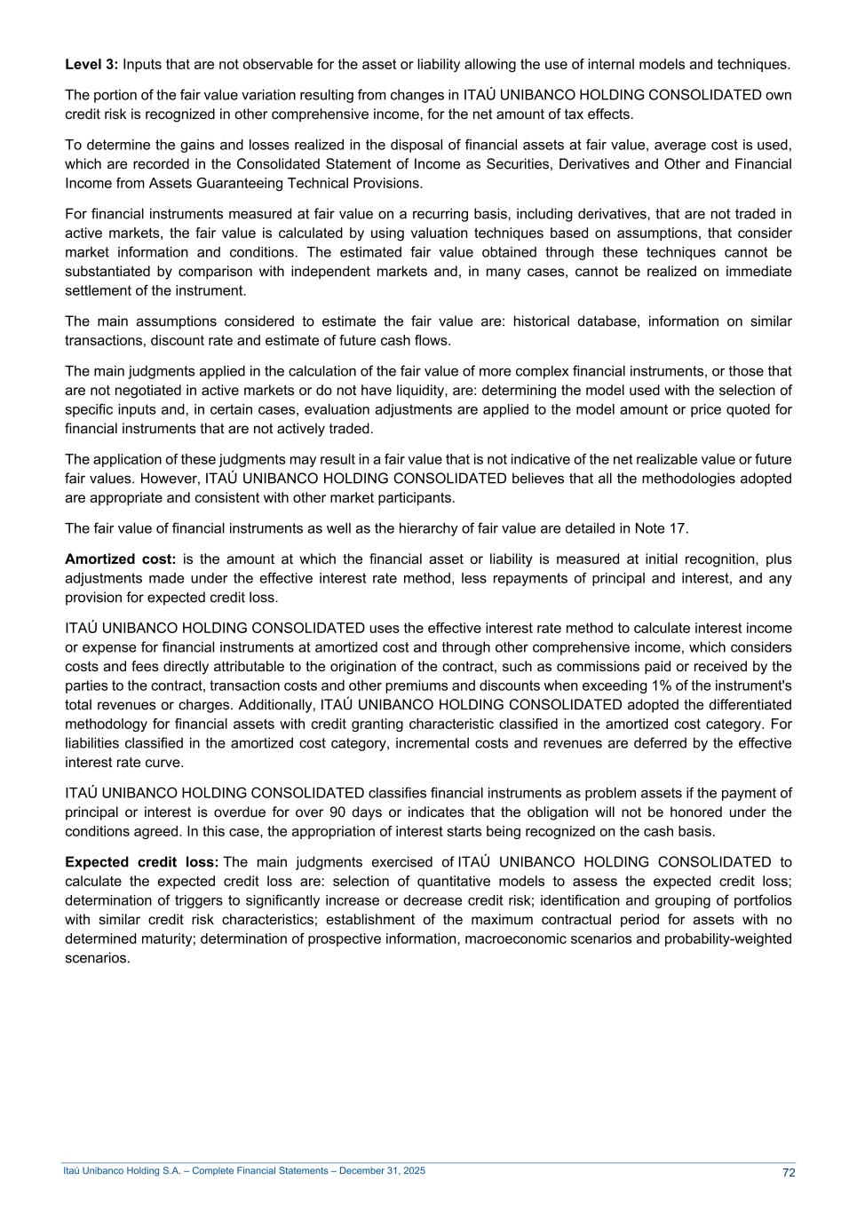 Itaú Unibanco Holding S.A. – Complete Financial Statements – December 31, 2025 Level 3: Inputs that are not observable for the asset or liability allowing the use of internal models and techniques. The portion of the fair value variation resulting from changes in ITAÚ UNIBANCO HOLDING CONSOLIDATED own credit risk is recognized in other comprehensive income, for the net amount of tax effects. To determine the gains and losses realized in the disposal of financial assets at fair value, average cost is used, which are recorded in the Consolidated Statement of Income as Securities, Derivatives and Other and Financial Income from Assets Guaranteeing Technical Provisions. For financial instruments measured at fair value on a recurring basis, including derivatives, that are not traded in active markets, the fair value is calculated by using valuation techniques based on assumptions, that consider market information and conditions. The estimated fair value obtained through these techniques cannot be substantiated by comparison with independent markets and, in many cases, cannot be realized on immediate settlement of the instrument. The main assumptions considered to estimate the fair value are: historical database, information on similar transactions, discount rate and estimate of future cash flows. The main judgments applied in the calculation of the fair value of more complex financial instruments, or those that are not negotiated in active markets or do not have liquidity, are: determining the model used with the selection of specific inputs and, in certain cases, evaluation adjustments are applied to the model amount or price quoted for financial instruments that are not actively traded. The application of these judgments may result in a fair value that is not indicative of the net realizable value or future fair values. However, ITAÚ UNIBANCO HOLDING CONSOLIDATED believes that all the methodologies adopted are appropriate and consistent with other market participants. The fair value of financial instruments as well as the hierarchy of fair value are detailed in Note 17. Amortized cost: is the amount at which the financial asset or liability is measured at initial recognition, plus adjustments made under the effective interest rate method, less repayments of principal and interest, and any provision for expected credit loss. ITAÚ UNIBANCO HOLDING CONSOLIDATED uses the effective interest rate method to calculate interest income or expense for financial instruments at amortized cost and through other comprehensive income, which considers costs and fees directly attributable to the origination of the contract, such as commissions paid or received by the parties to the contract, transaction costs and other premiums and discounts when exceeding 1% of the instrument's total revenues or charges. Additionally, ITAÚ UNIBANCO HOLDING CONSOLIDATED adopted the differentiated methodology for financial assets with credit granting characteristic classified in the amortized cost category. For liabilities classified in the amortized cost category, incremental costs and revenues are deferred by the effective interest rate curve. ITAÚ UNIBANCO HOLDING CONSOLIDATED classifies financial instruments as problem assets if the payment of principal or interest is overdue for over 90 days or indicates that the obligation will not be honored under the conditions agreed. In this case, the appropriation of interest starts being recognized on the cash basis. Expected credit loss: The main judgments exercised of ITAÚ UNIBANCO HOLDING CONSOLIDATED to calculate the expected credit loss are: selection of quantitative models to assess the expected credit loss; determination of triggers to significantly increase or decrease credit risk; identification and grouping of portfolios with similar credit risk characteristics; establishment of the maximum contractual period for assets with no determined maturity; determination of prospective information, macroeconomic scenarios and probability-weighted scenarios. 72