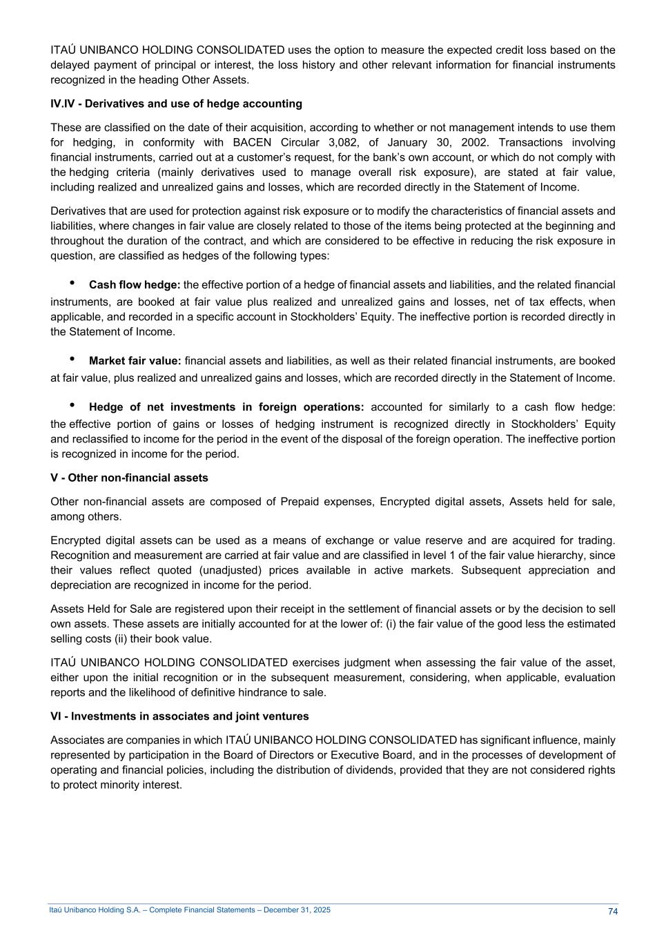 Itaú Unibanco Holding S.A. – Complete Financial Statements – December 31, 2025 ITAÚ UNIBANCO HOLDING CONSOLIDATED uses the option to measure the expected credit loss based on the delayed payment of principal or interest, the loss history and other relevant information for financial instruments recognized in the heading Other Assets. IV.IV - Derivatives and use of hedge accounting These are classified on the date of their acquisition, according to whether or not management intends to use them for hedging, in conformity with BACEN Circular 3,082, of January 30, 2002. Transactions involving financial instruments, carried out at a customer’s request, for the bank’s own account, or which do not comply with the hedging criteria (mainly derivatives used to manage overall risk exposure), are stated at fair value, including realized and unrealized gains and losses, which are recorded directly in the Statement of Income. Derivatives that are used for protection against risk exposure or to modify the characteristics of financial assets and liabilities, where changes in fair value are closely related to those of the items being protected at the beginning and throughout the duration of the contract, and which are considered to be effective in reducing the risk exposure in question, are classified as hedges of the following types: • Cash flow hedge: the effective portion of a hedge of financial assets and liabilities, and the related financial instruments, are booked at fair value plus realized and unrealized gains and losses, net of tax effects, when applicable, and recorded in a specific account in Stockholders’ Equity. The ineffective portion is recorded directly in the Statement of Income. • Market fair value: financial assets and liabilities, as well as their related financial instruments, are booked at fair value, plus realized and unrealized gains and losses, which are recorded directly in the Statement of Income. • Hedge of net investments in foreign operations: accounted for similarly to a cash flow hedge: the effective portion of gains or losses of hedging instrument is recognized directly in Stockholders’ Equity and reclassified to income for the period in the event of the disposal of the foreign operation. The ineffective portion is recognized in income for the period. V - Other non-financial assets Other non-financial assets are composed of Prepaid expenses, Encrypted digital assets, Assets held for sale, among others. Encrypted digital assets can be used as a means of exchange or value reserve and are acquired for trading. Recognition and measurement are carried at fair value and are classified in level 1 of the fair value hierarchy, since their values reflect quoted (unadjusted) prices available in active markets. Subsequent appreciation and depreciation are recognized in income for the period. Assets Held for Sale are registered upon their receipt in the settlement of financial assets or by the decision to sell own assets. These assets are initially accounted for at the lower of: (i) the fair value of the good less the estimated selling costs (ii) their book value. ITAÚ UNIBANCO HOLDING CONSOLIDATED exercises judgment when assessing the fair value of the asset, either upon the initial recognition or in the subsequent measurement, considering, when applicable, evaluation reports and the likelihood of definitive hindrance to sale. VI - Investments in associates and joint ventures Associates are companies in which ITAÚ UNIBANCO HOLDING CONSOLIDATED has significant influence, mainly represented by participation in the Board of Directors or Executive Board, and in the processes of development of operating and financial policies, including the distribution of dividends, provided that they are not considered rights to protect minority interest. 74