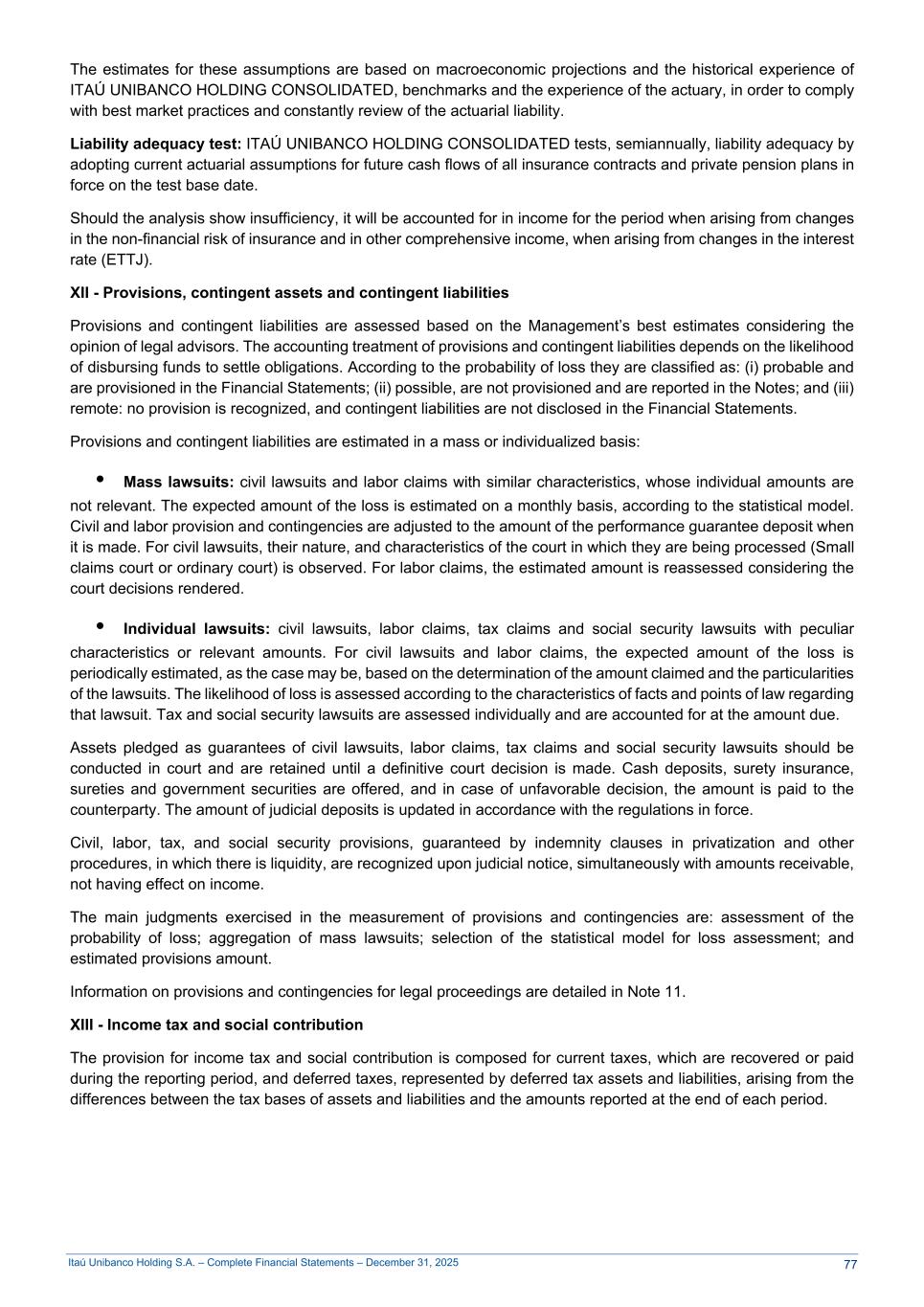 Itaú Unibanco Holding S.A. – Complete Financial Statements – December 31, 2025 The estimates for these assumptions are based on macroeconomic projections and the historical experience of ITAÚ UNIBANCO HOLDING CONSOLIDATED, benchmarks and the experience of the actuary, in order to comply with best market practices and constantly review of the actuarial liability. Liability adequacy test: ITAÚ UNIBANCO HOLDING CONSOLIDATED tests, semiannually, liability adequacy by adopting current actuarial assumptions for future cash flows of all insurance contracts and private pension plans in force on the test base date. Should the analysis show insufficiency, it will be accounted for in income for the period when arising from changes in the non-financial risk of insurance and in other comprehensive income, when arising from changes in the interest rate (ETTJ). XII - Provisions, contingent assets and contingent liabilities Provisions and contingent liabilities are assessed based on the Management’s best estimates considering the opinion of legal advisors. The accounting treatment of provisions and contingent liabilities depends on the likelihood of disbursing funds to settle obligations. According to the probability of loss they are classified as: (i) probable and are provisioned in the Financial Statements; (ii) possible, are not provisioned and are reported in the Notes; and (iii) remote: no provision is recognized, and contingent liabilities are not disclosed in the Financial Statements. Provisions and contingent liabilities are estimated in a mass or individualized basis: • Mass lawsuits: civil lawsuits and labor claims with similar characteristics, whose individual amounts are not relevant. The expected amount of the loss is estimated on a monthly basis, according to the statistical model. Civil and labor provision and contingencies are adjusted to the amount of the performance guarantee deposit when it is made. For civil lawsuits, their nature, and characteristics of the court in which they are being processed (Small claims court or ordinary court) is observed. For labor claims, the estimated amount is reassessed considering the court decisions rendered. • Individual lawsuits: civil lawsuits, labor claims, tax claims and social security lawsuits with peculiar characteristics or relevant amounts. For civil lawsuits and labor claims, the expected amount of the loss is periodically estimated, as the case may be, based on the determination of the amount claimed and the particularities of the lawsuits. The likelihood of loss is assessed according to the characteristics of facts and points of law regarding that lawsuit. Tax and social security lawsuits are assessed individually and are accounted for at the amount due. Assets pledged as guarantees of civil lawsuits, labor claims, tax claims and social security lawsuits should be conducted in court and are retained until a definitive court decision is made. Cash deposits, surety insurance, sureties and government securities are offered, and in case of unfavorable decision, the amount is paid to the counterparty. The amount of judicial deposits is updated in accordance with the regulations in force. Civil, labor, tax, and social security provisions, guaranteed by indemnity clauses in privatization and other procedures, in which there is liquidity, are recognized upon judicial notice, simultaneously with amounts receivable, not having effect on income. The main judgments exercised in the measurement of provisions and contingencies are: assessment of the probability of loss; aggregation of mass lawsuits; selection of the statistical model for loss assessment; and estimated provisions amount. Information on provisions and contingencies for legal proceedings are detailed in Note 11. XIII - Income tax and social contribution The provision for income tax and social contribution is composed for current taxes, which are recovered or paid during the reporting period, and deferred taxes, represented by deferred tax assets and liabilities, arising from the differences between the tax bases of assets and liabilities and the amounts reported at the end of each period. 77