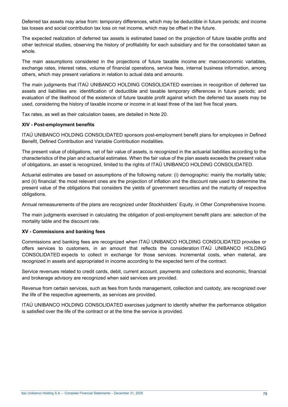 Itaú Unibanco Holding S.A. – Complete Financial Statements – December 31, 2025 Deferred tax assets may arise from: temporary differences, which may be deductible in future periods; and income tax losses and social contribution tax loss on net income, which may be offset in the future. The expected realization of deferred tax assets is estimated based on the projection of future taxable profits and other technical studies, observing the history of profitability for each subsidiary and for the consolidated taken as whole. The main assumptions considered in the projections of future taxable income are: macroeconomic variables, exchange rates, interest rates, volume of financial operations, service fees, internal business information, among others, which may present variations in relation to actual data and amounts. The main judgments that ITAÚ UNIBANCO HOLDING CONSOLIDATED exercises in recognition of deferred tax assets and liabilities are: identification of deductible and taxable temporary differences in future periods; and evaluation of the likelihood of the existence of future taxable profit against which the deferred tax assets may be used, considering the history of taxable income or income in at least three of the last five fiscal years. Tax rates, as well as their calculation bases, are detailed in Note 20. XIV - Post-employment benefits ITAÚ UNIBANCO HOLDING CONSOLIDATED sponsors post-employment benefit plans for employees in Defined Benefit, Defined Contribution and Variable Contribution modalities. The present value of obligations, net of fair value of assets, is recognized in the actuarial liabilities according to the characteristics of the plan and actuarial estimates. When the fair value of the plan assets exceeds the present value of obligations, an asset is recognized, limited to the rights of ITAÚ UNIBANCO HOLDING CONSOLIDATED. Actuarial estimates are based on assumptions of the following nature: (i) demographic: mainly the mortality table; and (ii) financial: the most relevant ones are the projection of inflation and the discount rate used to determine the present value of the obligations that considers the yields of government securities and the maturity of respective obligations. Annual remeasurements of the plans are recognized under Stockholders’ Equity, in Other Comprehensive Income. The main judgments exercised in calculating the obligation of post-employment benefit plans are: selection of the mortality table and the discount rate. XV - Commissions and banking fees Commissions and banking fees are recognized when ITAÚ UNIBANCO HOLDING CONSOLIDATED provides or offers services to customers, in an amount that reflects the consideration ITAÚ UNIBANCO HOLDING CONSOLIDATED expects to collect in exchange for those services. Incremental costs, when material, are recognized in assets and appropriated in income according to the expected term of the contract. Service revenues related to credit cards, debit, current account, payments and collections and economic, financial and brokerage advisory are recognized when said services are provided. Revenue from certain services, such as fees from funds management, collection and custody, are recognized over the life of the respective agreements, as services are provided. ITAÚ UNIBANCO HOLDING CONSOLIDATED exercises judgment to identify whether the performance obligation is satisfied over the life of the contract or at the time the service is provided. 78