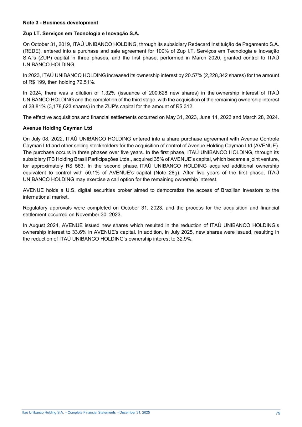 Itaú Unibanco Holding S.A. – Complete Financial Statements – December 31, 2025 Note 3 - Business development Zup I.T. Serviços em Tecnologia e Inovação S.A. On October 31, 2019, ITAÚ UNIBANCO HOLDING, through its subsidiary Redecard Instituição de Pagamento S.A. (REDE), entered into a purchase and sale agreement for 100% of Zup I.T. Serviços em Tecnologia e Inovação S.A.'s (ZUP) capital in three phases, and the first phase, performed in March 2020, granted control to ITAÚ UNIBANCO HOLDING. In 2023, ITAÚ UNIBANCO HOLDING increased its ownership interest by 20.57% (2,228,342 shares) for the amount of R$ 199, then holding 72.51%. In 2024, there was a dilution of 1.32% (issuance of 200,628 new shares) in the ownership interest of ITAÚ UNIBANCO HOLDING and the completion of the third stage, with the acquisition of the remaining ownership interest of 28.81% (3,178,623 shares) in the ZUP's capital for the amount of R$ 312. The effective acquisitions and financial settlements occurred on May 31, 2023, June 14, 2023 and March 28, 2024. Avenue Holding Cayman Ltd On July 08, 2022, ITAÚ UNIBANCO HOLDING entered into a share purchase agreement with Avenue Controle Cayman Ltd and other selling stockholders for the acquisition of control of Avenue Holding Cayman Ltd (AVENUE). The purchase occurs in three phases over five years. In the first phase, ITAÚ UNIBANCO HOLDING, through its subsidiary ITB Holding Brasil Participações Ltda., acquired 35% of AVENUE’s capital, which became a joint venture, for approximately R$ 563. In the second phase, ITAÚ UNIBANCO HOLDING acquired additional ownership equivalent to control with 50.1% of AVENUE’s capital (Note 28g). After five years of the first phase, ITAÚ UNIBANCO HOLDING may exercise a call option for the remaining ownership interest. AVENUE holds a U.S. digital securities broker aimed to democratize the access of Brazilian investors to the international market. Regulatory approvals were completed on October 31, 2023, and the process for the acquisition and financial settlement occurred on November 30, 2023. In August 2024, AVENUE issued new shares which resulted in the reduction of ITAÚ UNIBANCO HOLDING’s ownership interest to 33.6% in AVENUE’s capital. In addition, in July 2025, new shares were issued, resulting in the reduction of ITAÚ UNIBANCO HOLDING’s ownership interest to 32.9%. 79