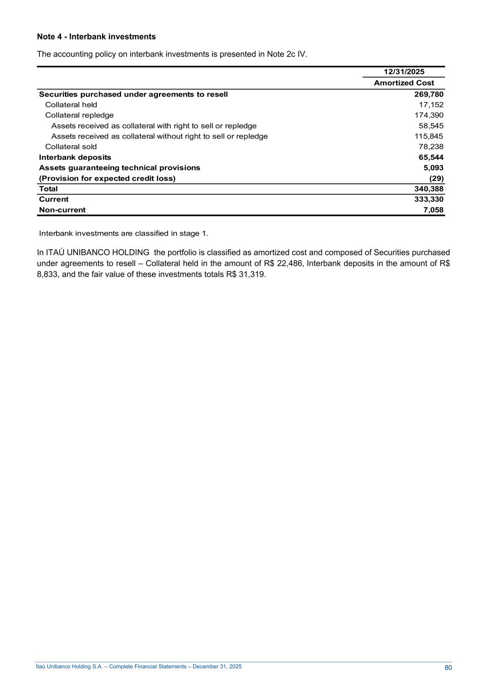 Itaú Unibanco Holding S.A. – Complete Financial Statements – December 31, 2025 Note 4 - Interbank investments The accounting policy on interbank investments is presented in Note 2c IV. 12/31/2025 Amortized Cost Securities purchased under agreements to resell 269,780 Collateral held 17,152 Collateral repledge 174,390 Assets received as collateral with right to sell or repledge 58,545 Assets received as collateral without right to sell or repledge 115,845 Collateral sold 78,238 Interbank deposits 65,544 Assets guaranteeing technical provisions 5,093 (Provision for expected credit loss) (29) Total 340,388 Current 333,330 Non-current 7,058 Interbank investments are classified in stage 1. In ITAÚ UNIBANCO HOLDING the portfolio is classified as amortized cost and composed of Securities purchased under agreements to resell – Collateral held in the amount of R$ 22,486, Interbank deposits in the amount of R$ 8,833, and the fair value of these investments totals R$ 31,319. 80