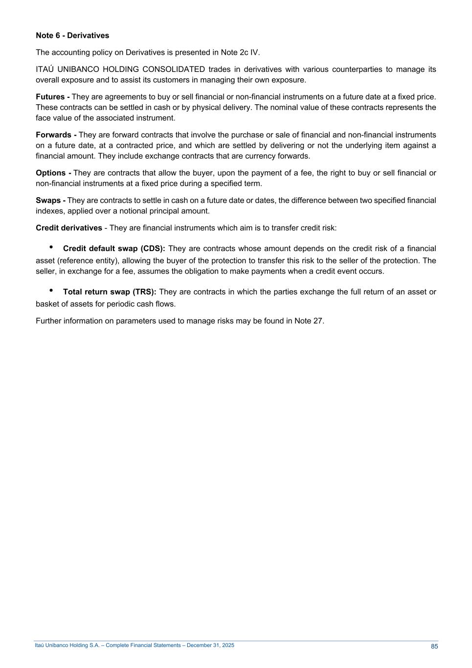Itaú Unibanco Holding S.A. – Complete Financial Statements – December 31, 2025 Note 6 - Derivatives The accounting policy on Derivatives is presented in Note 2c IV. ITAÚ UNIBANCO HOLDING CONSOLIDATED trades in derivatives with various counterparties to manage its overall exposure and to assist its customers in managing their own exposure. Futures - They are agreements to buy or sell financial or non-financial instruments on a future date at a fixed price. These contracts can be settled in cash or by physical delivery. The nominal value of these contracts represents the face value of the associated instrument. Forwards - They are forward contracts that involve the purchase or sale of financial and non-financial instruments on a future date, at a contracted price, and which are settled by delivering or not the underlying item against a financial amount. They include exchange contracts that are currency forwards. Options - They are contracts that allow the buyer, upon the payment of a fee, the right to buy or sell financial or non-financial instruments at a fixed price during a specified term. Swaps - They are contracts to settle in cash on a future date or dates, the difference between two specified financial indexes, applied over a notional principal amount. Credit derivatives - They are financial instruments which aim is to transfer credit risk: • Credit default swap (CDS): They are contracts whose amount depends on the credit risk of a financial asset (reference entity), allowing the buyer of the protection to transfer this risk to the seller of the protection. The seller, in exchange for a fee, assumes the obligation to make payments when a credit event occurs. • Total return swap (TRS): They are contracts in which the parties exchange the full return of an asset or basket of assets for periodic cash flows. Further information on parameters used to manage risks may be found in Note 27. 85